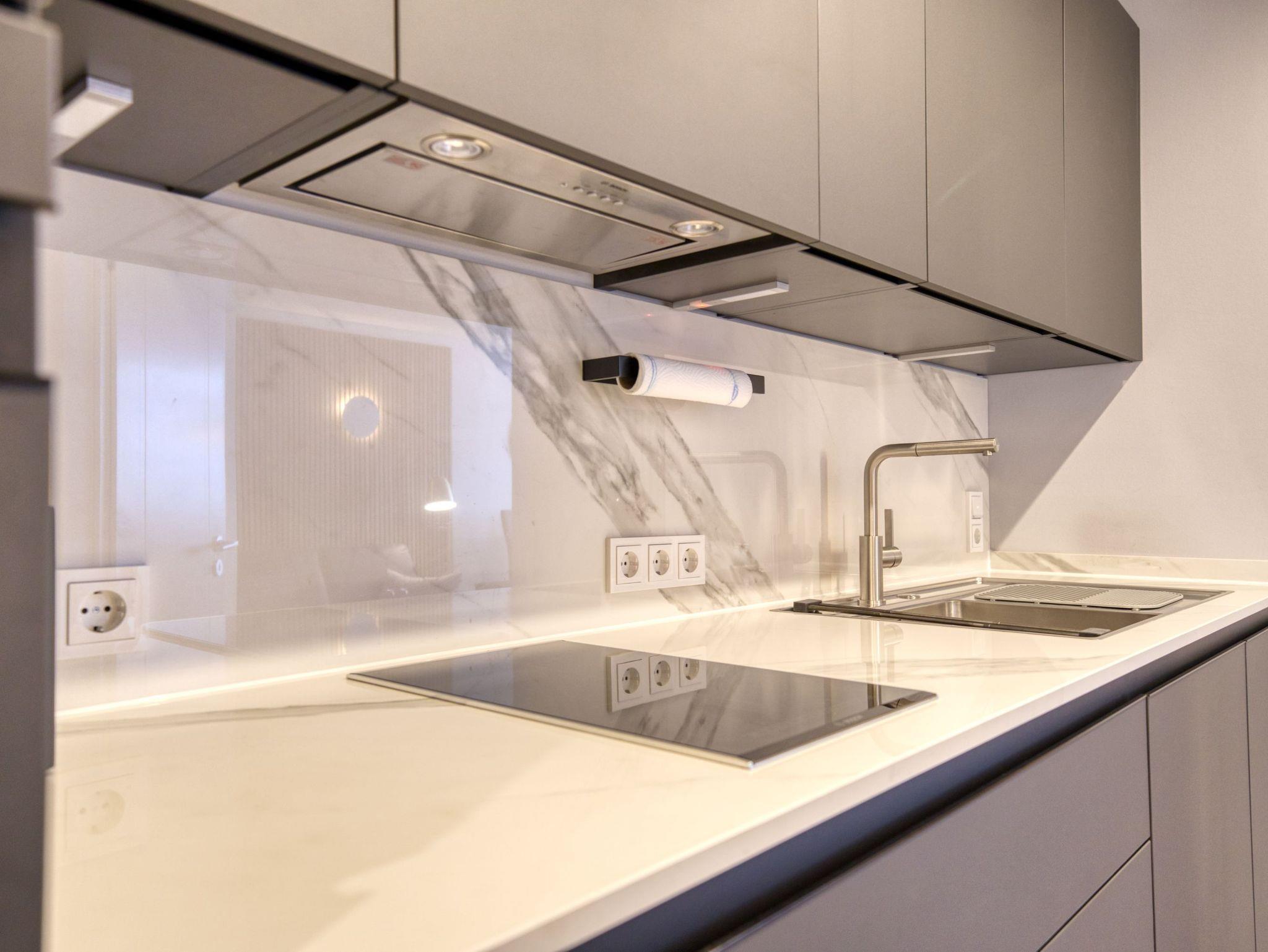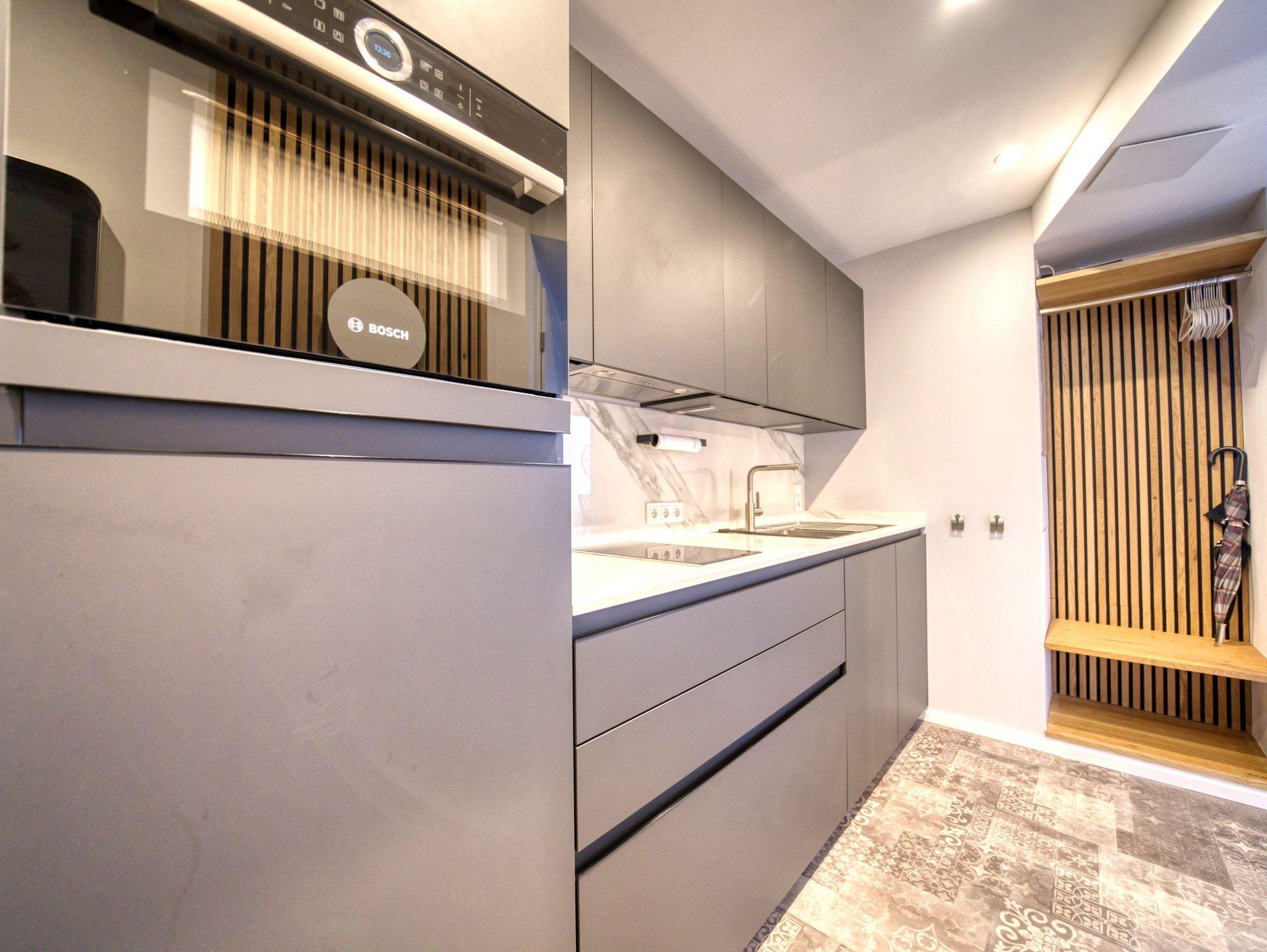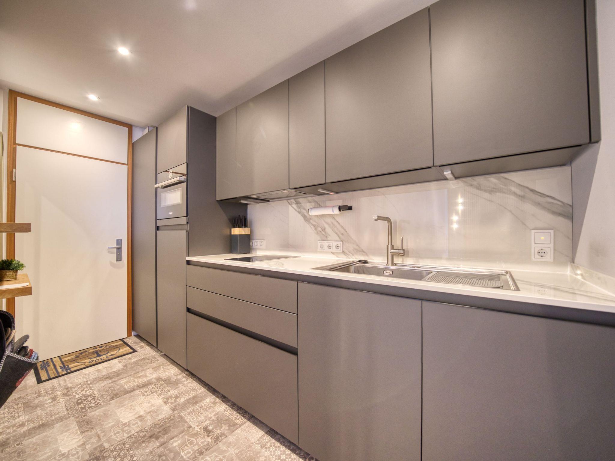 Küche im Flur mit 2-Plattenherd, Backofen, großem Kühlschrank mit Gefrierfach, Nespresso-Kaffeemaschine