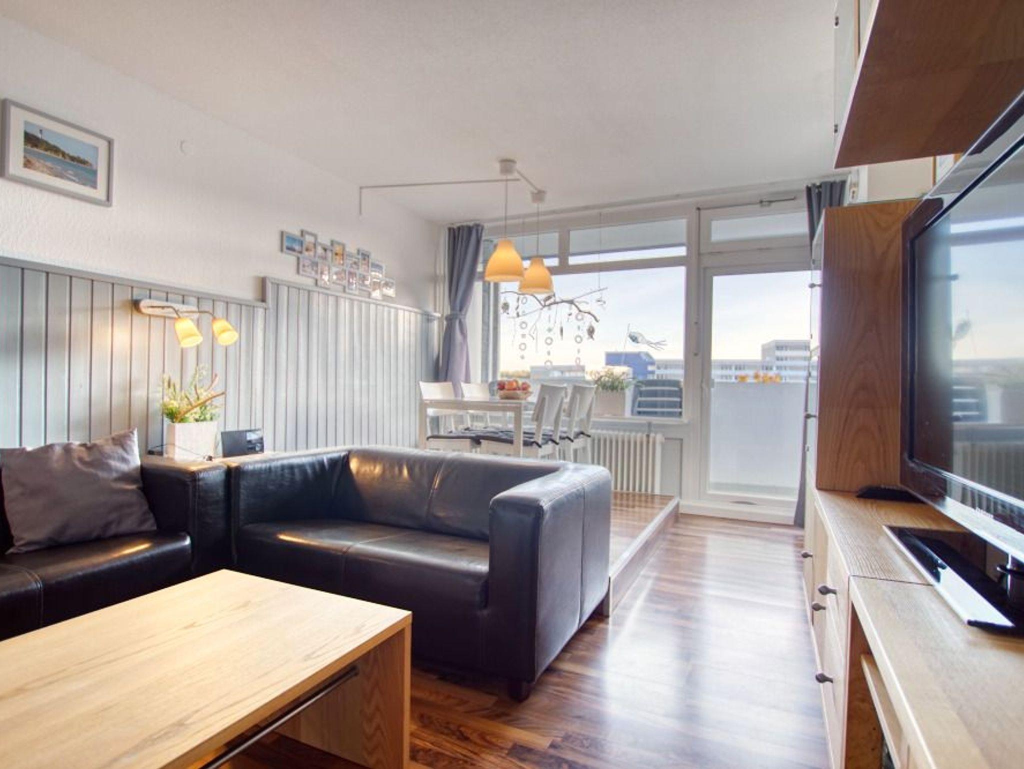 Willkommen in Ihrer charmanten Ferienwohnung im Haus B des Ferienparks Heiligenhafen, gelegen in der 5. Etage mit Fahrstuhl. Auf 45 m² Wohnfläche finden bis zu 4 Personen ein komfortables Urlaubszuhause mit Balkonblick auf den Innenhof und den Binnensee.