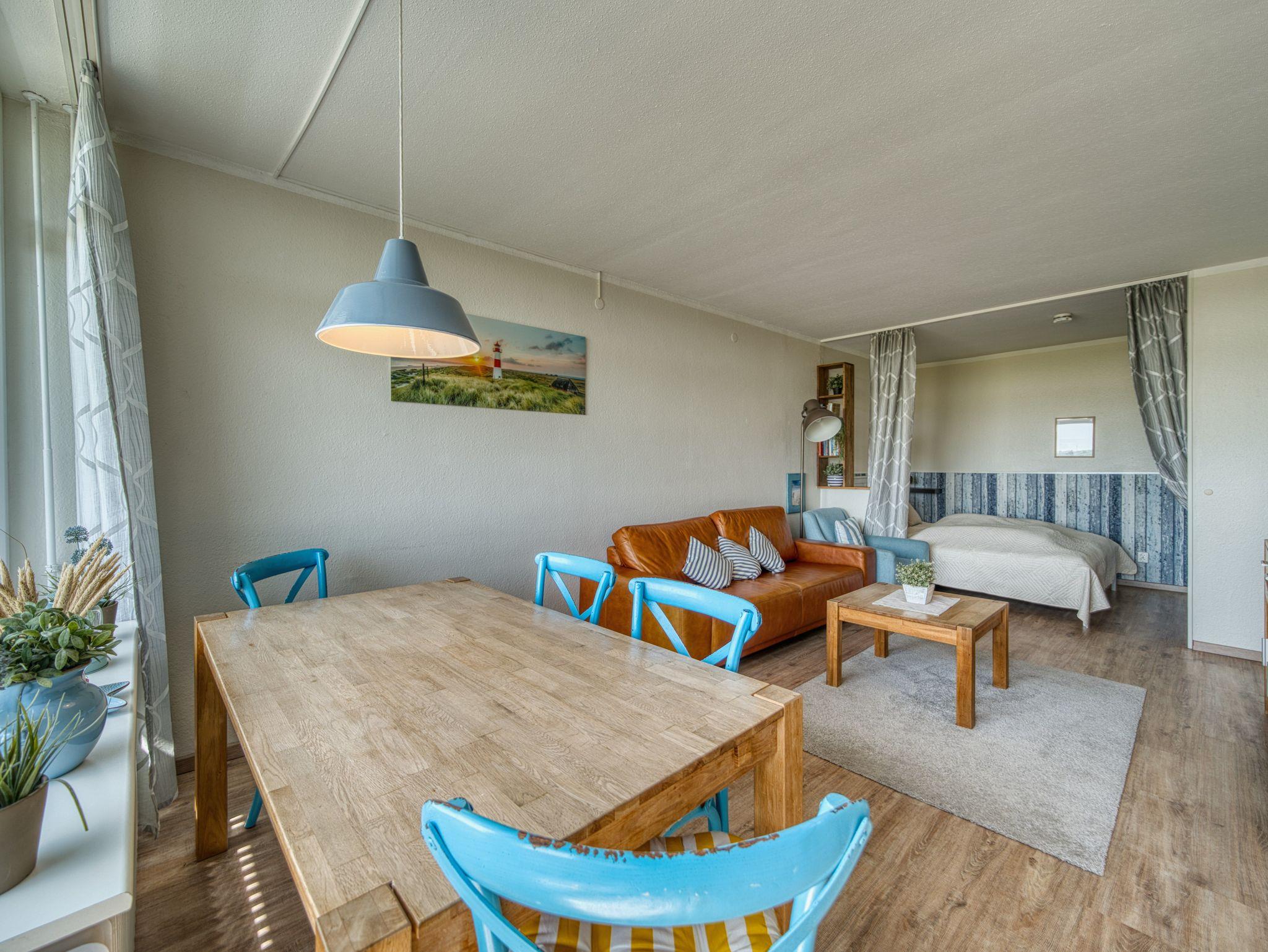 Wohnbereich mit Sofa, Flachbild-TV und Esstisch mit Blick auf den Balkon