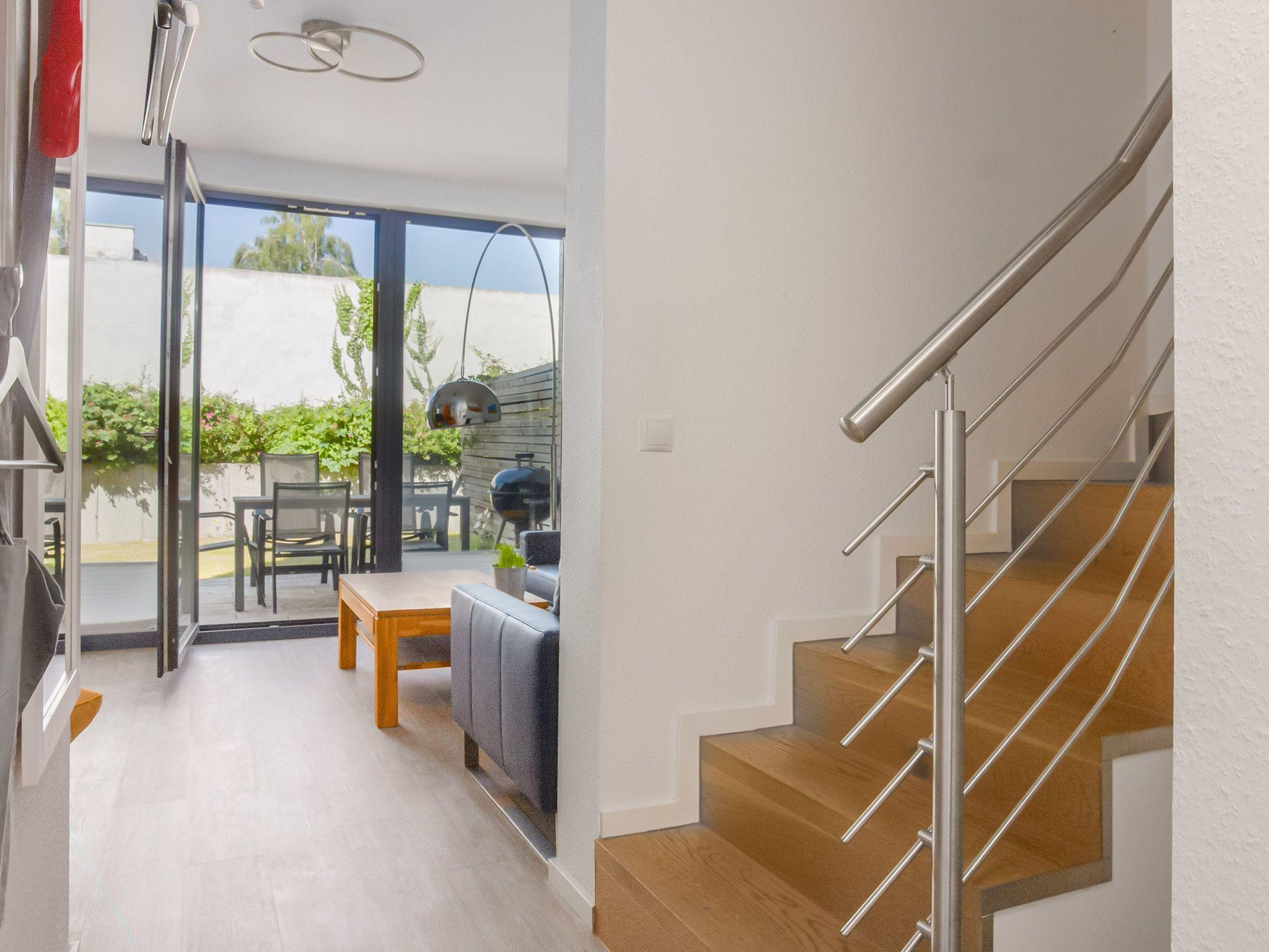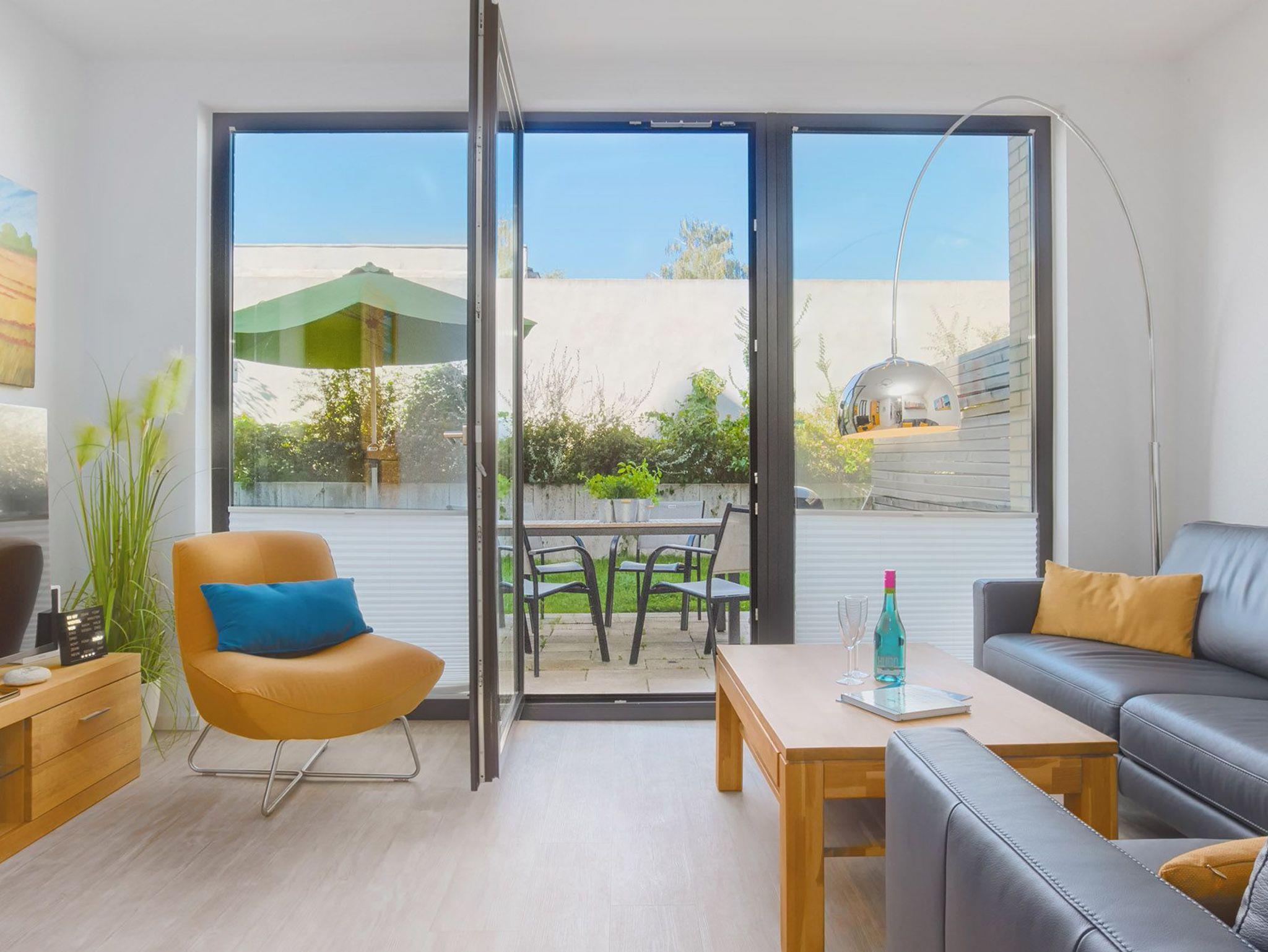 Das stilvolle Ferienhaus Frische Brise bietet auf ca. 100 m² Wohnfläche, verteilt über drei Ebenen, eine hochwertige Ausstattung und ausreichend Platz für bis zu sechs Personen. Hier erwartet Sie eine geschmackvolle Kombination aus modernem Design und gemütlicher Atmosphäre. Der Wohnbereich besticht durch warme Holzoptik, einen hochwertigen Vinylplanken-Bodenbelag im Holzlook sowie eine komfortable Polsterlandschaft, die zum Entspannen einlädt. Dank bodentiefer Fenster strömt viel Tageslicht ins Haus und schafft eine helle, freundliche Umgebung. Vom Sofa aus genießen Sie den direkten Blick auf die möblierte Terrasse und den angrenzenden Gartenbereich ein perfekter Ort, um die frische Ostseeluft zu genießen. Ein Sonnenschirm sorgt für angenehmen Schatten, und ein Grill steht für gesellige Barbecue-Abende bereit.