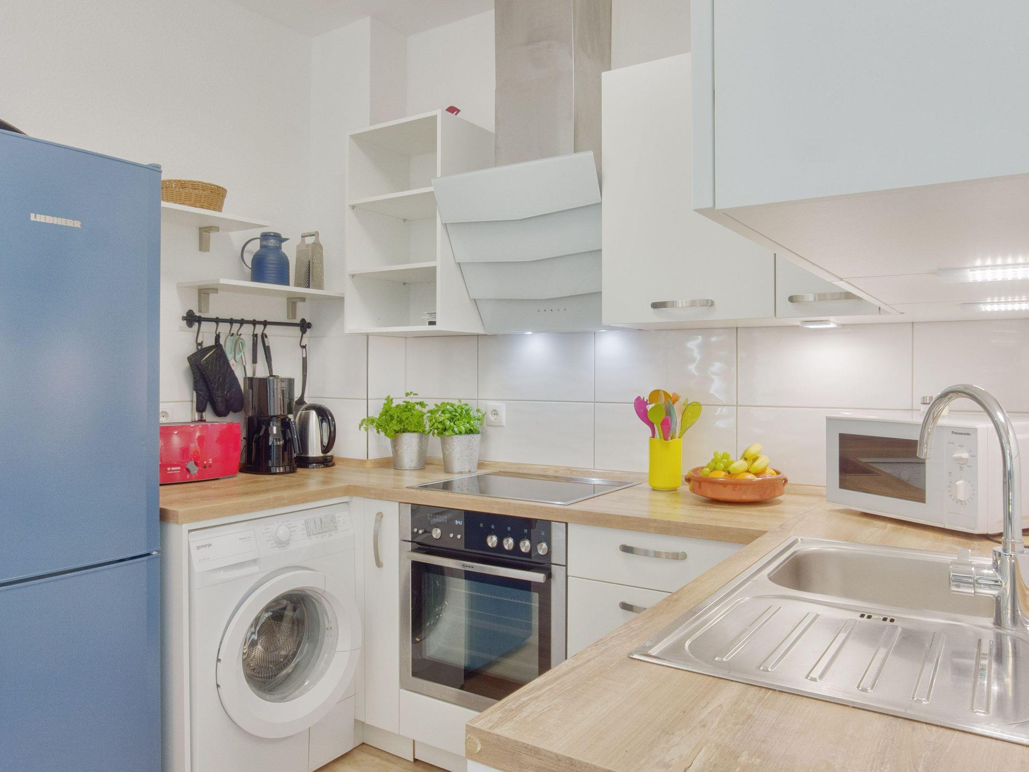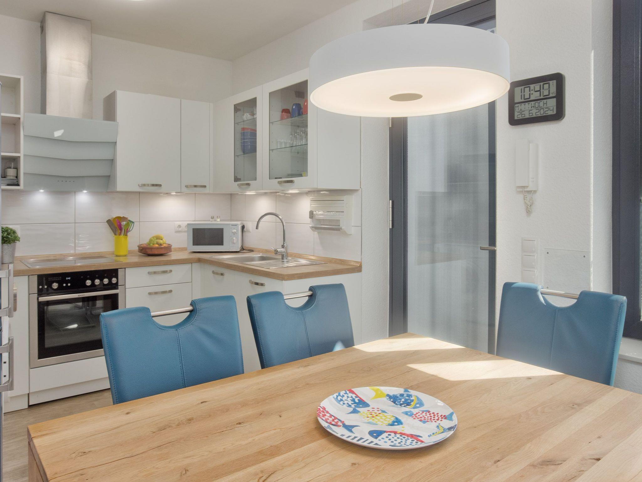Die große, voll ausgestattete Küche in U-Form lässt keine Wünsche offen. Hier finden Sie hochwertige, leise Elektrogeräte ? einschließlich einer Waschmaschine ? sowie ausreichend Platz für kulinarische Kreativität. Der angrenzende Essbereich bietet bequem Platz für bis zu sechs Personen. Im Eingangsbereich befindet sich eine praktische Garderobe, und neben der Küche bietet ein kleiner Abstellraum zusätzlichen Stauraum für Haushaltsutensilien.