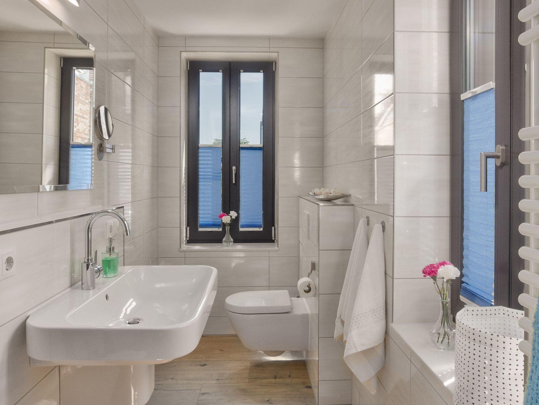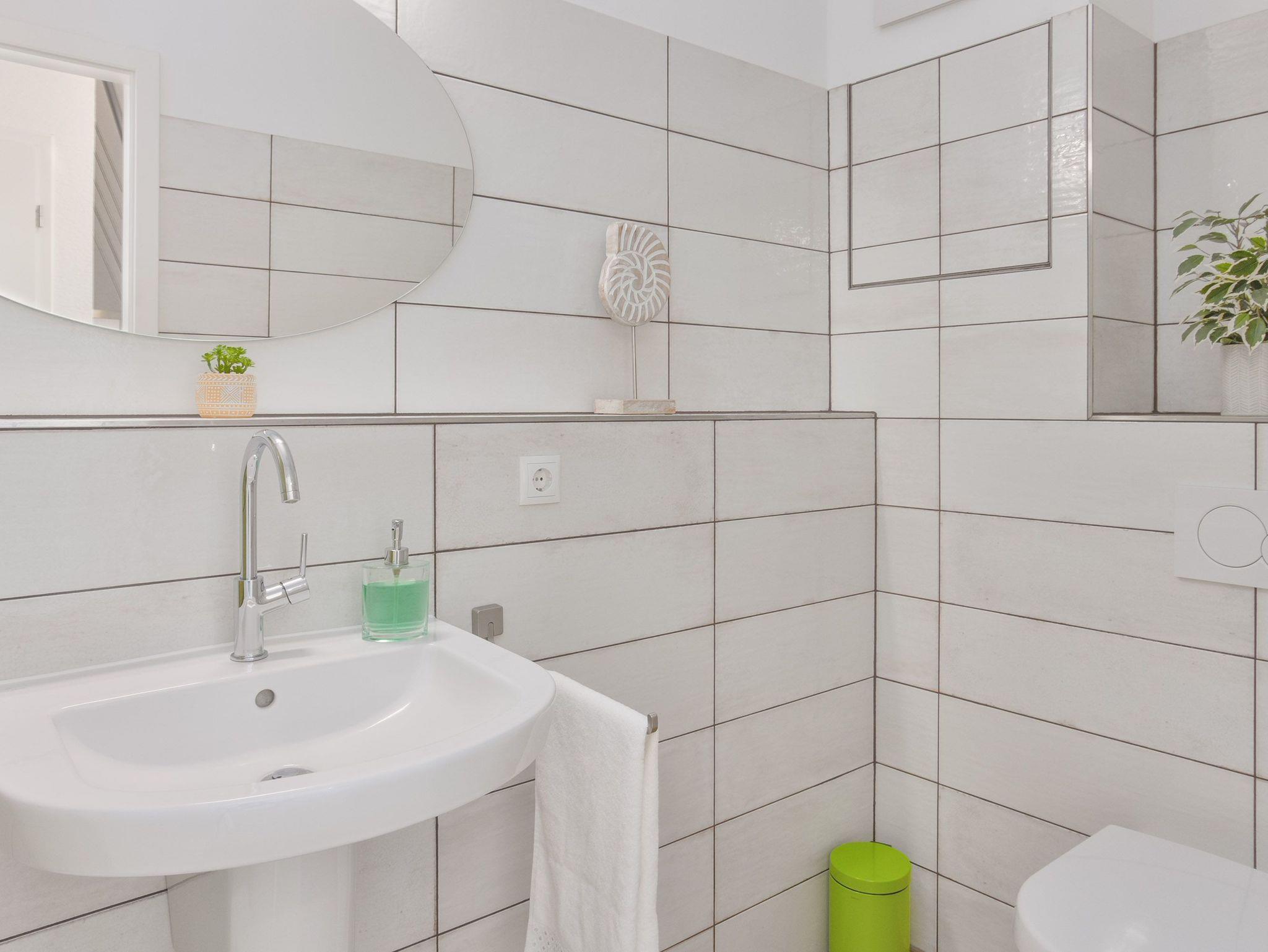 Zwei moderne Badezimmer mit bodengleicher Dusche bieten ausreichend Platz für die ganze Familie. Hier können Sie nach einem erlebnisreichen Tag wunderbar entspannen. Beide Bäder sind mit einem Handtuchwärmer, Föhn, Kosmetikspiegel und WC ausgestattet. Zusätzlich steht im Erdgeschoss ein Gäste-WC zur Verfügung.