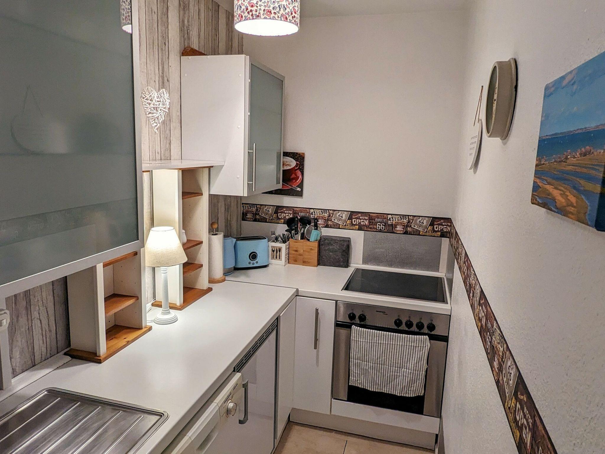 Die Küche ist mit allem ausgestattet, was Sie für Ihren Urlaub benötigen. Der kombinierte Wohn- und Schlafraum ist mit einem franz. Bett (1,40x 2,00m), einer kleinen Frühstücksecke, einer gemütlichen Couch, TV und Wlan ausgestattet.