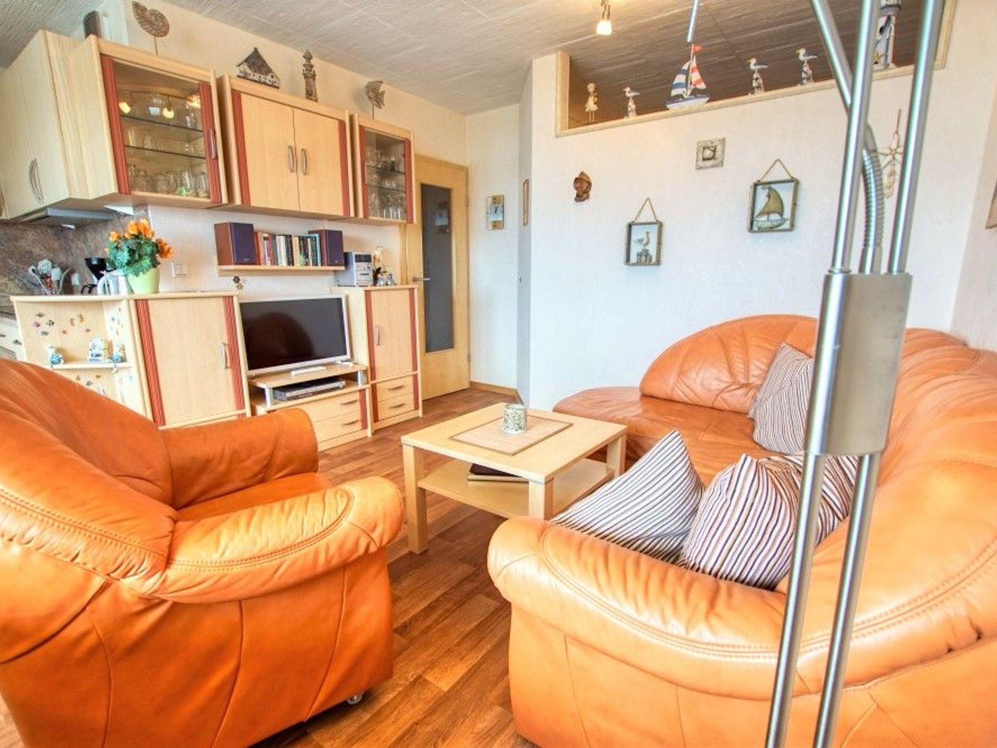 Wohnzimmer mit bequemer Ledercouch, Sessel, Flachbild-TV und Zugang zum Westbalkon mit Markise