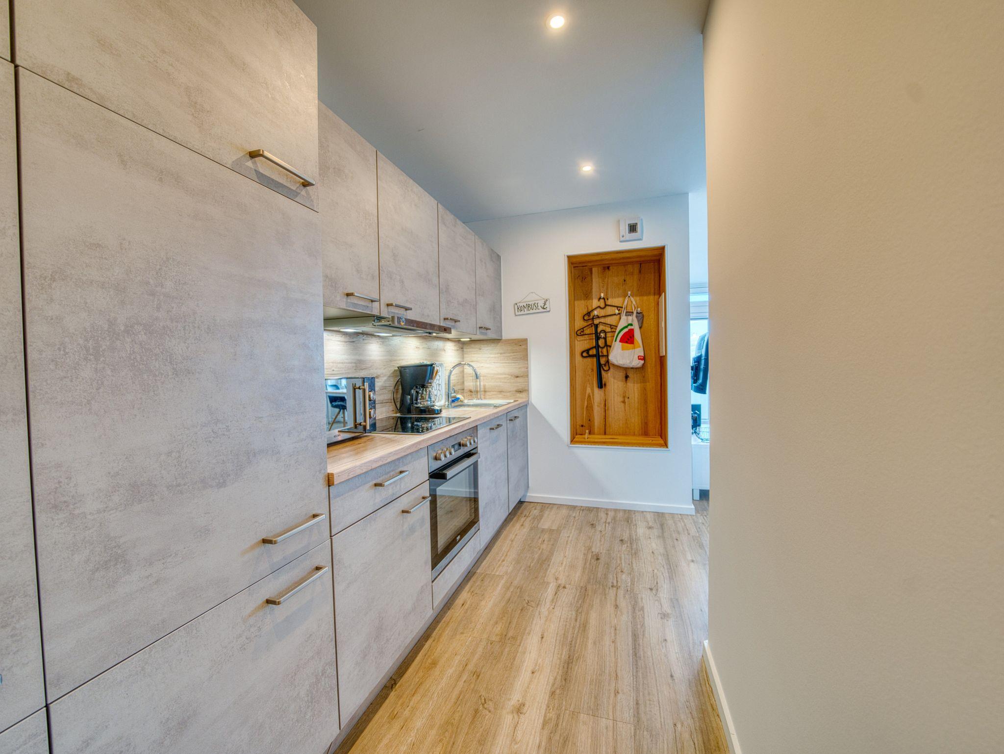 Küche im Eingangsbereich mit Spülmaschine, Backofen, 4-Plattenceranfeld, Kühlschrank mit Gefrierfach, Kaffeemaschine, Wasserkocher und ausreichend Stauraum