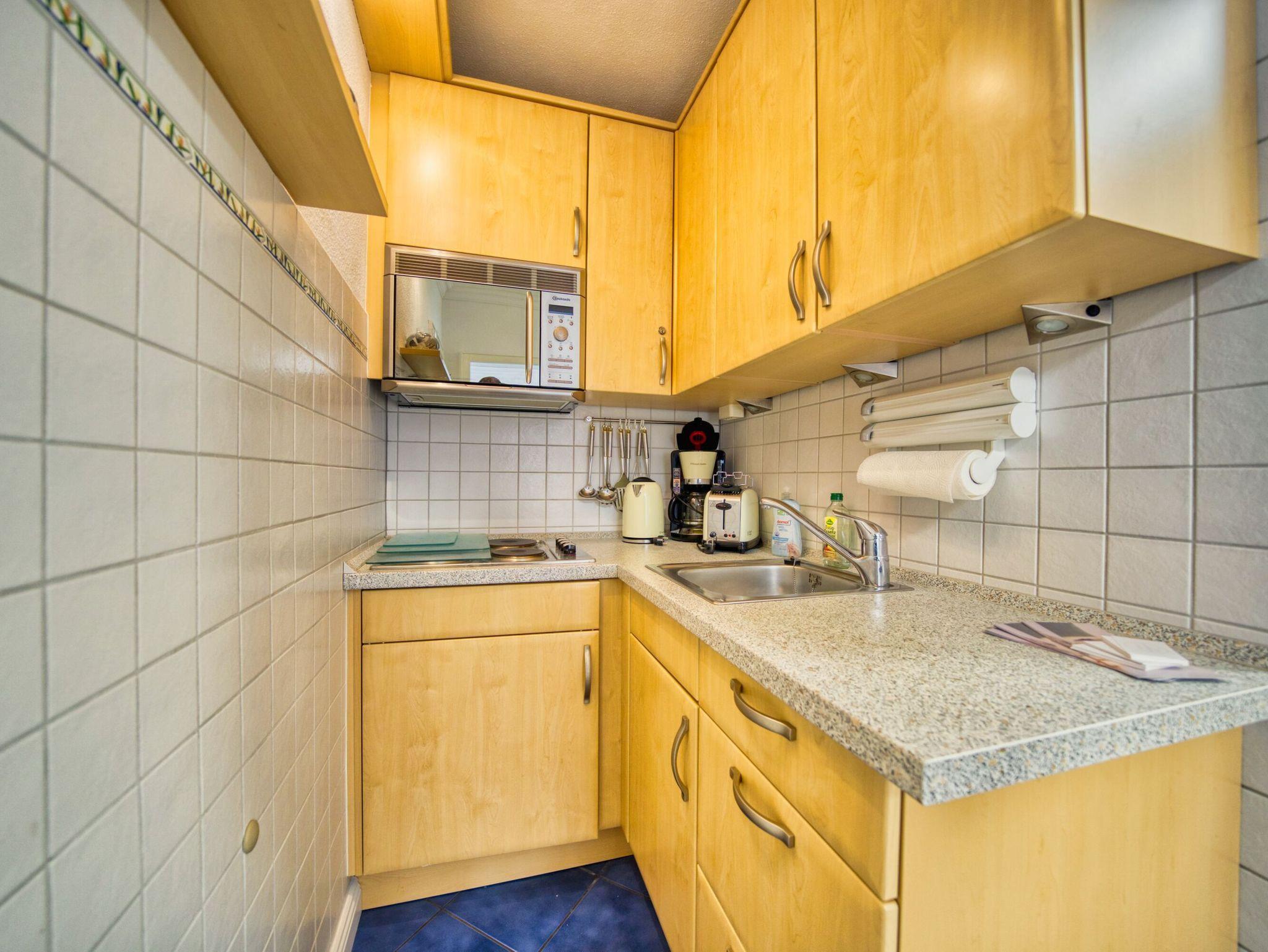 Küche mit Ceranfeld, Kühlschrank, Wasserkocher, Toaster und Filterkaffeemaschine
