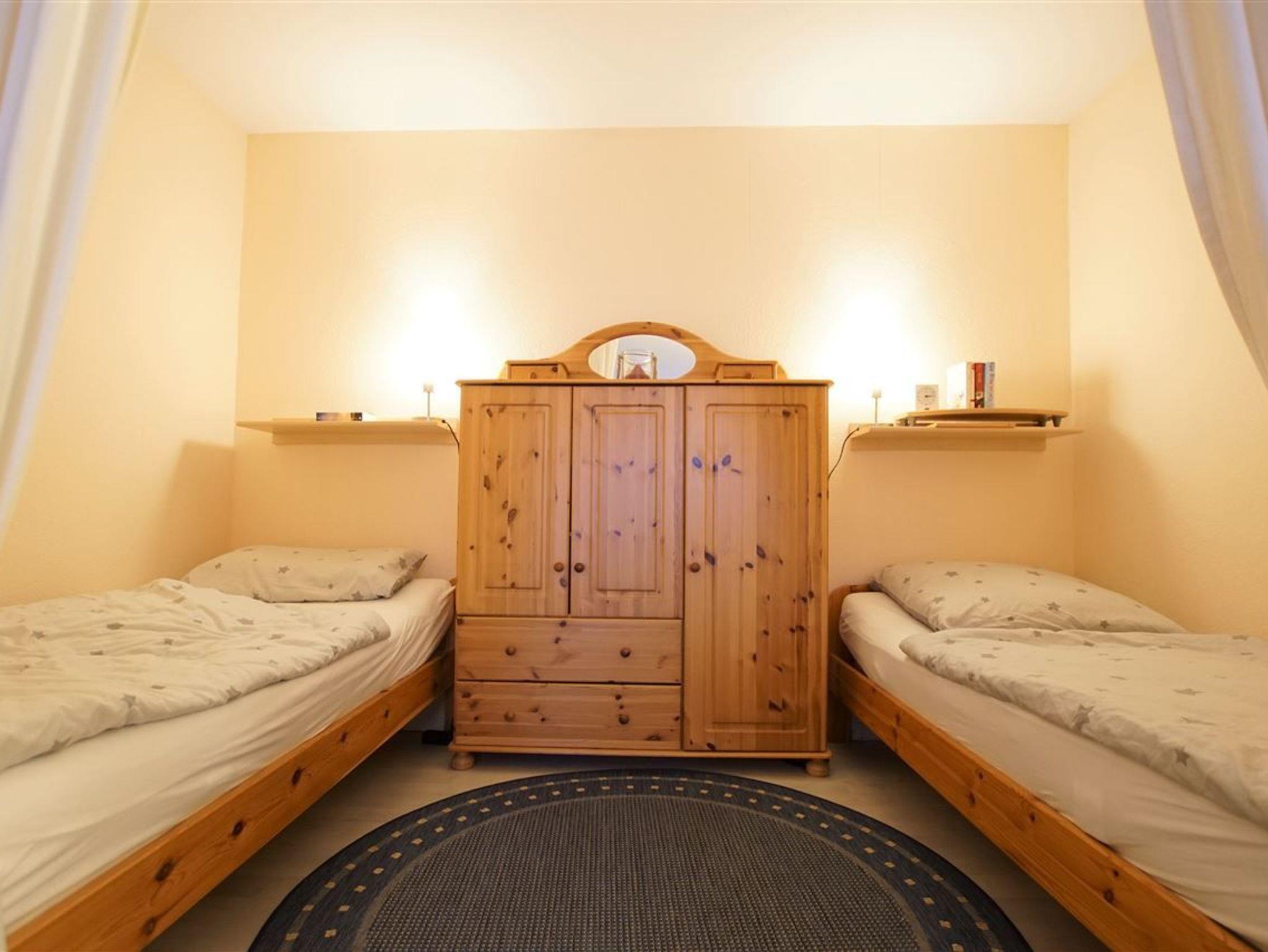 Kleines Zimmer mit Einzelbett, Tür zum Wohnzimmer, Fenster mit Fliegengitter und Verdunkelungsvorhang