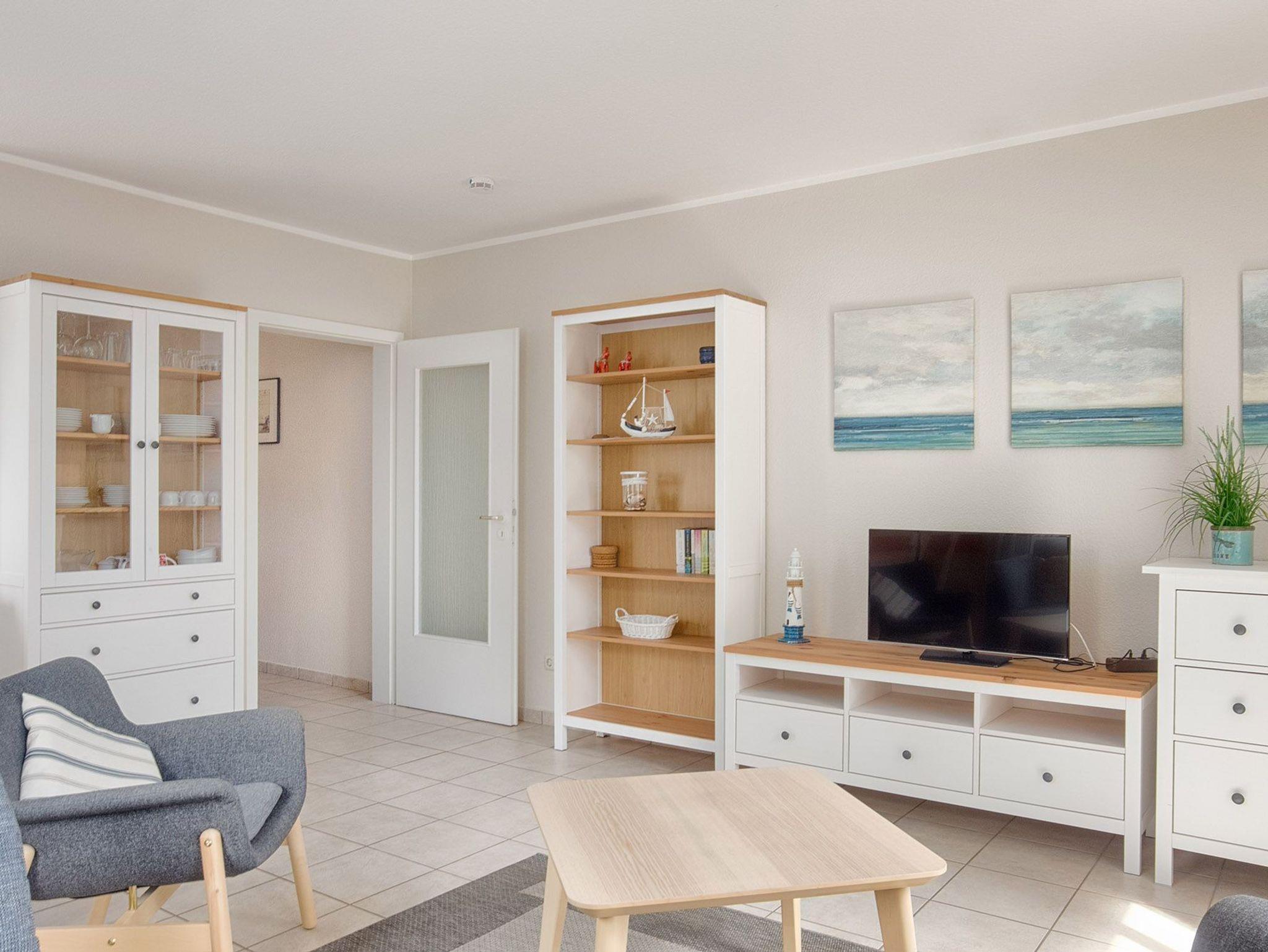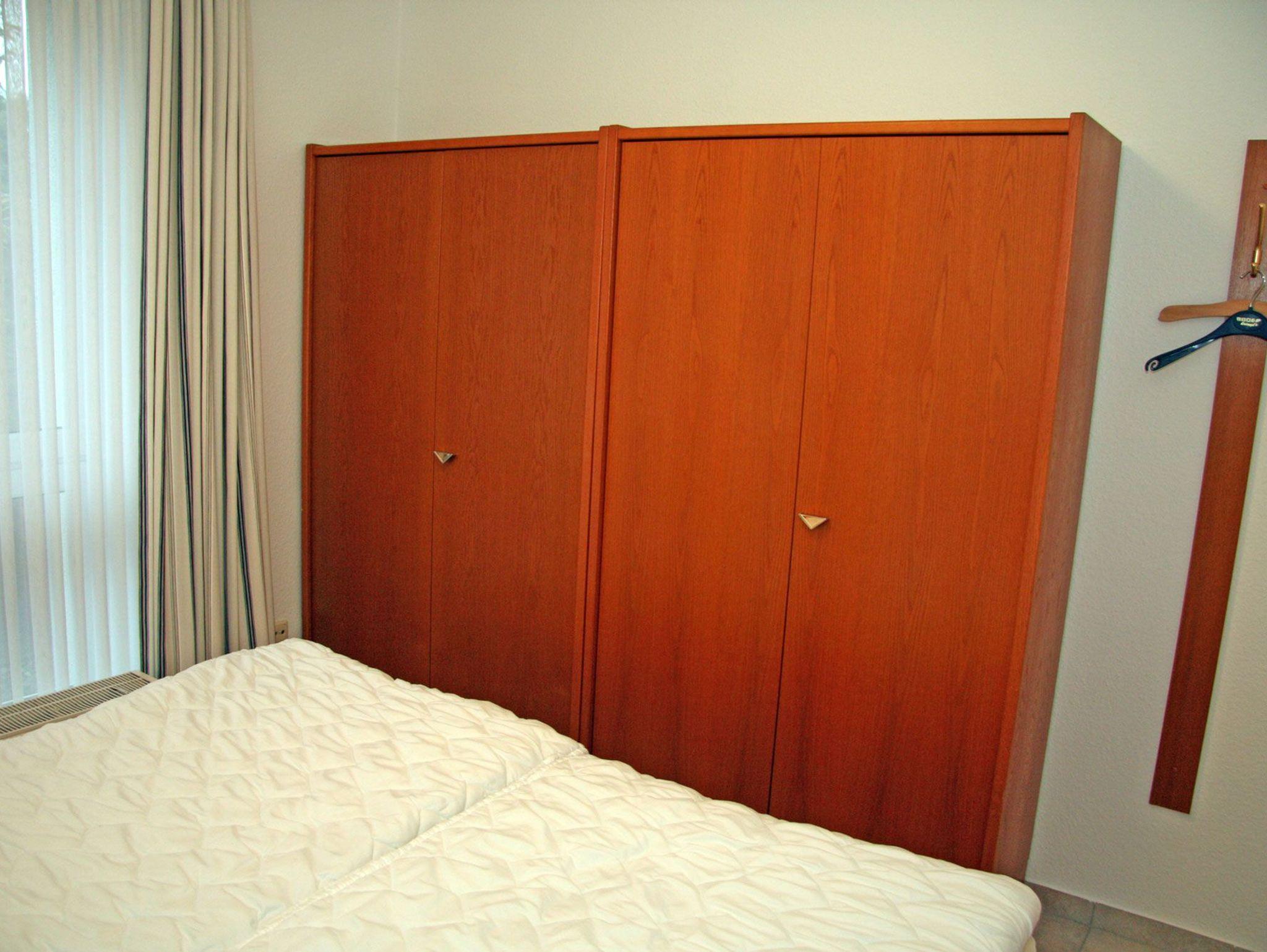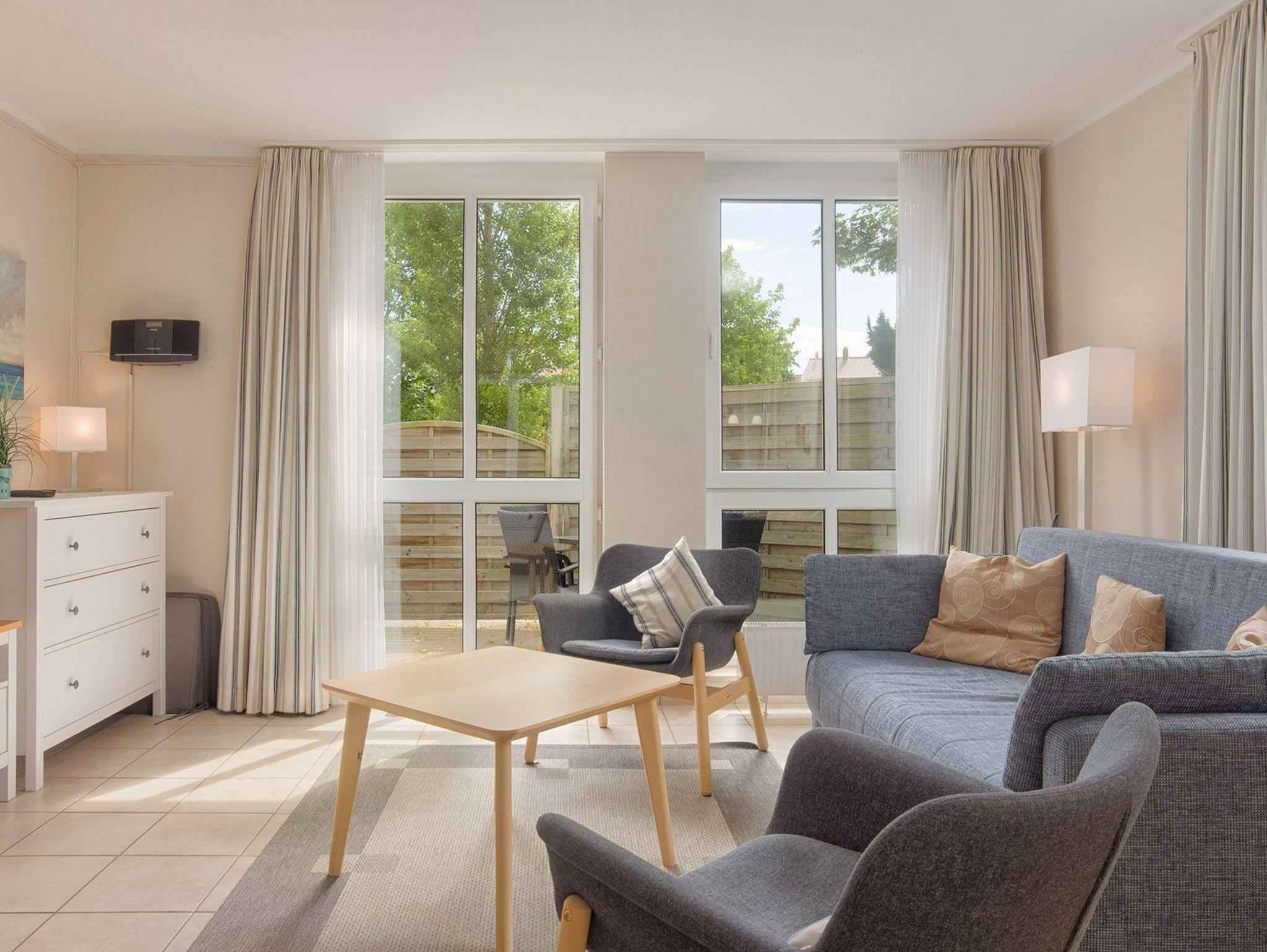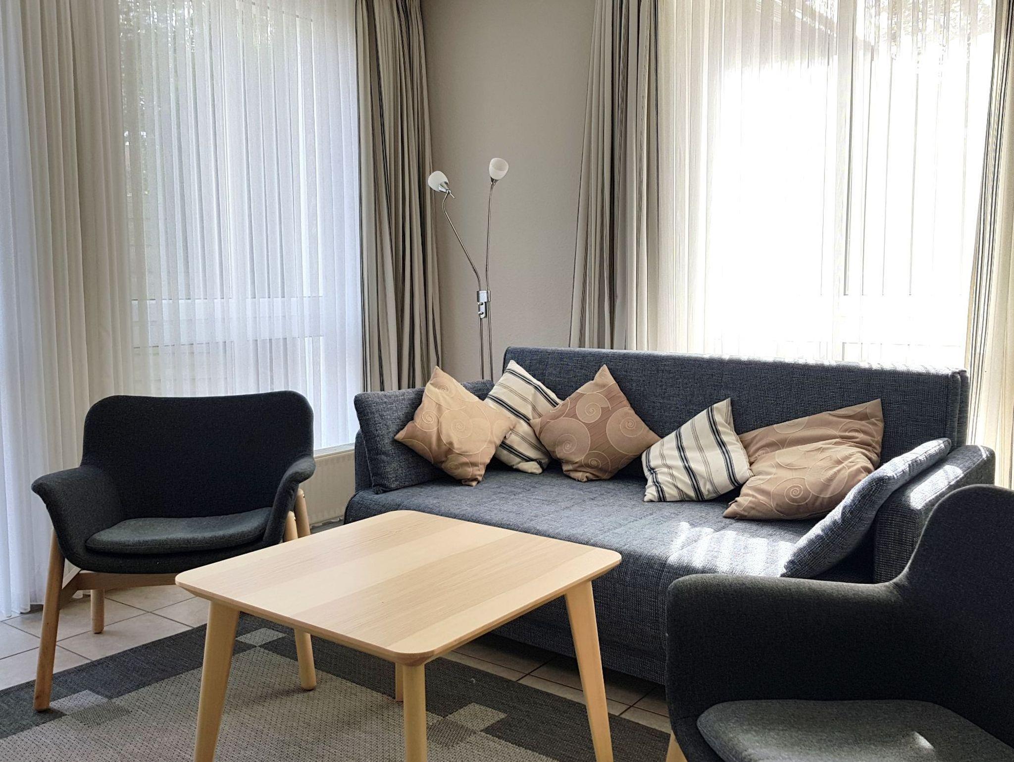 Das Apartment 4 im Erdgeschoss bietet auf etwa 45 Quadratmetern ausreichend Platz für bis zu vier Personen. Im Schlafzimmer befinden sich ein gemütliches Doppelbett und ein großer Kleiderschrank. Eine großzügige Schlafcouch im Wohnbereich bietet zwei weiteren Personen eine komfortable Schlafmöglichkeit.