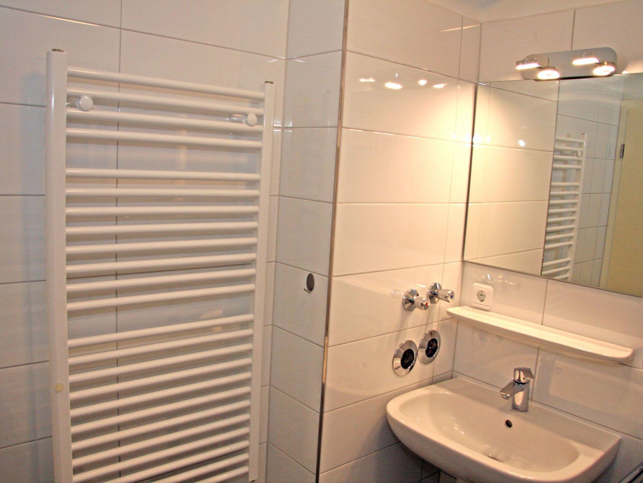 Das helle, moderne Duschbad mit bodentiefer Dusche, Handtuchwärmer und WC sorgt für zusätzlichen Komfort. Pflegeleichte Böden tragen zum Wohlfühlambiente bei. Eine gemeinschaftlich nutzbare Waschmaschine, ein Trockner und eine Gefriertruhe stehen allen Gästen des Hauses kostenlos zur Verfügung. Im eigenen Abstellraum befinden sich zudem ein Bügeleisen, ein Bügelbrett und ein Wäscheständer.