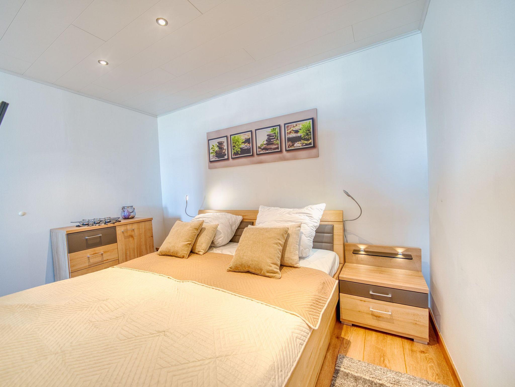 Schlafbereich mit Doppelbett, durch eine halboffene Wand vom Wohnzimmer getrennt