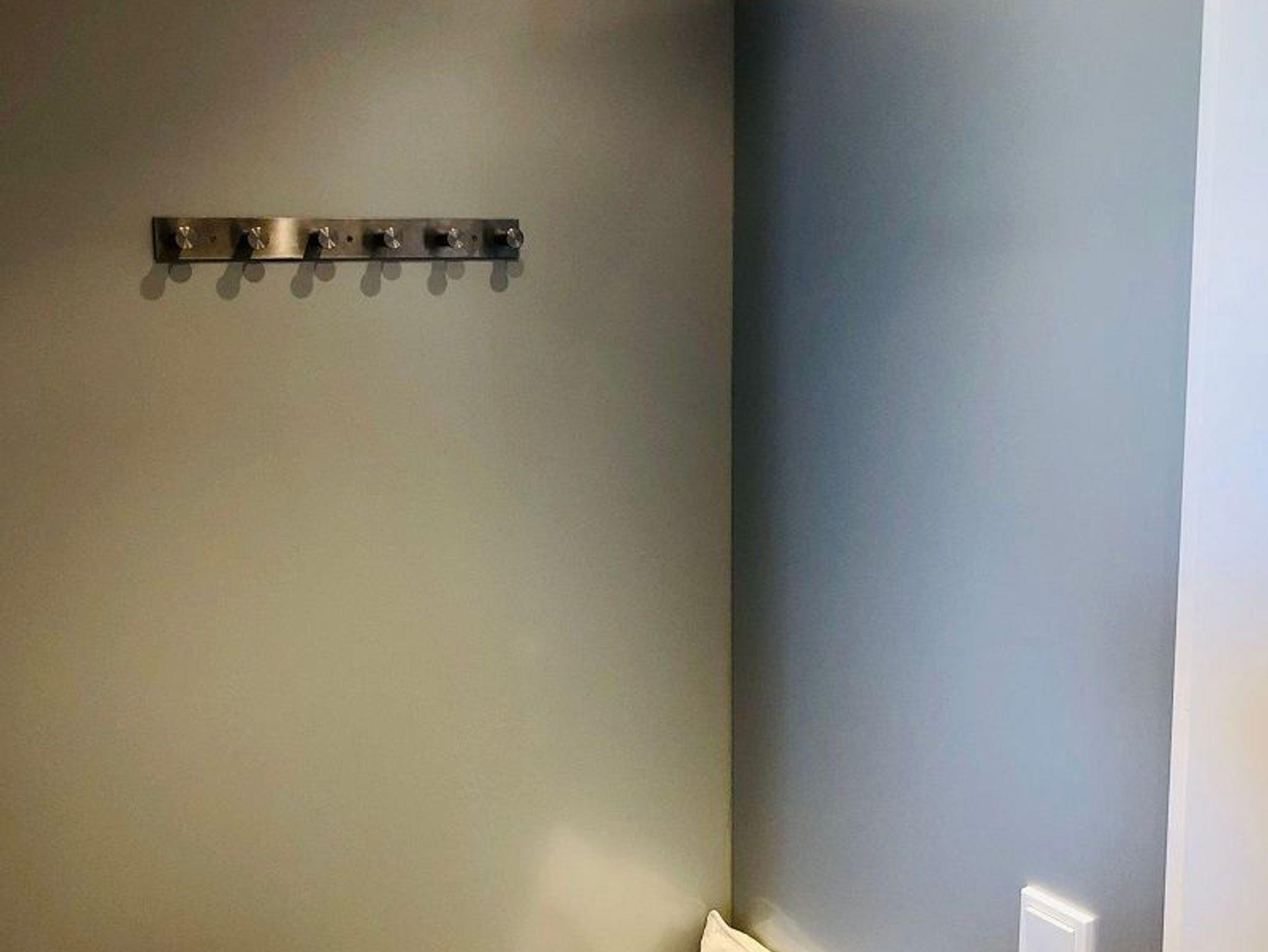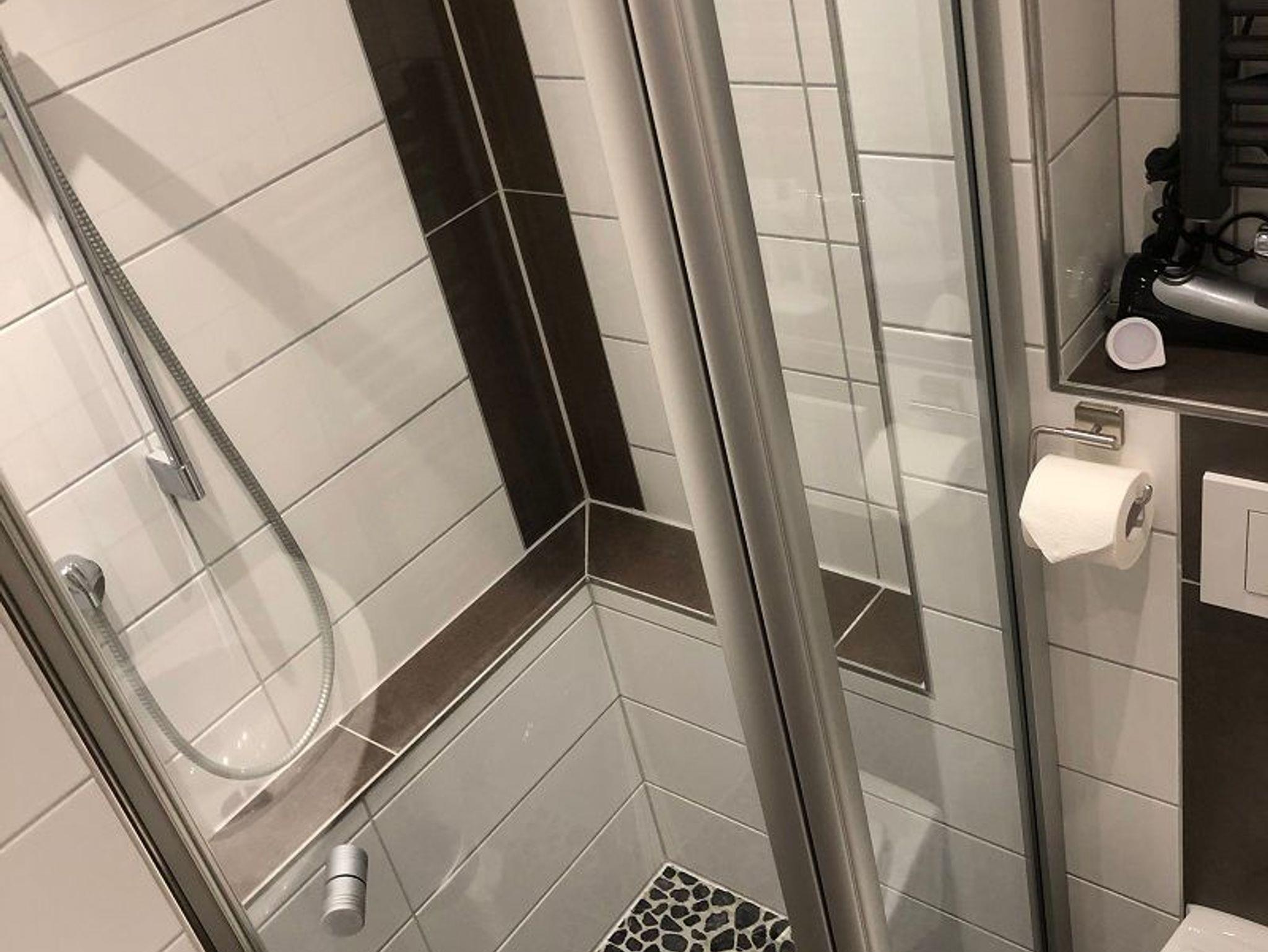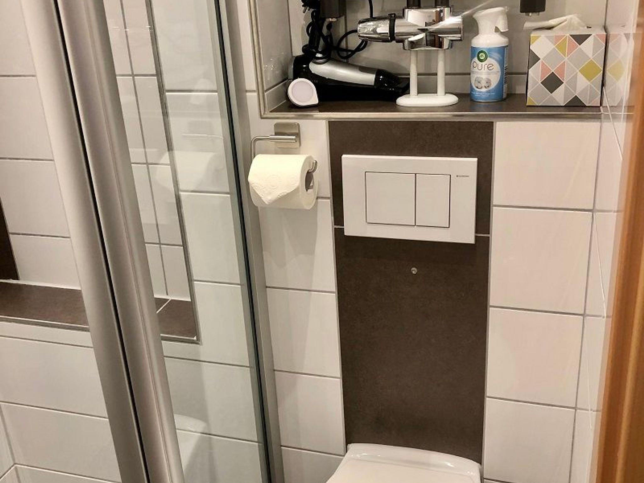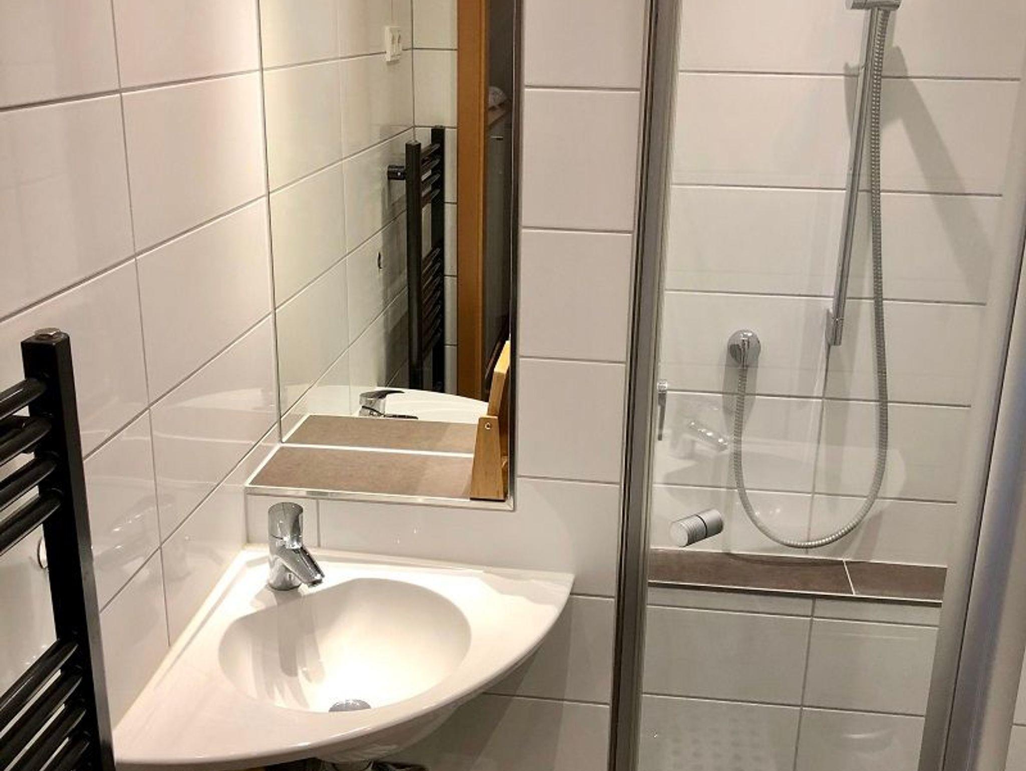 Bad mit Duschkabine, extra Lüftung und ebenerdigem Dusch-Einstieg und ein Flur mit viel Staufläche.