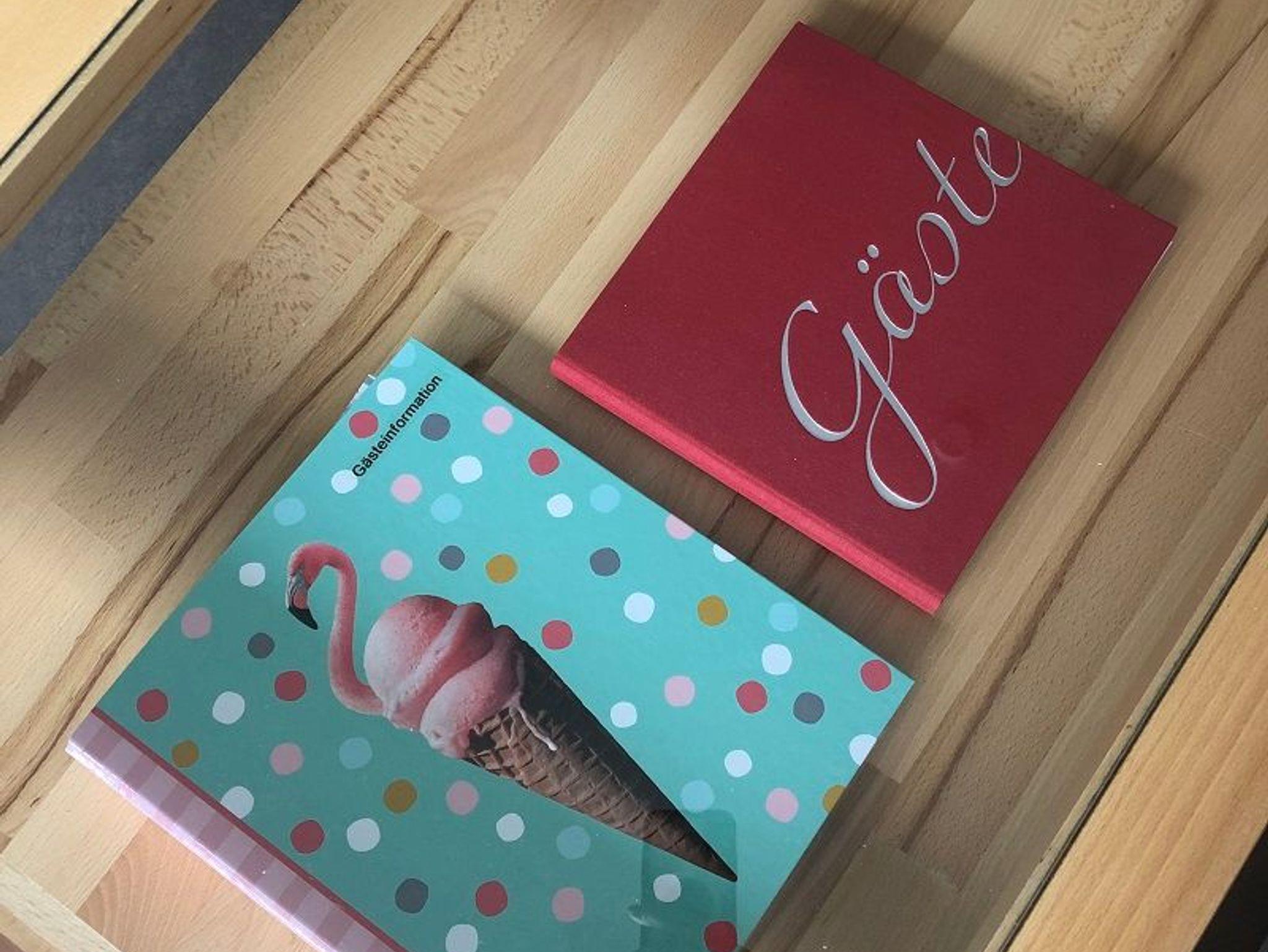Es ist ein Kinderhochstuhl sowie Spiele und Bücher für Groß und Klein vorhanden.