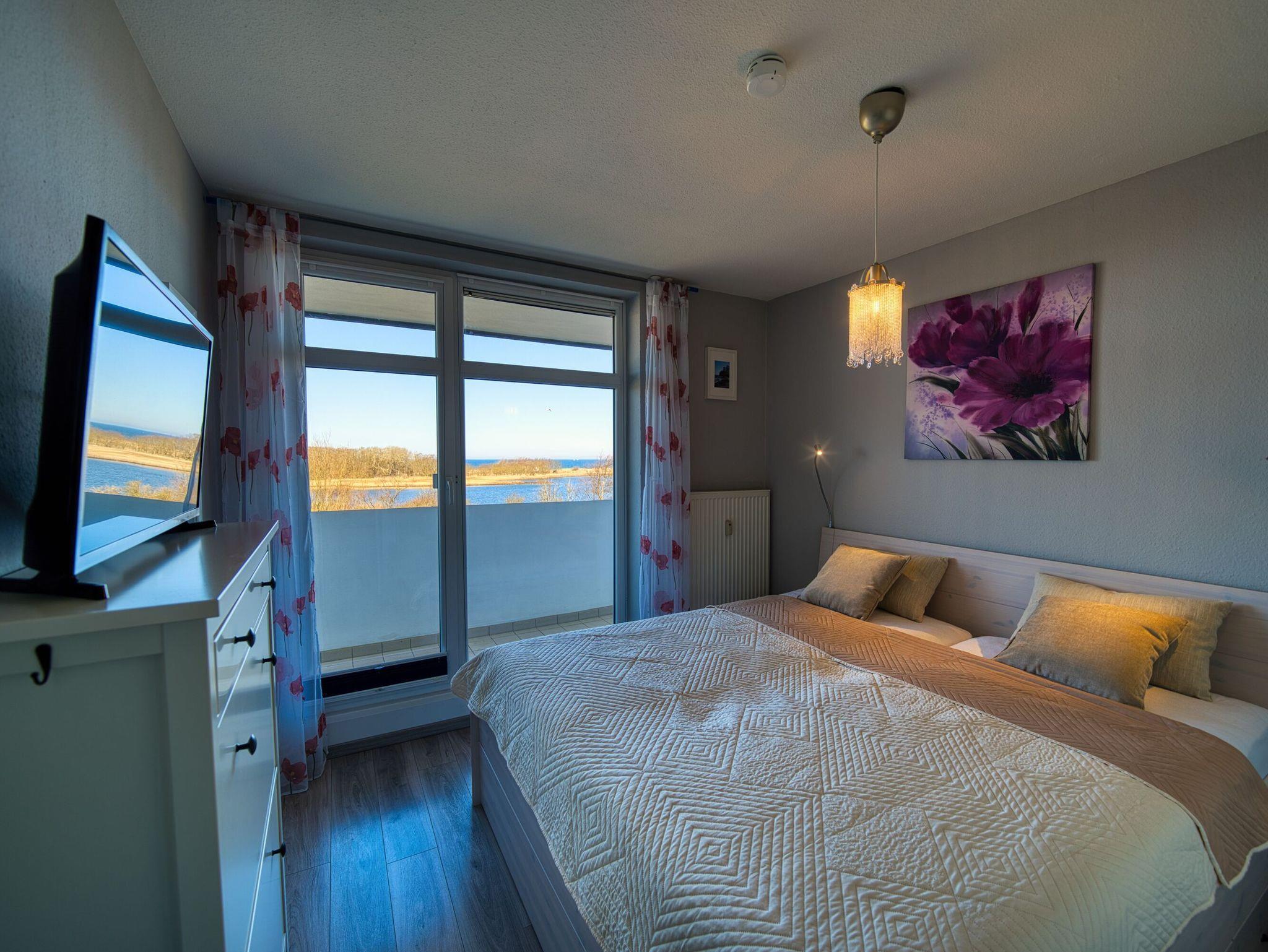 Schlafzimmer 1: Doppelbett (180?x?200?cm), 32-Zoll-Smart-TV, Fenster mit traumhaftem Ostseeblick