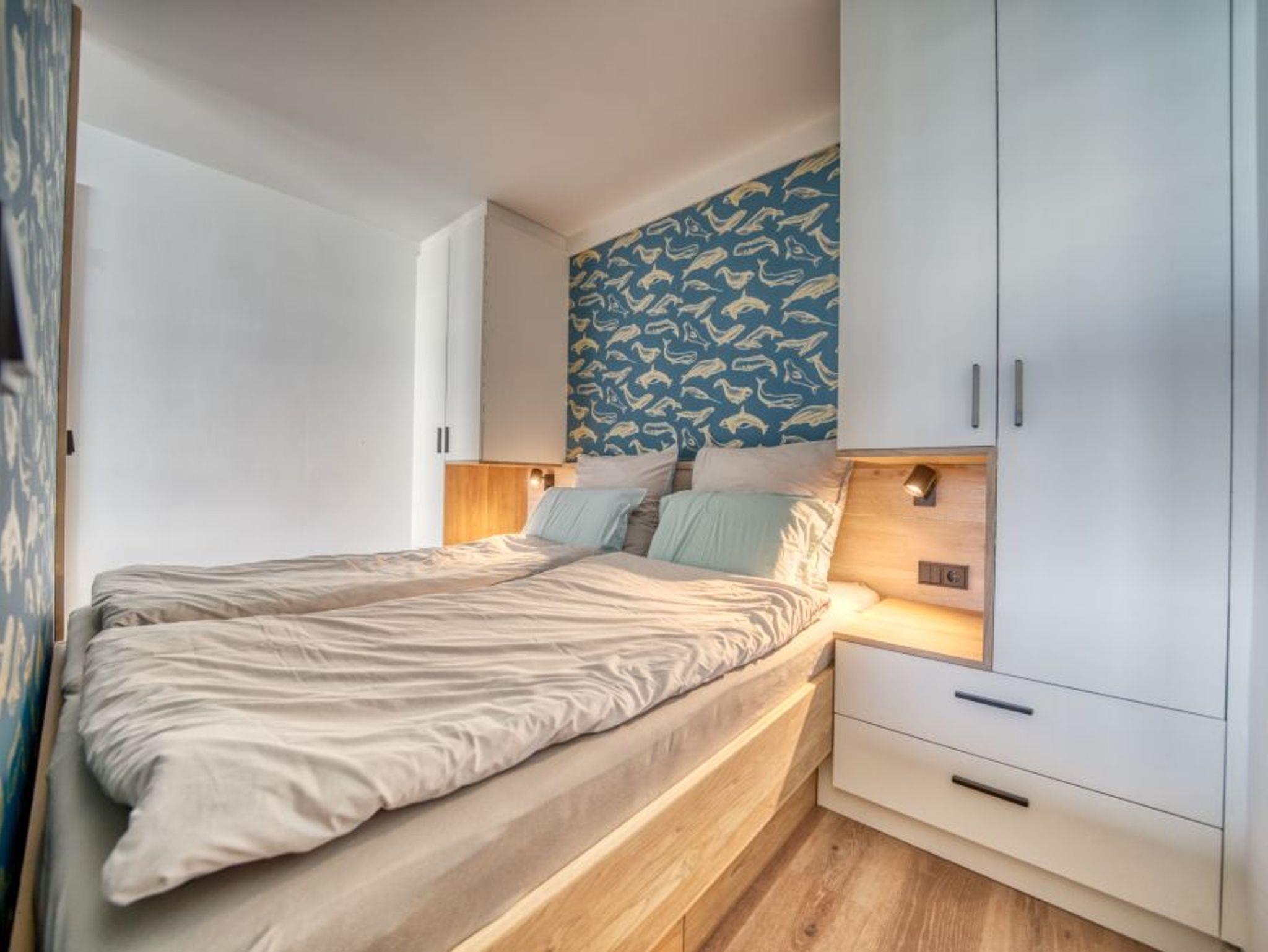 Wohn-/Schlafbereich mit komfortablem Doppelbett, durch eine Trennwand optisch vom Wohnraum getrennt