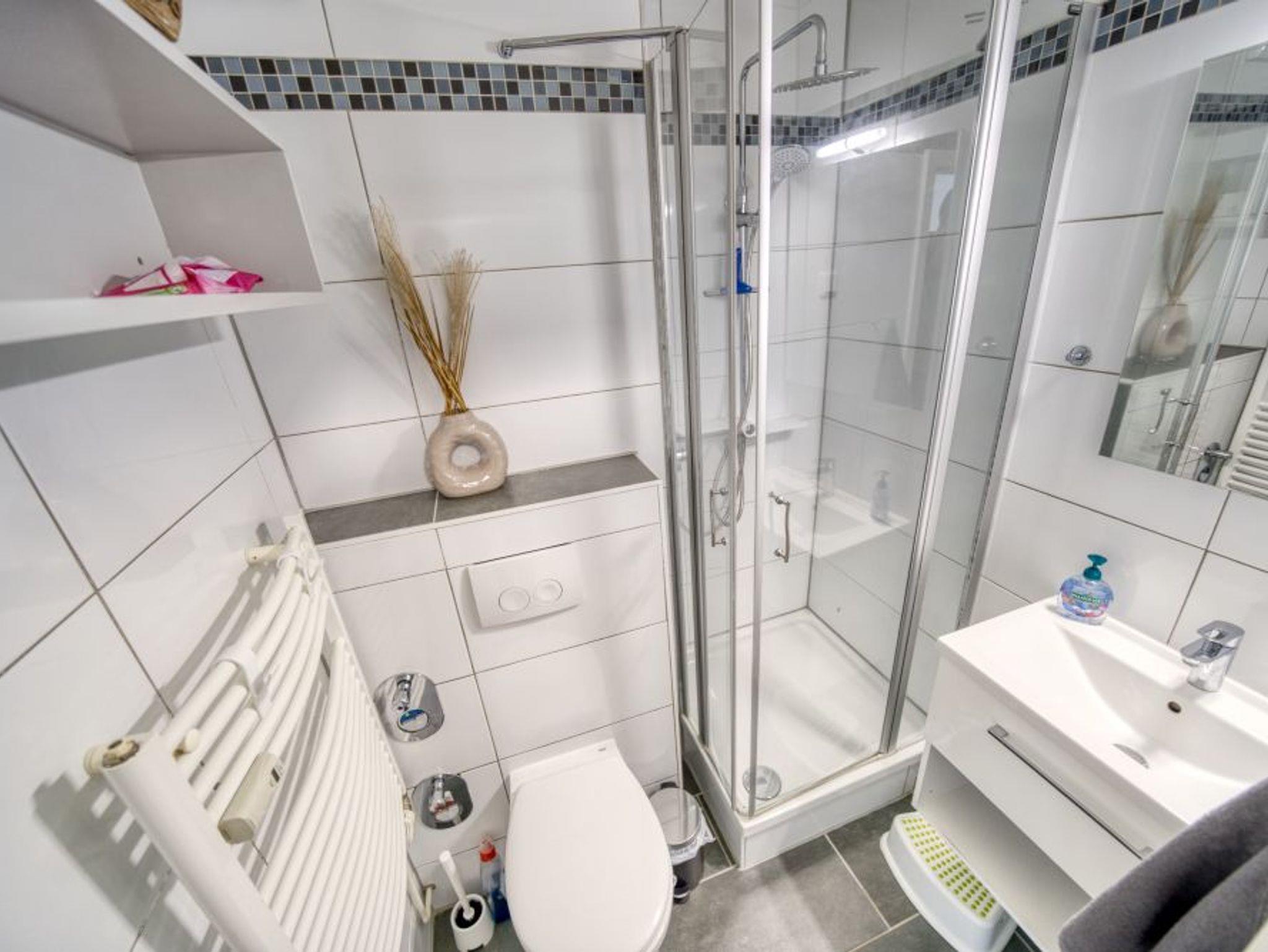 Modernes Bad mit Duschkabine, WC und Handtuchtrockner