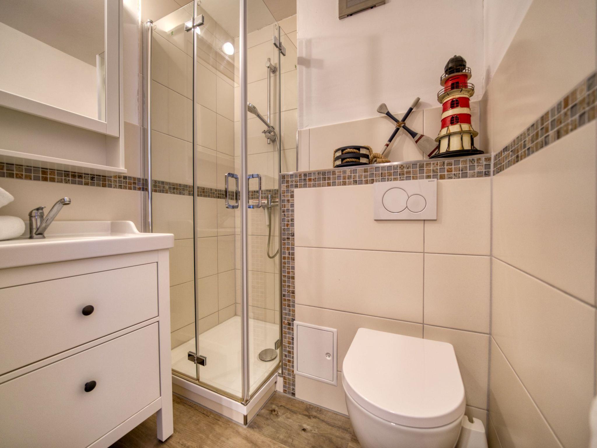Funktionales Badezimmer mit Duschkabine mit niedrigem Einstieg