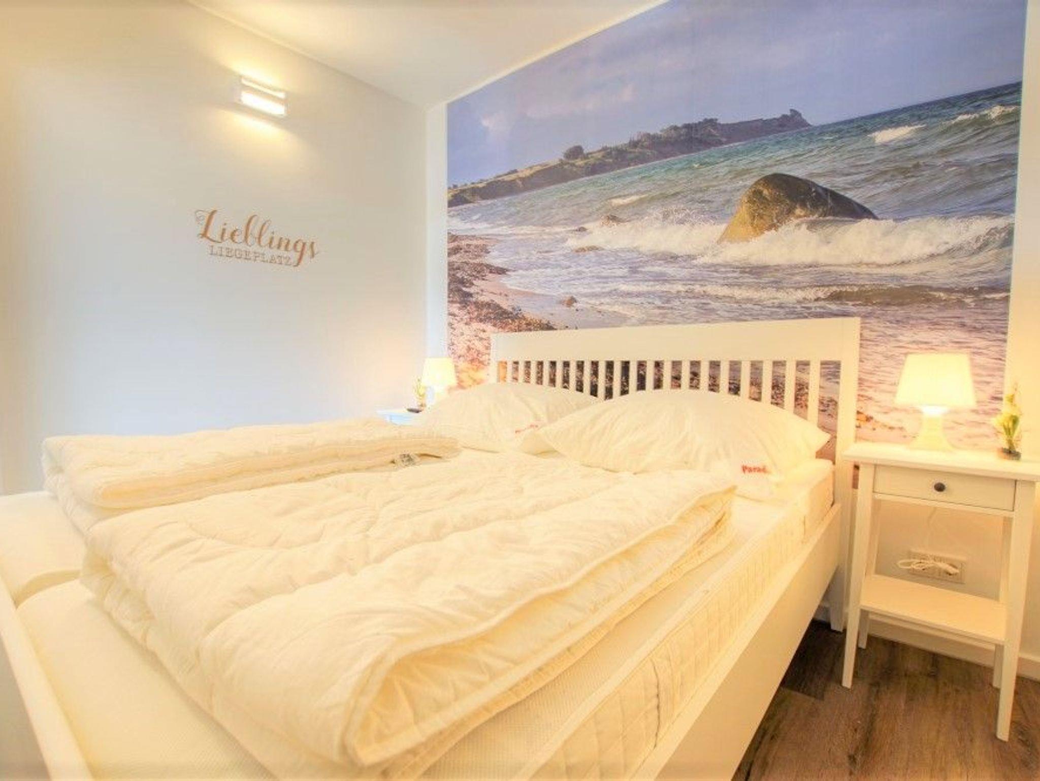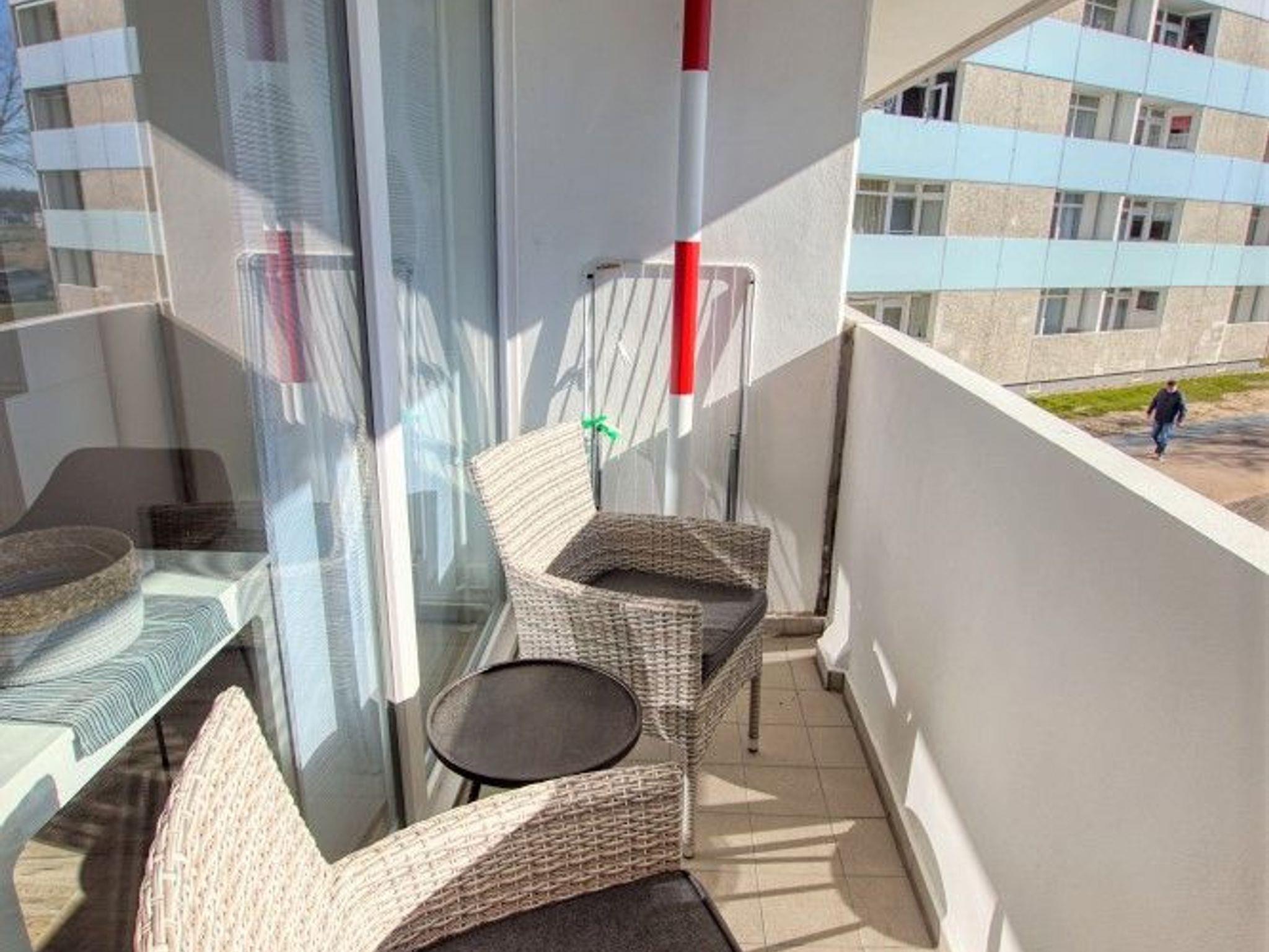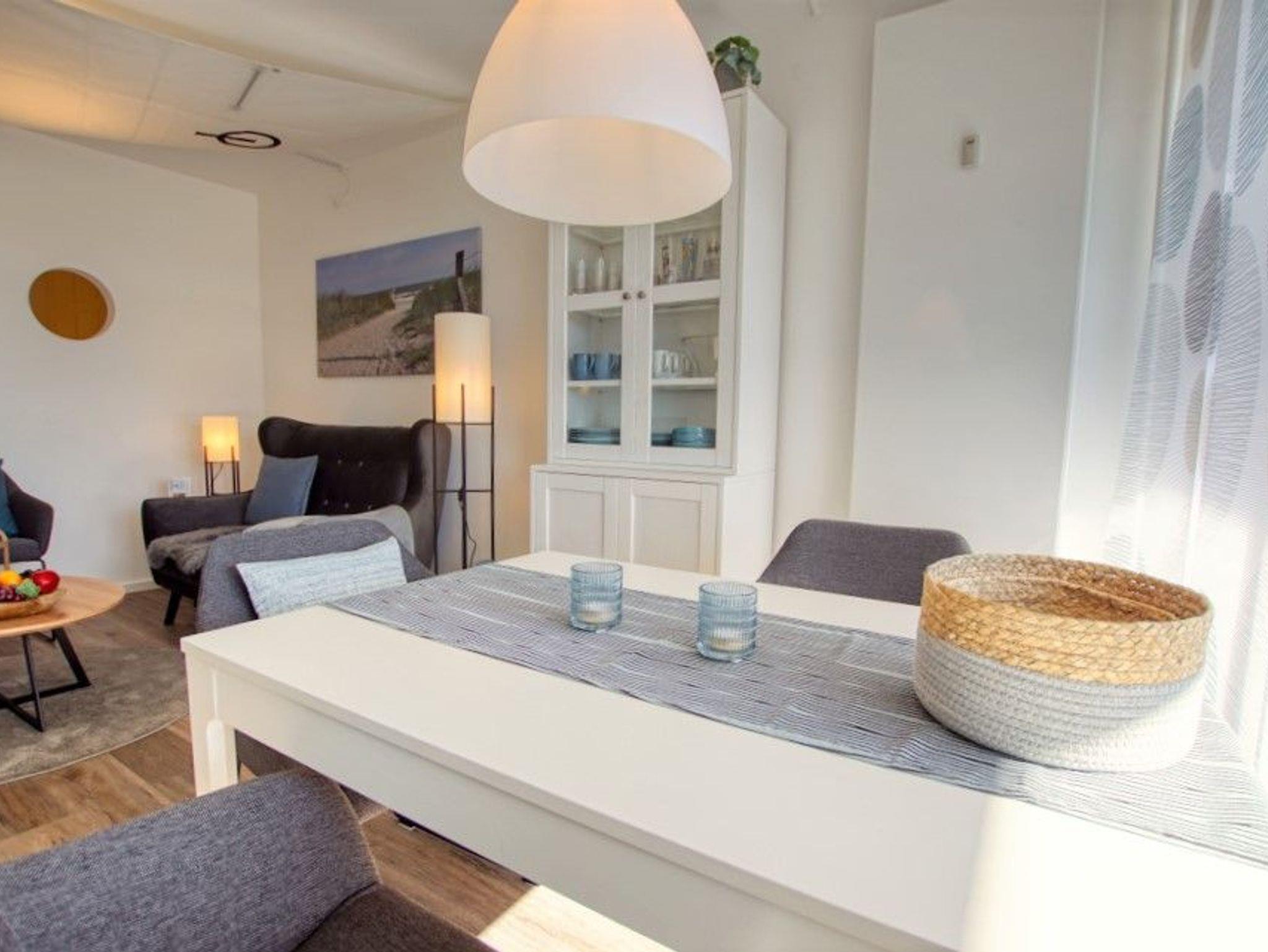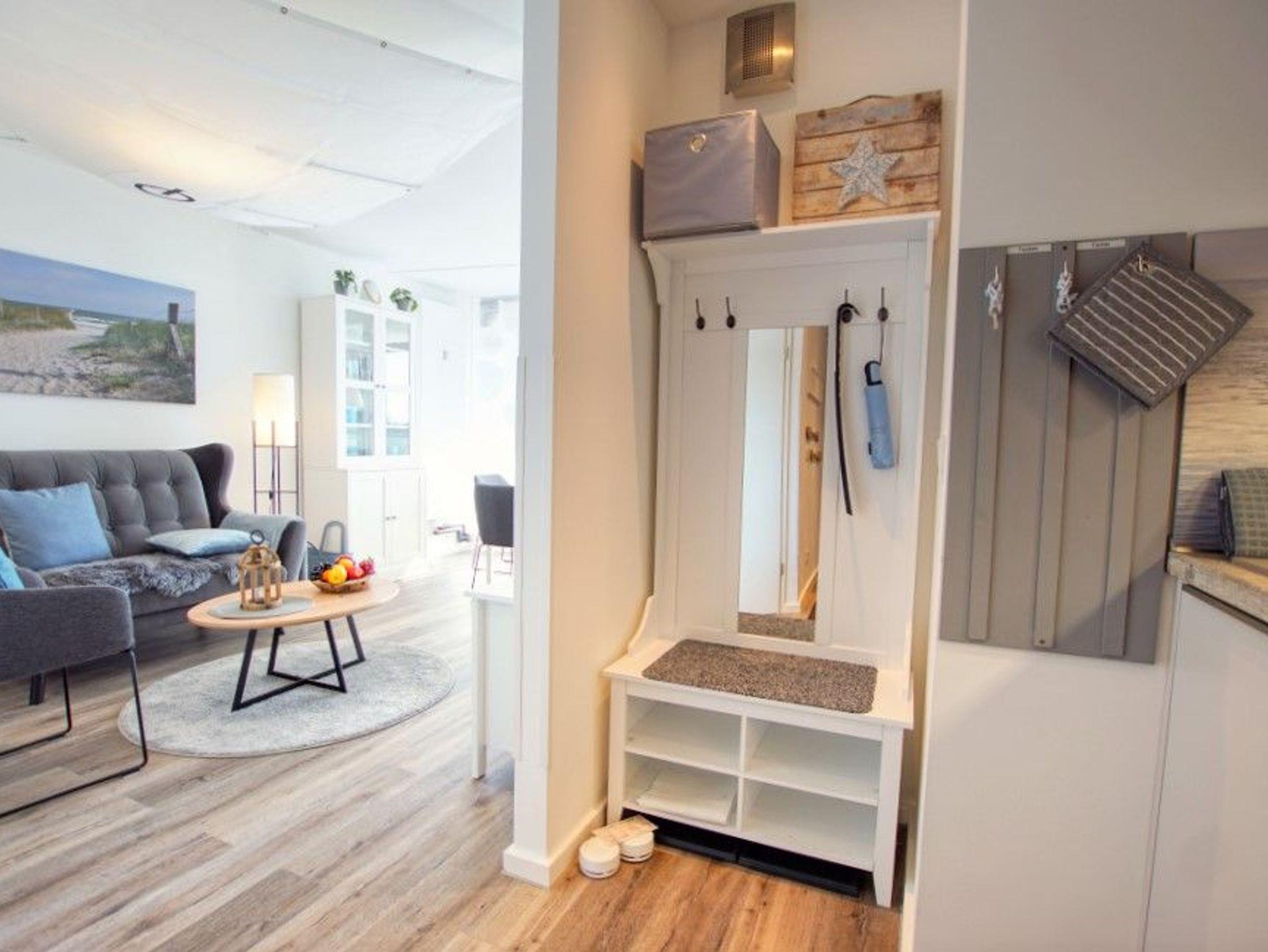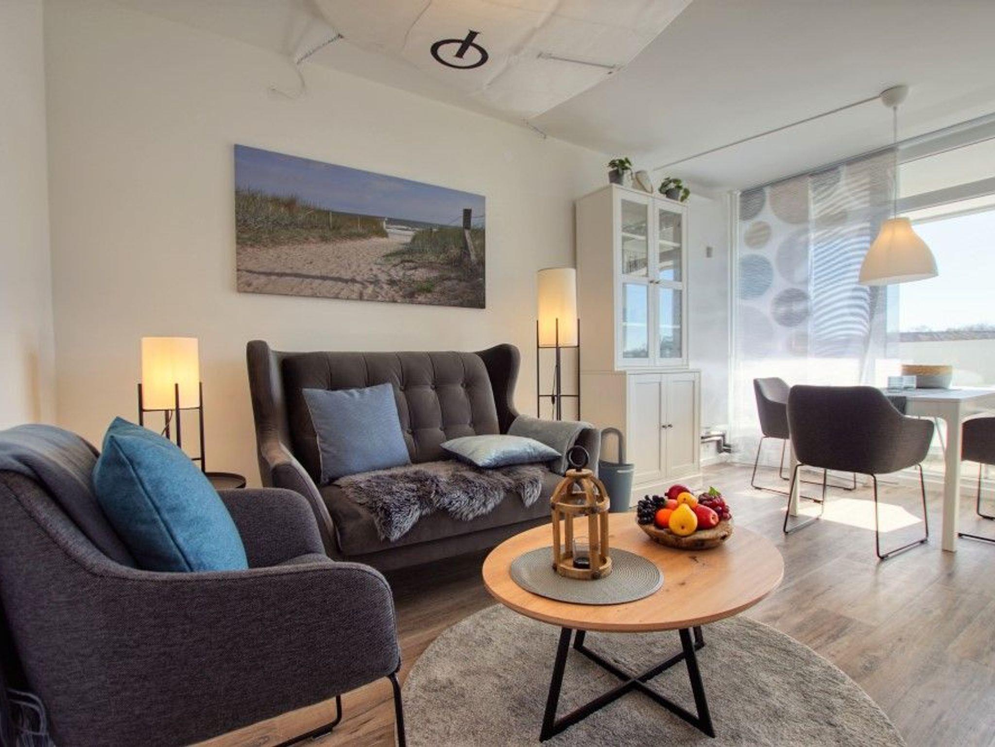 Modernes Appartement im maritimen Stil mit Balkon und Blick auf Salzwiesen im Ferienpark Heiligenhafen.