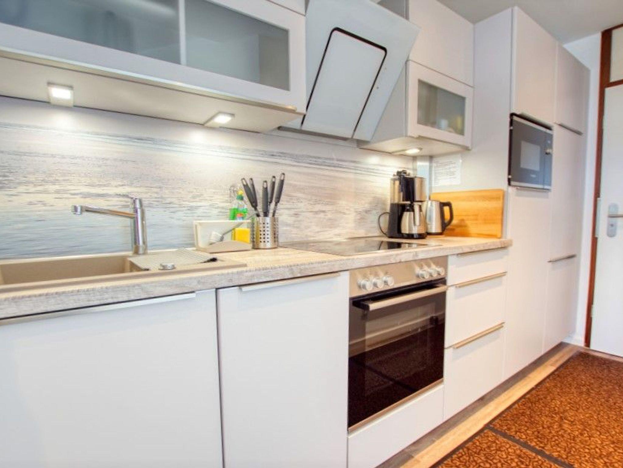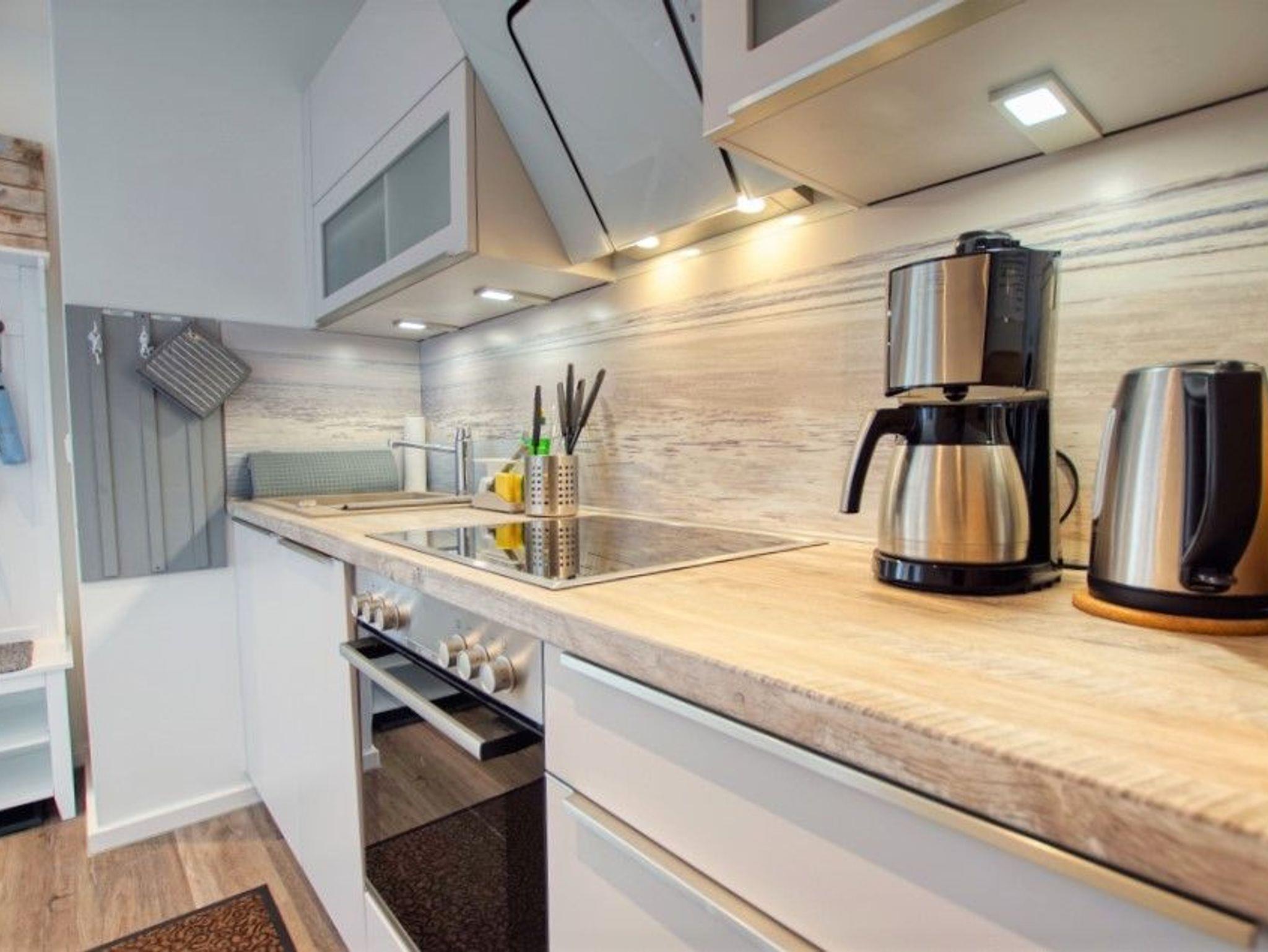 Voll ausgestattete Küche mit Kühlschrank inkl. Gefrierfach, Ceranfeld, Backofen, Mikrowelle und viel Stauraum