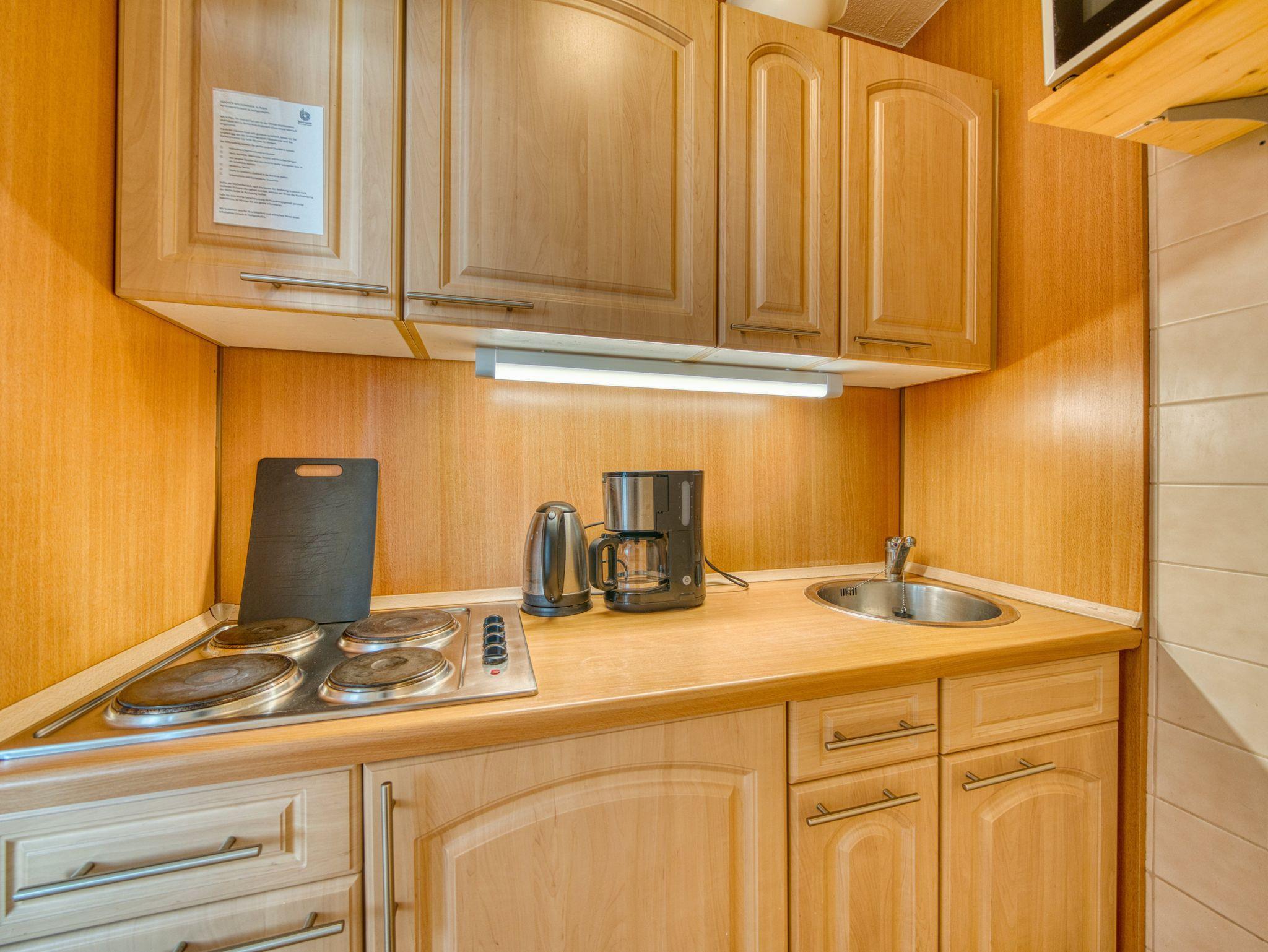 Küche mit praktischer Ausstattung: 4-Plattenherd, Kühlschrank mit Gefrierfach, Mikrowelle, Wasserkocher und Filterkaffeemaschine