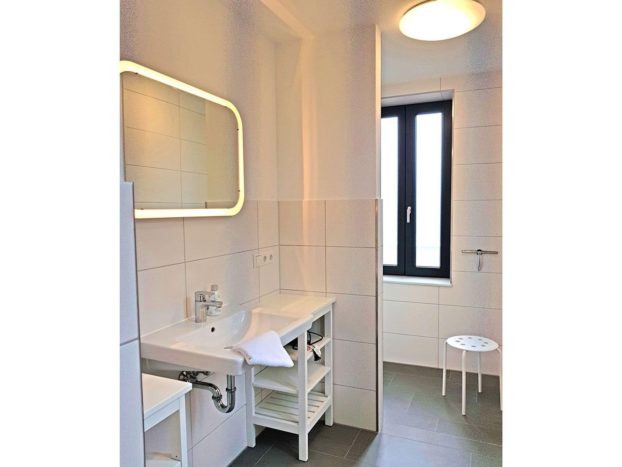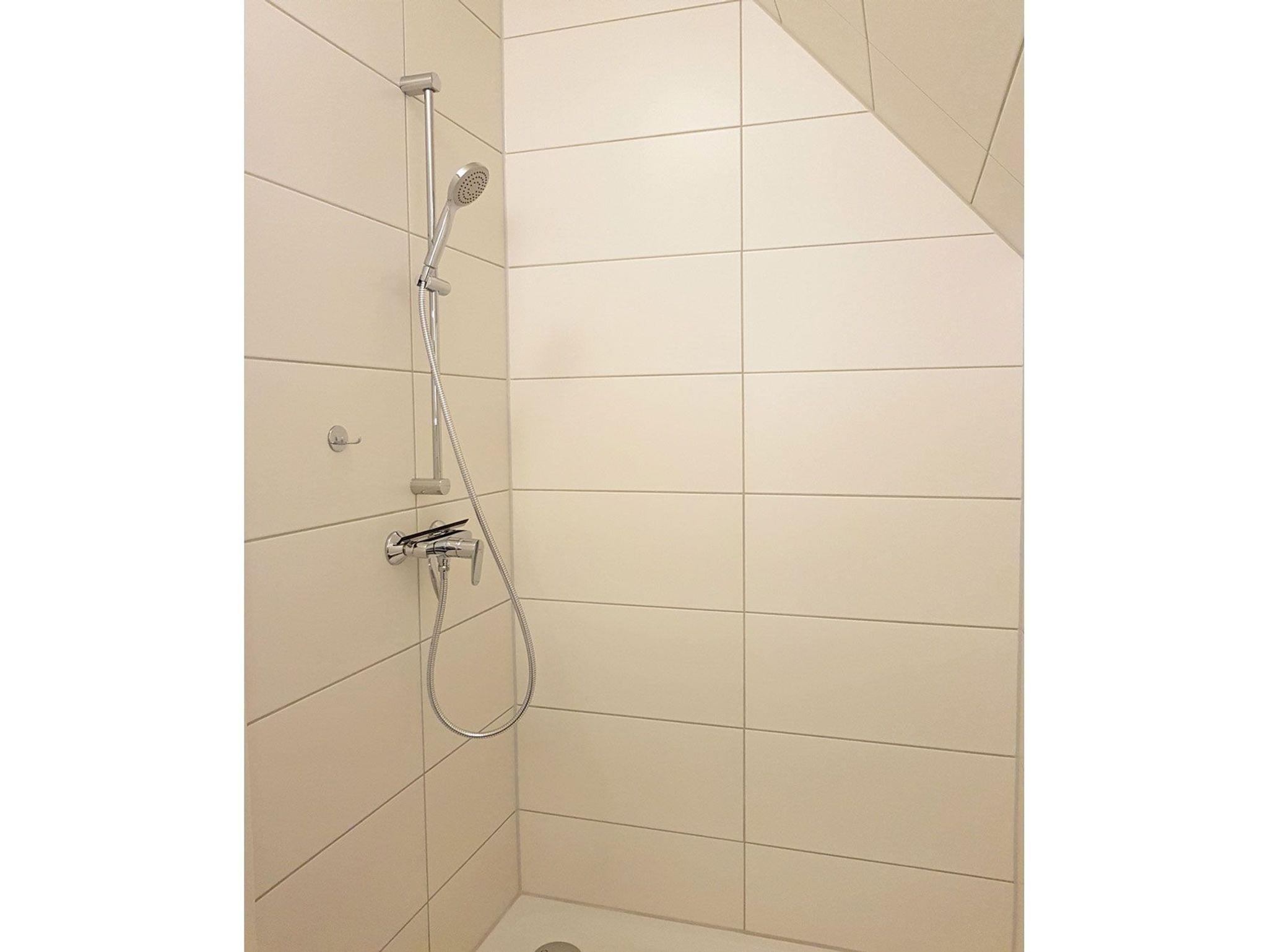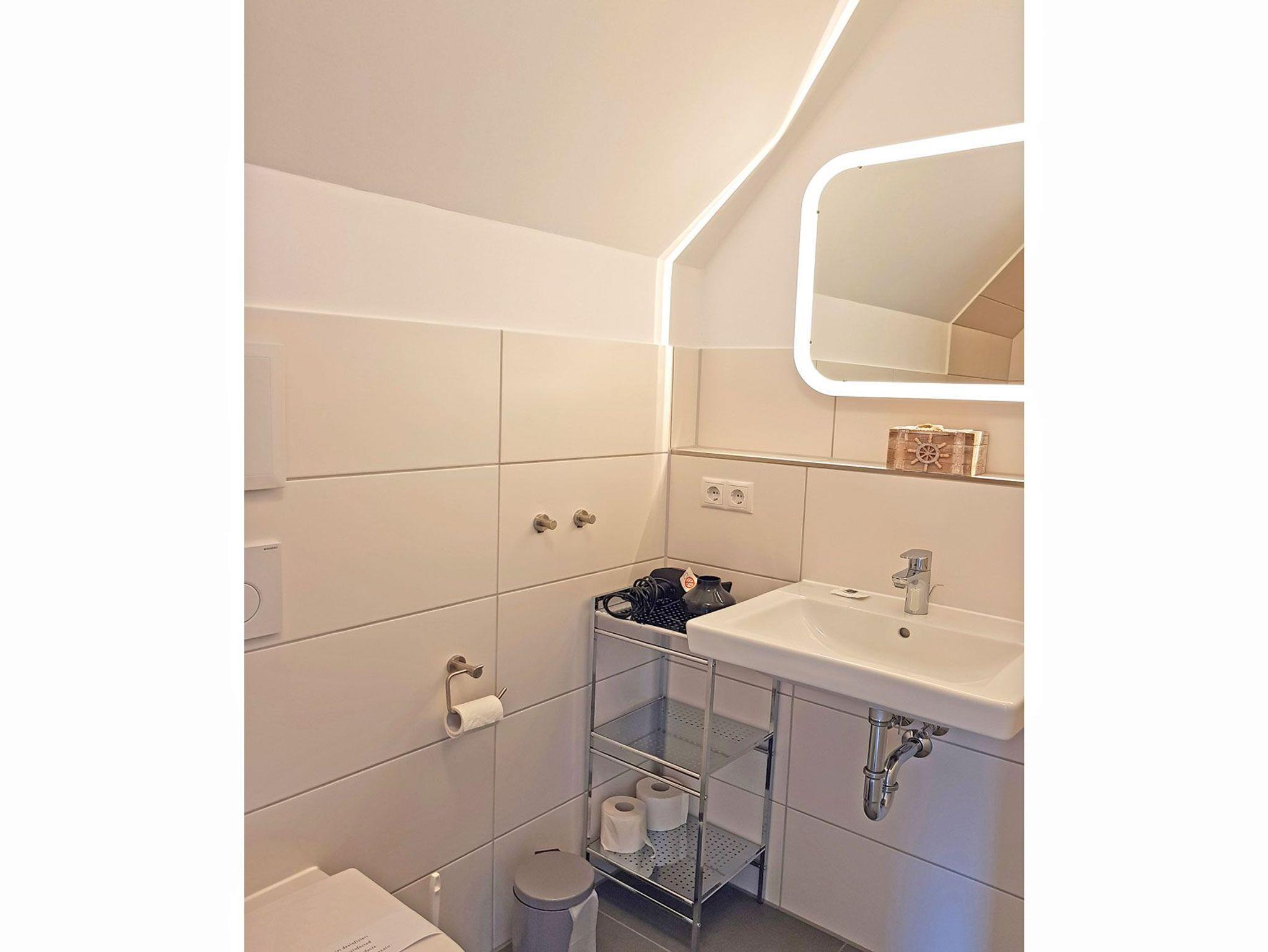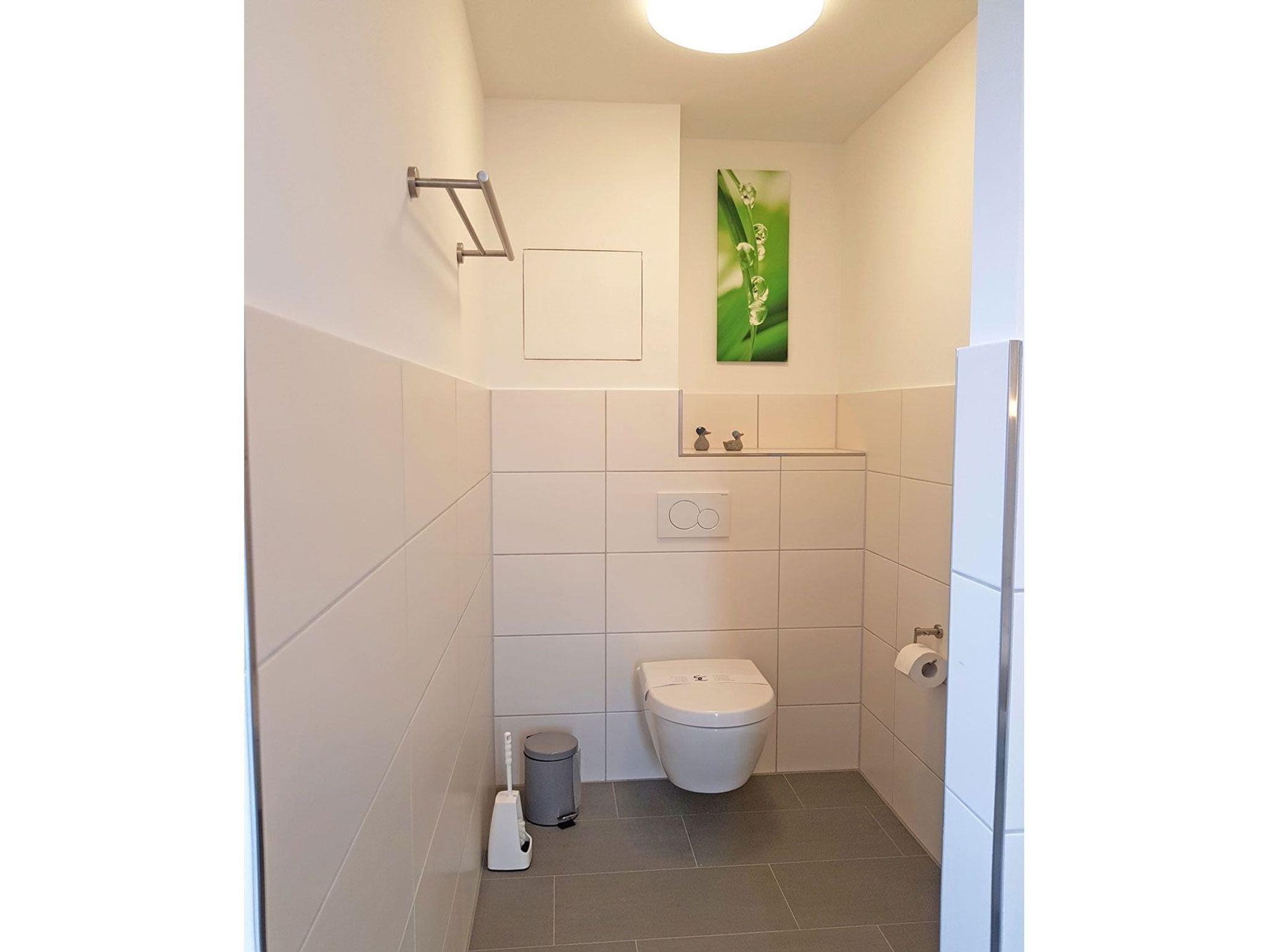 Zwei moderne Bäder mit ebenerdiger Dusche, Handtuchwärmer und WC befinden sich in den oberen Stockwerken und bieten ausreichend Platz für alle Gäste. Nach einem erlebnisreichen Tag können Sie sich hier wunderbar erfrischen und entspannen. Zusätzlich gibt es ein Gäste-WC im Erdgeschoss. Die offene, voll ausgestattete Küche lädt dazu ein, auch im Urlaub kulinarische Köstlichkeiten zuzubereiten. Hier finden Sie alles, was Sie für Ihre Mahlzeiten benötigen, während ein kleiner Abstellraum nebenan zusätzlichen Stauraum für Staubsauger [&] Co. bietet. Eine Waschmaschine sorgt dafür, dass auch längere Aufenthalte angenehm und unkompliziert bleiben.