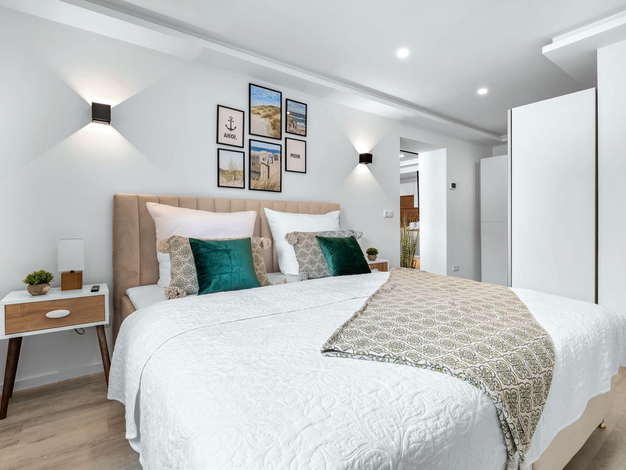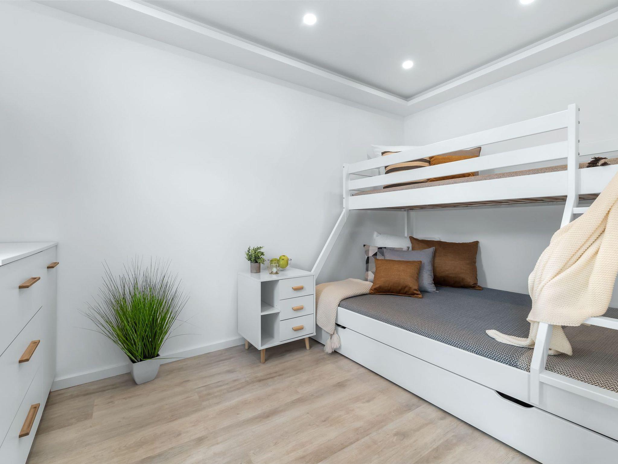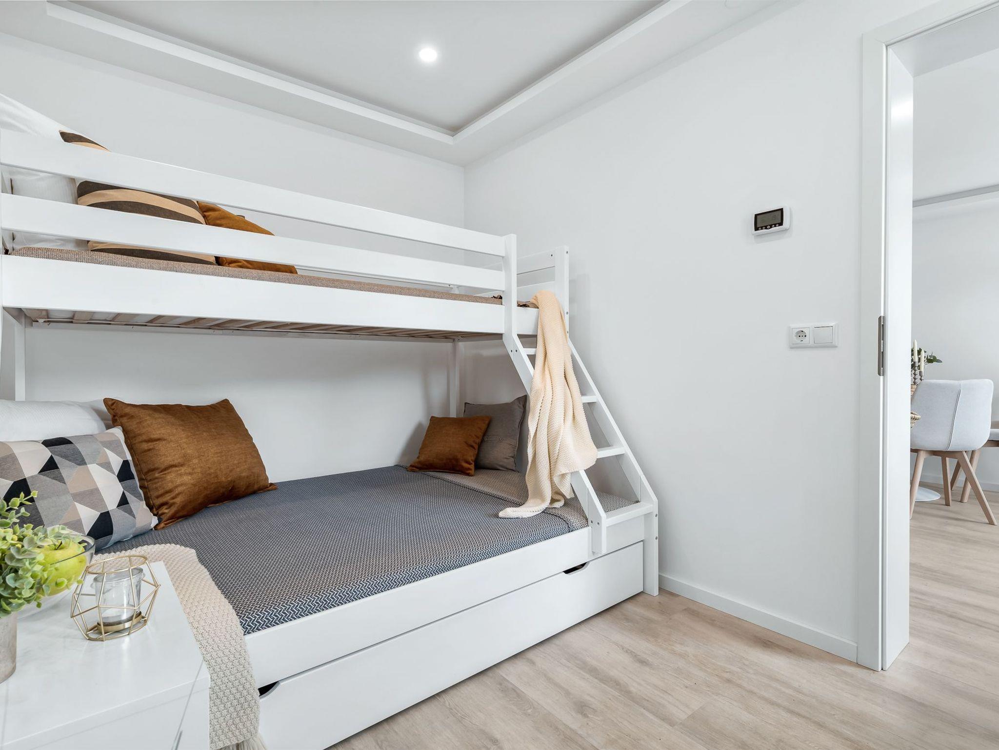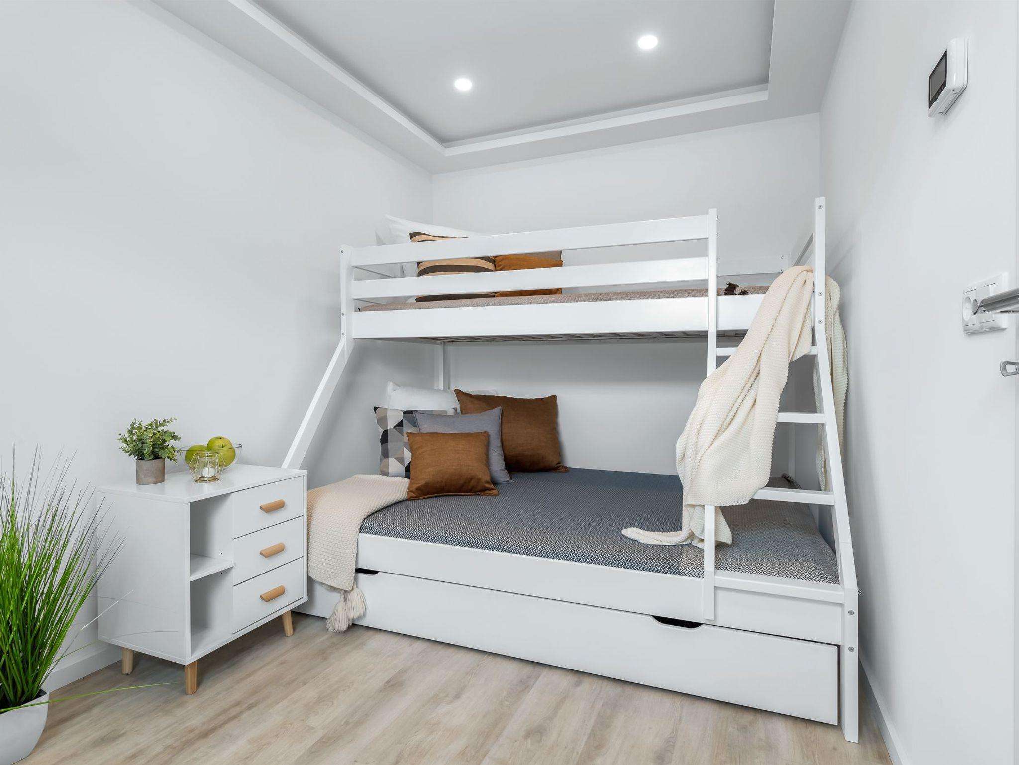 Die offene Küche ist in den Wohnbereich integriert und bietet alle Annehmlichkeiten für eine sorgenfreie Selbstversorgung. Eine Nespresso-Kapselmaschine steht ebenfalls zur Verfügung. Im Schlafzimmer erwartet die Gäste ein bequemes Doppelbett (180x200) und ein zusätzlicher Fernseher. Der große Kleiderschrank bietet ausreichend Platz für Kleidung. Im zweiten Schlafzimmer befindet sich ein Etagenbett (geeignet für Kinder), das auch ausziehbar ist. Hier können bis zu 3 Kinder schlafen. Elektrische Außenjalousien sorgen für Verdunklung und Sichtschutz.