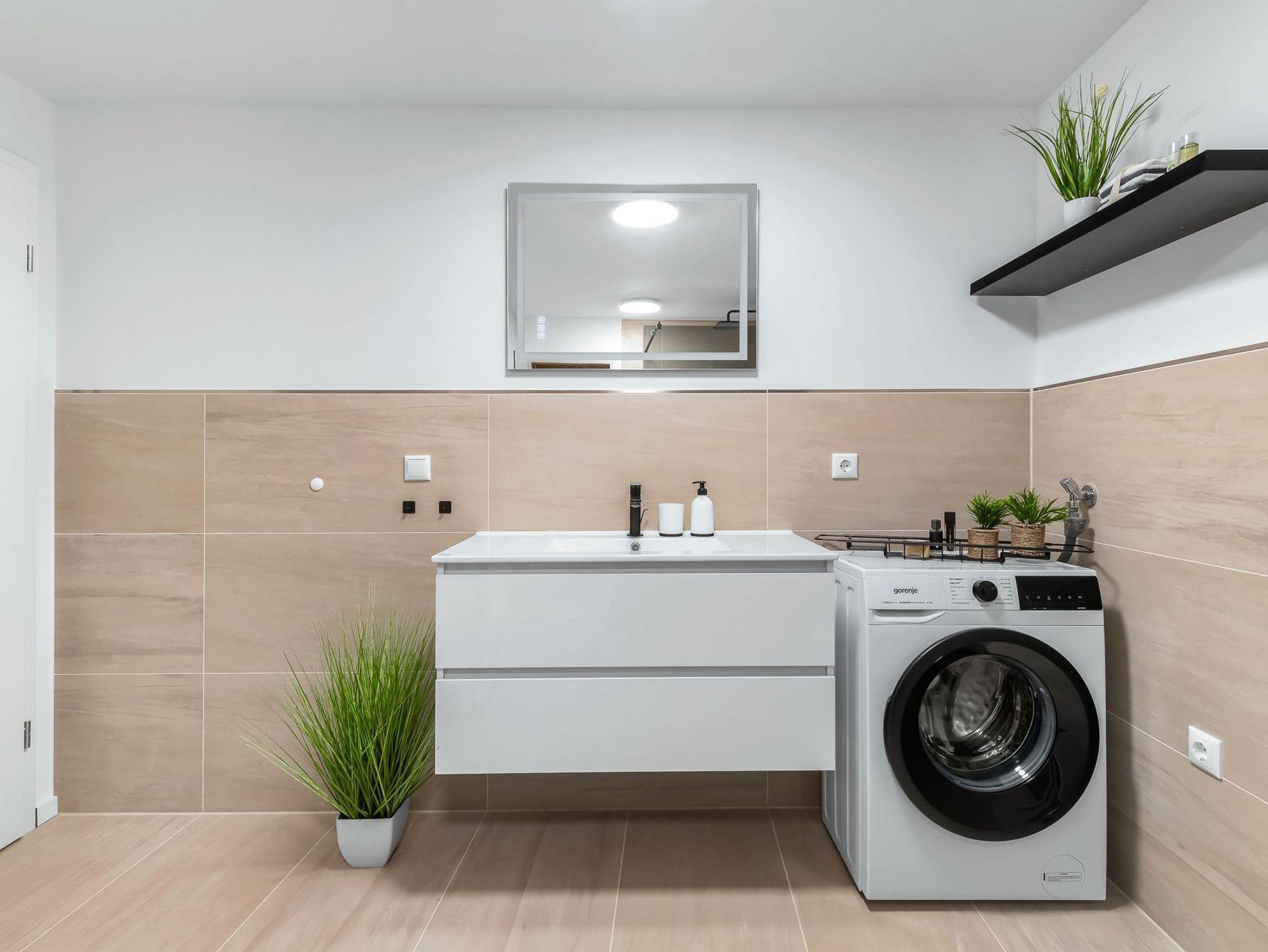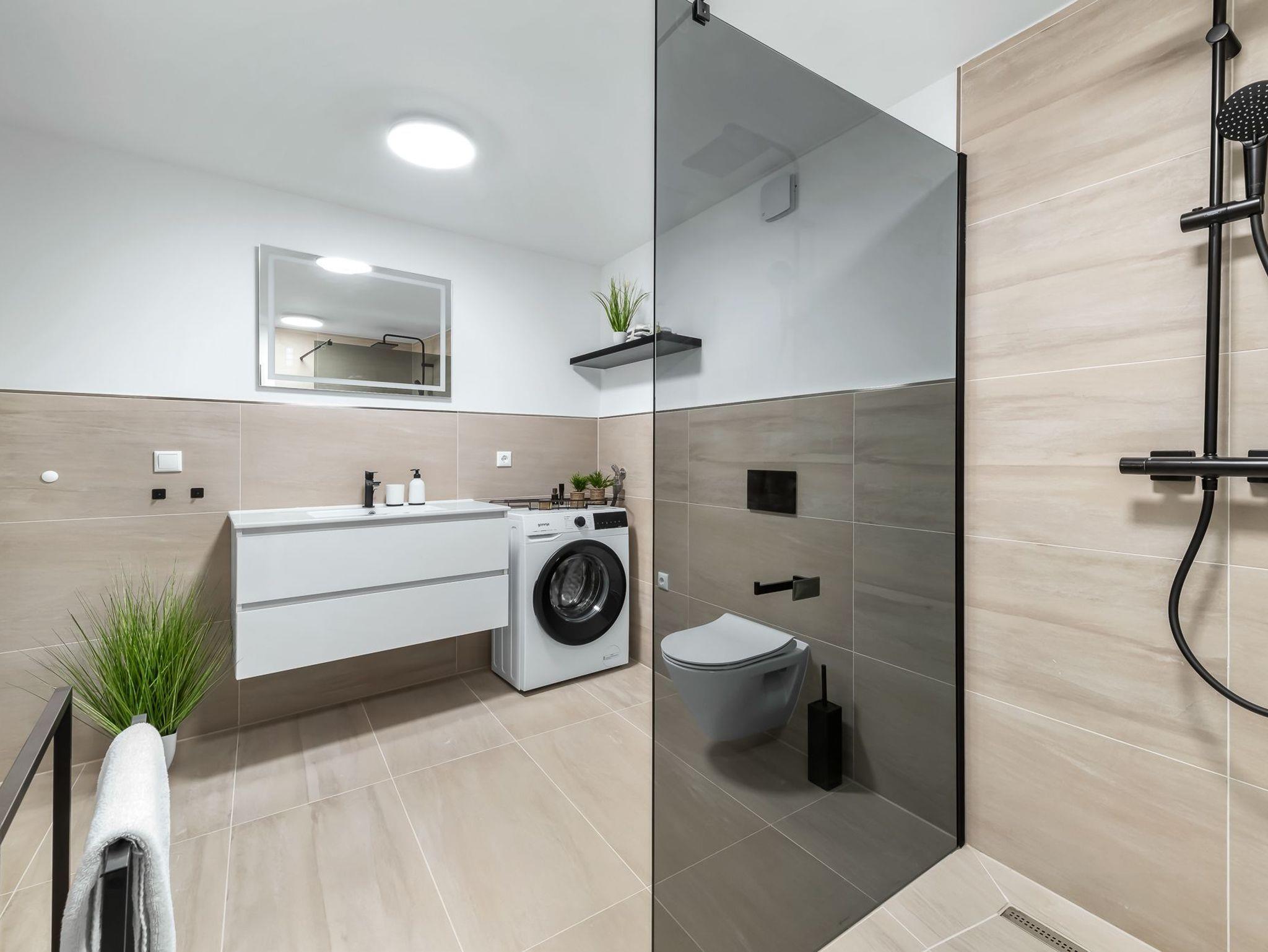 Das moderne Duschbad verfügt über eine ebenerdige Dusche, ein WC, ein Waschbecken und eine Waschmaschine. Die dort integrierte Sauna befindet sich zudem direkt neben dem Schlafzimmer und sorgt für zusätzlichen Komfort oder Zeit für Wellness.