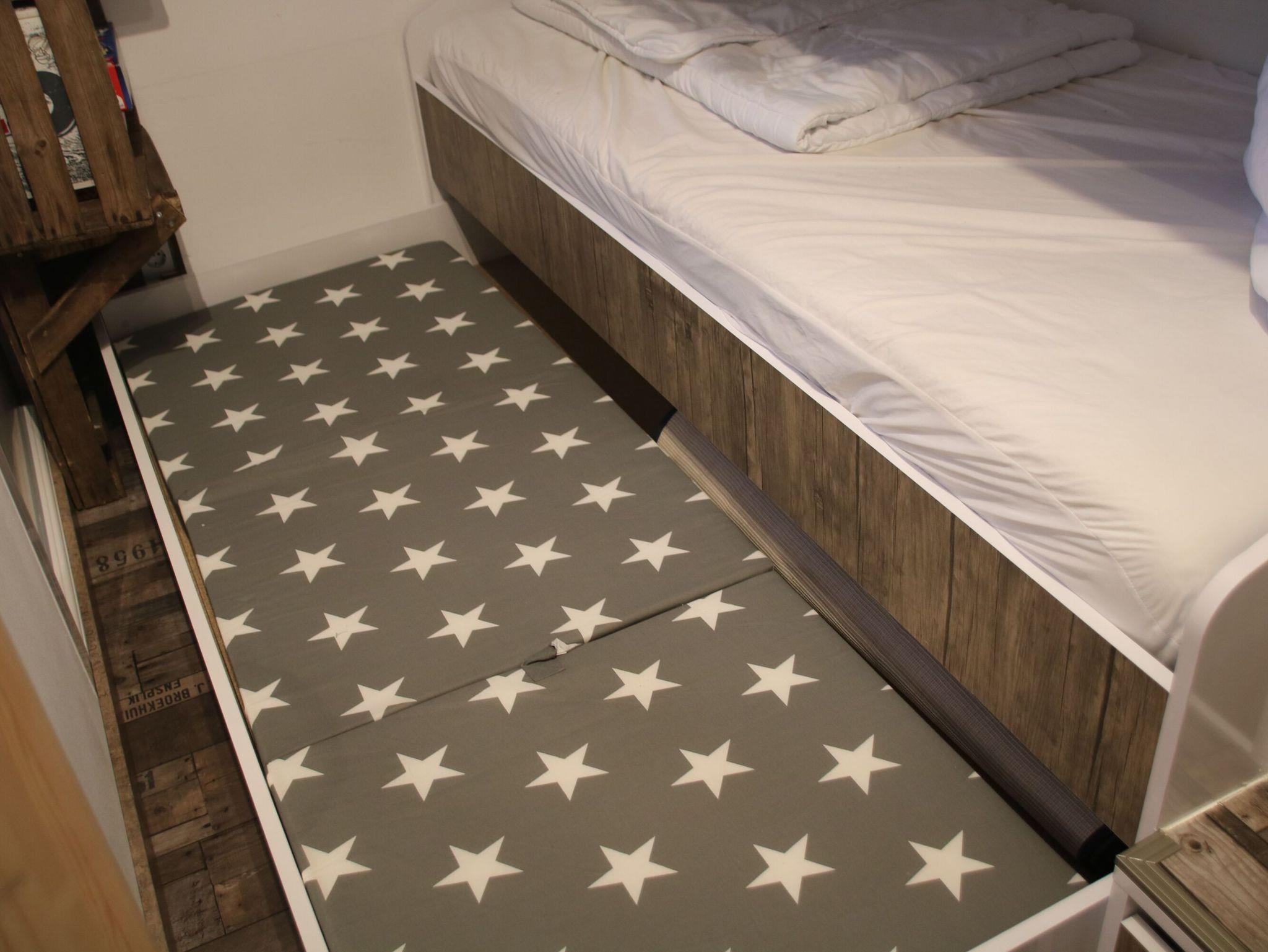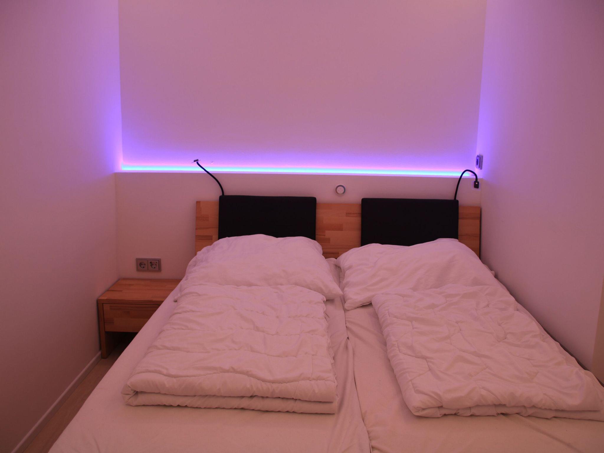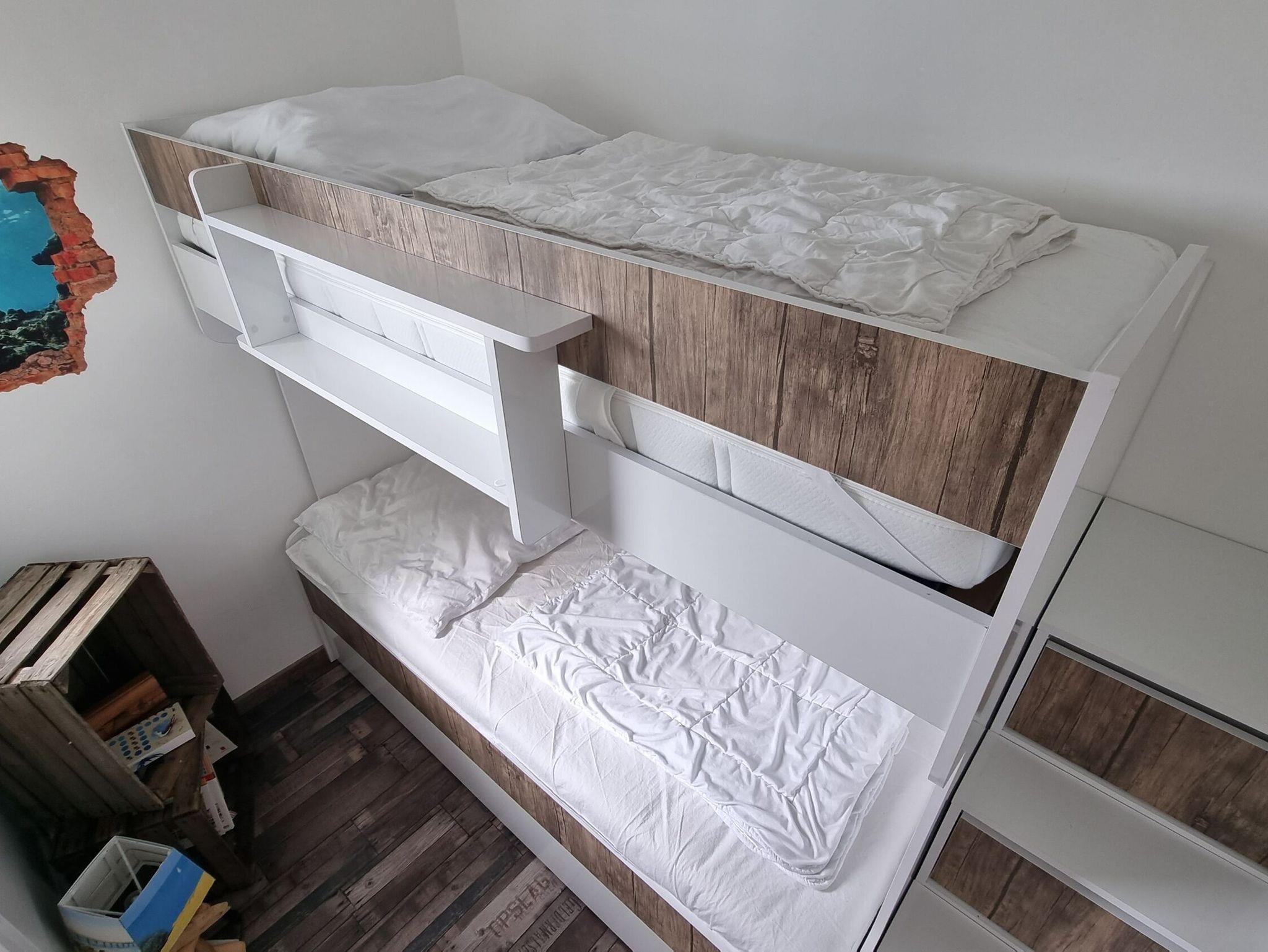Zur Wohnung gehört ein Schlafzimmer mit Doppelbett (160×200m), ein Kinderzimmer mit Etagenbett, ein Badezimmer mit WC und Dusche sowie eine offene Küche mit Wohnbereich. Für eine weitere erwachsene Person steht ein Schlafsofa zur Verfügung. Sollte ein weiteres Kind mit anreisen, kann dieses auch auf einer Schlafmatratze im Kinderzimmer nächtigen.