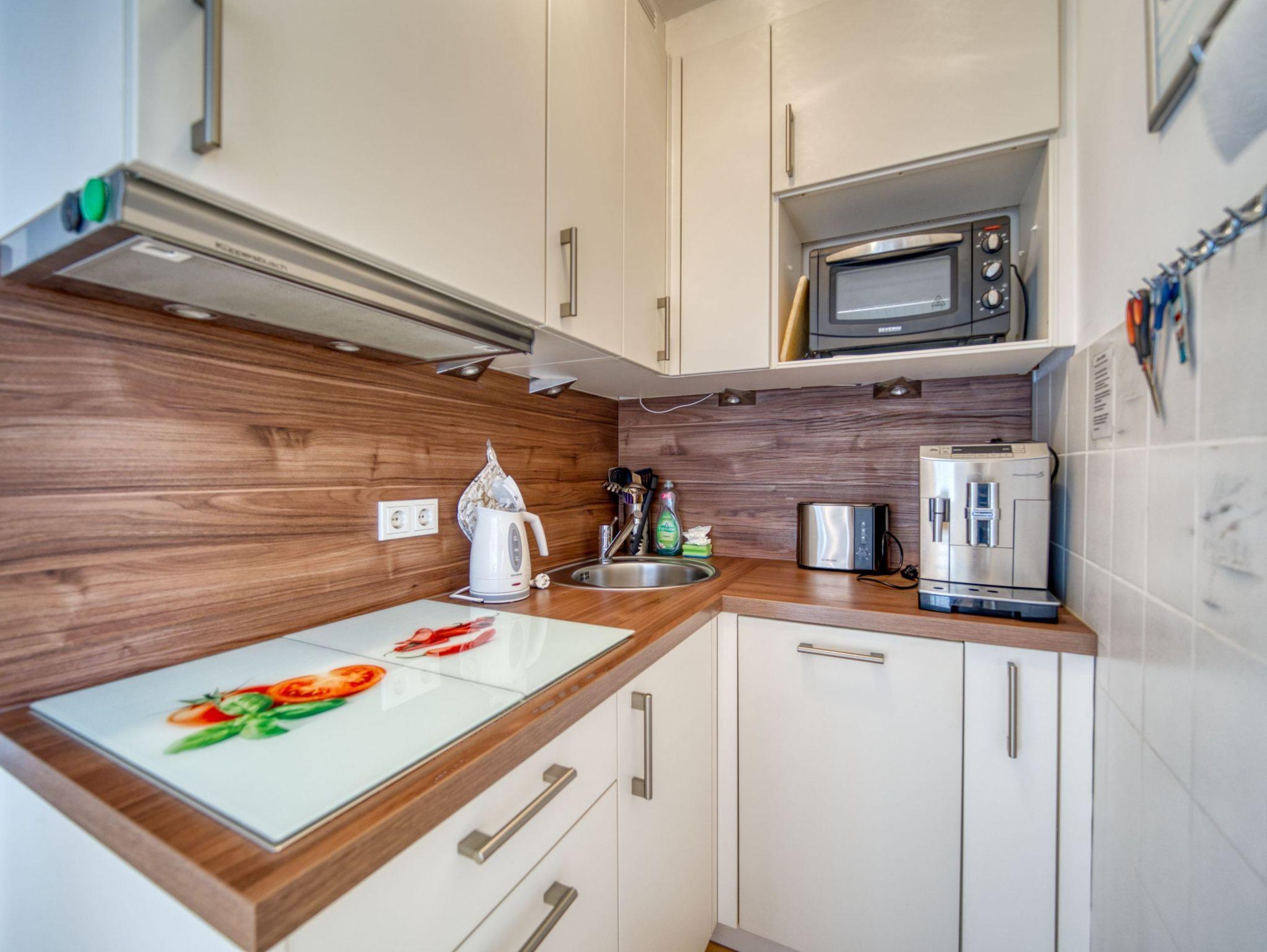 Küche mit Ceranfeld, Mikrowelle, Geschirrspüler und Kaffeevollautomat