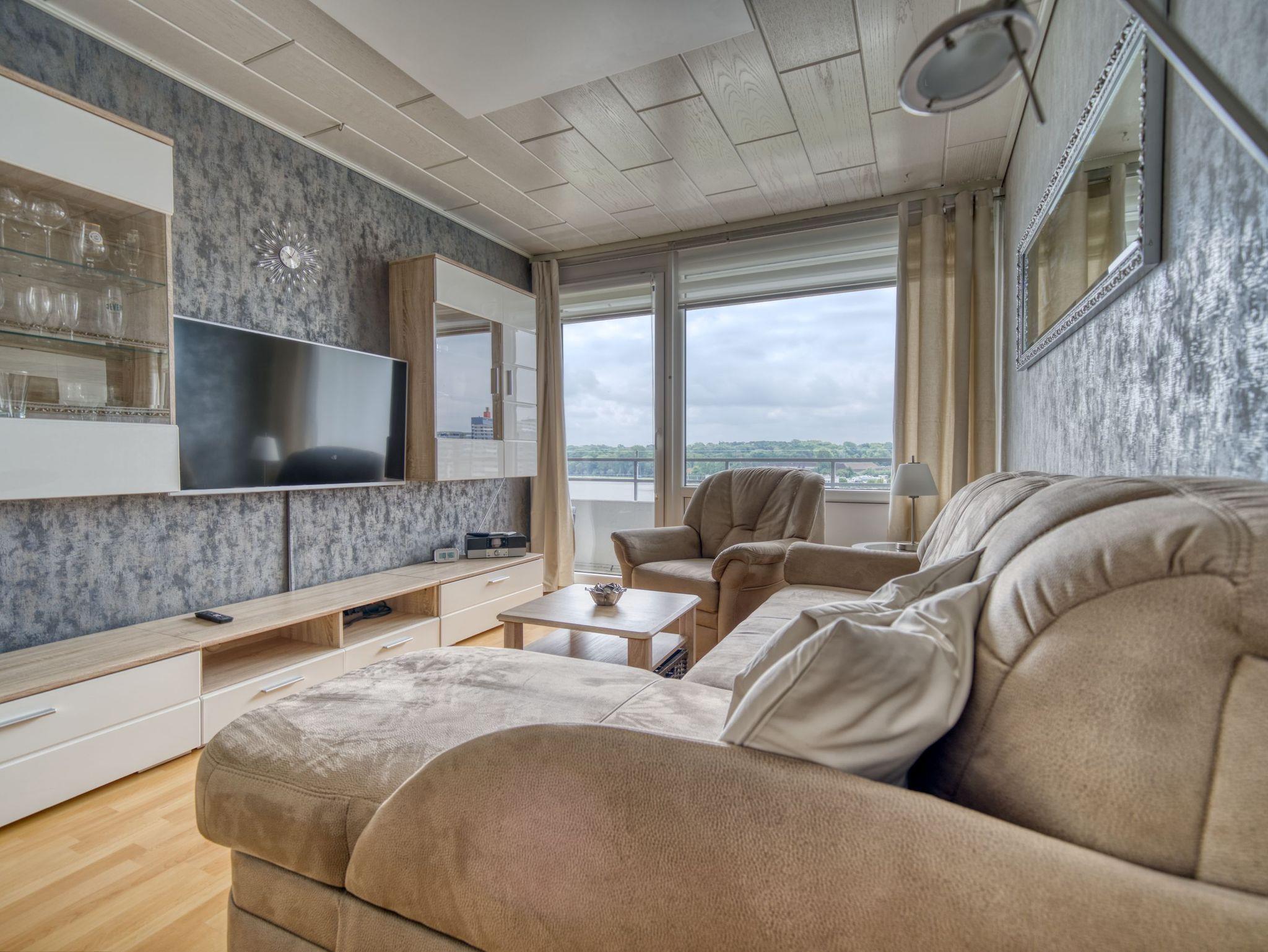 Wohnzimmer mit gemütlicher Couch, die als zusätzliche Schlafmöglichkeit genutzt werden kann