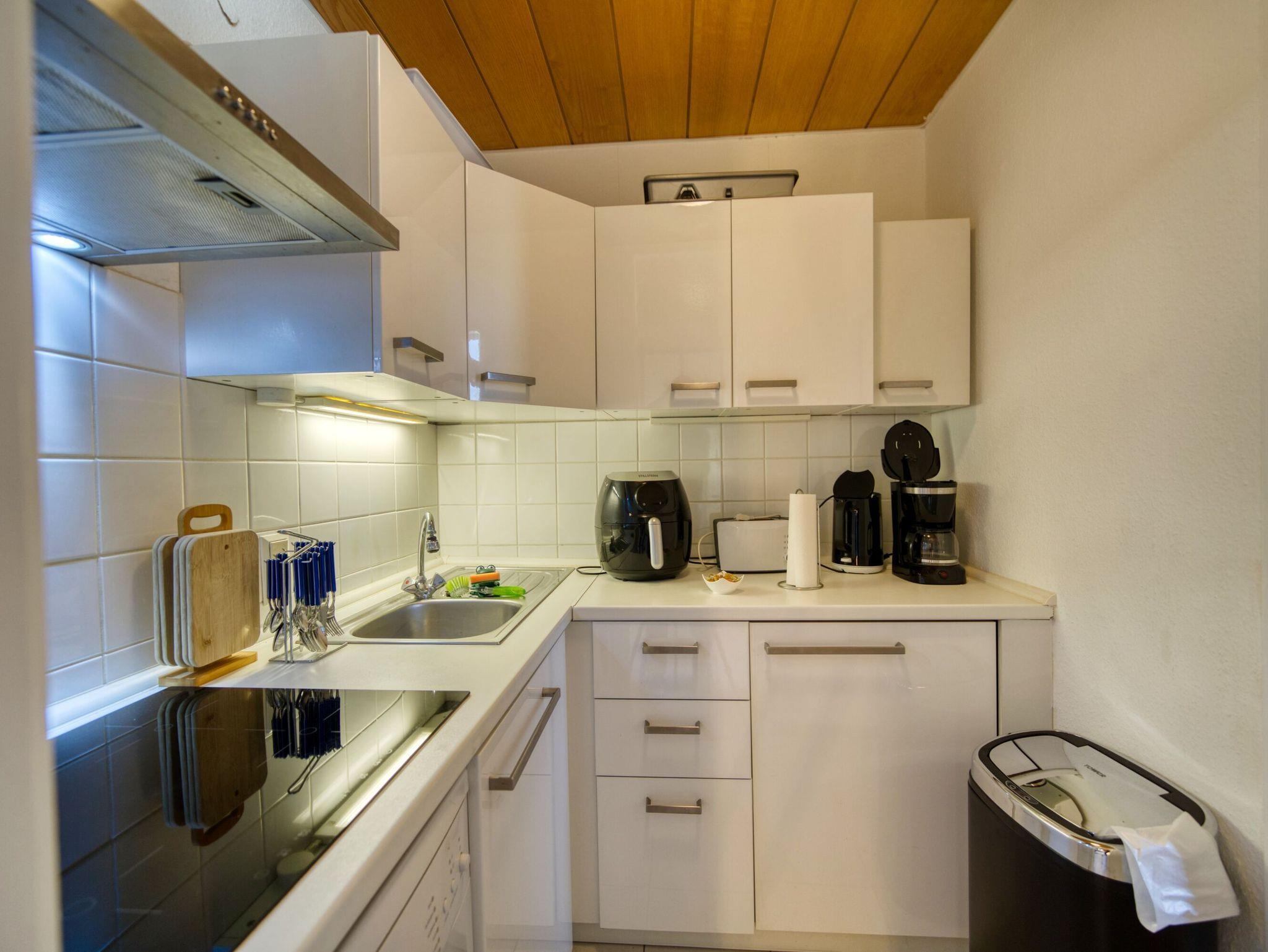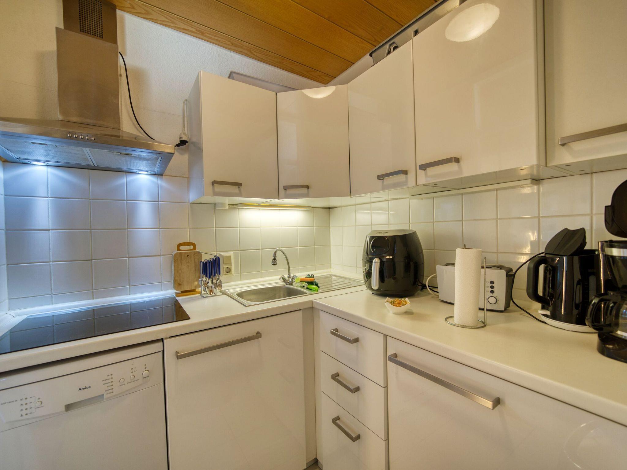 Küche mit Induktionsherd, Backofen, Geschirrspüler, großem Gefrierschrank (120?l), Kühlschrank, Mikrowelle, Wasserkocher, Toaster und Kaffeemaschine