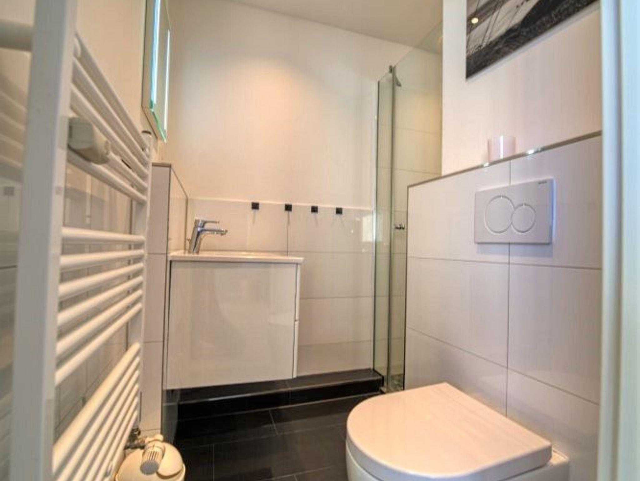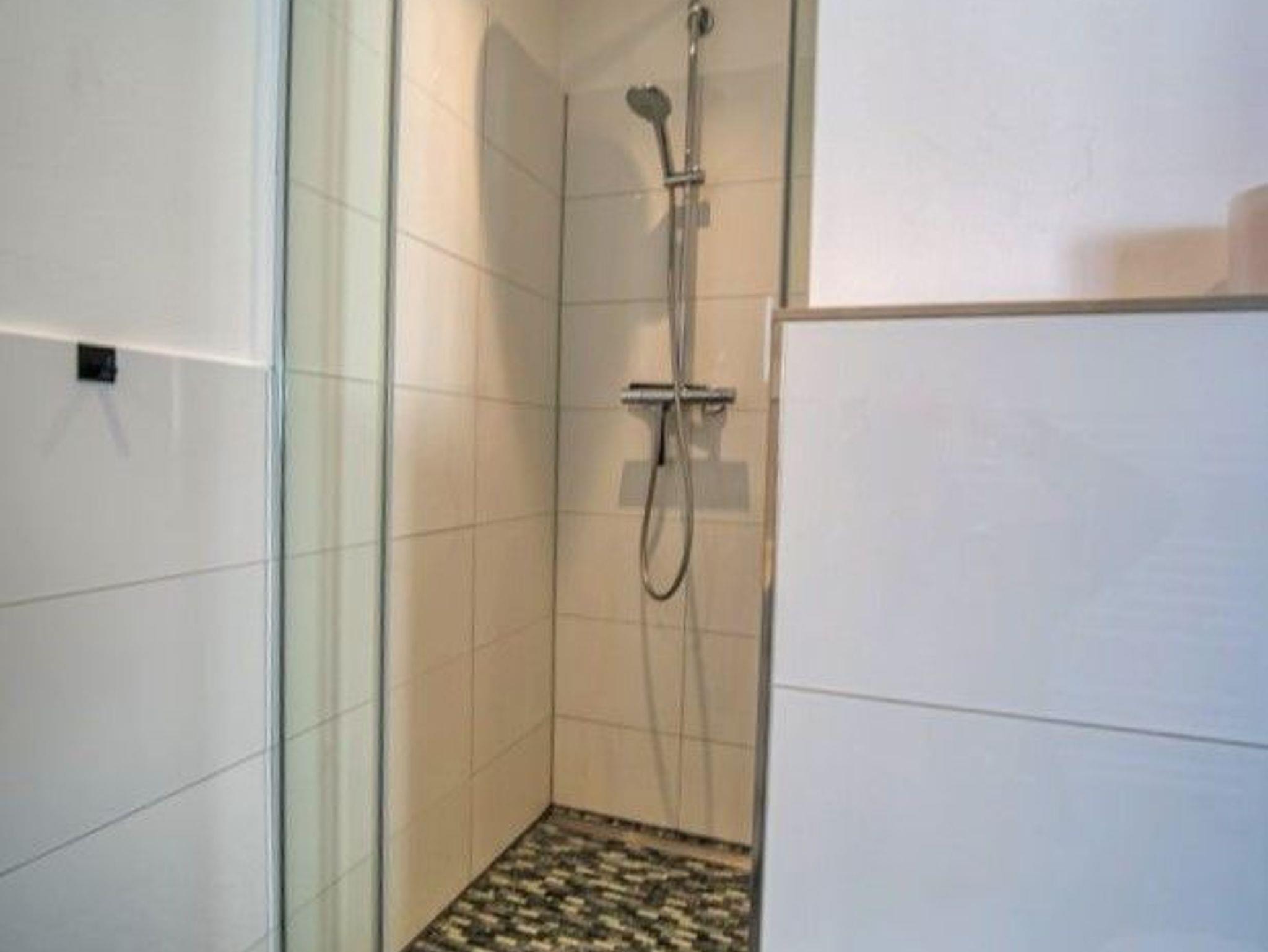 Modernes Bad mit Duschkabine mit niedrigem Einstieg, WC und Handtuchtrockner