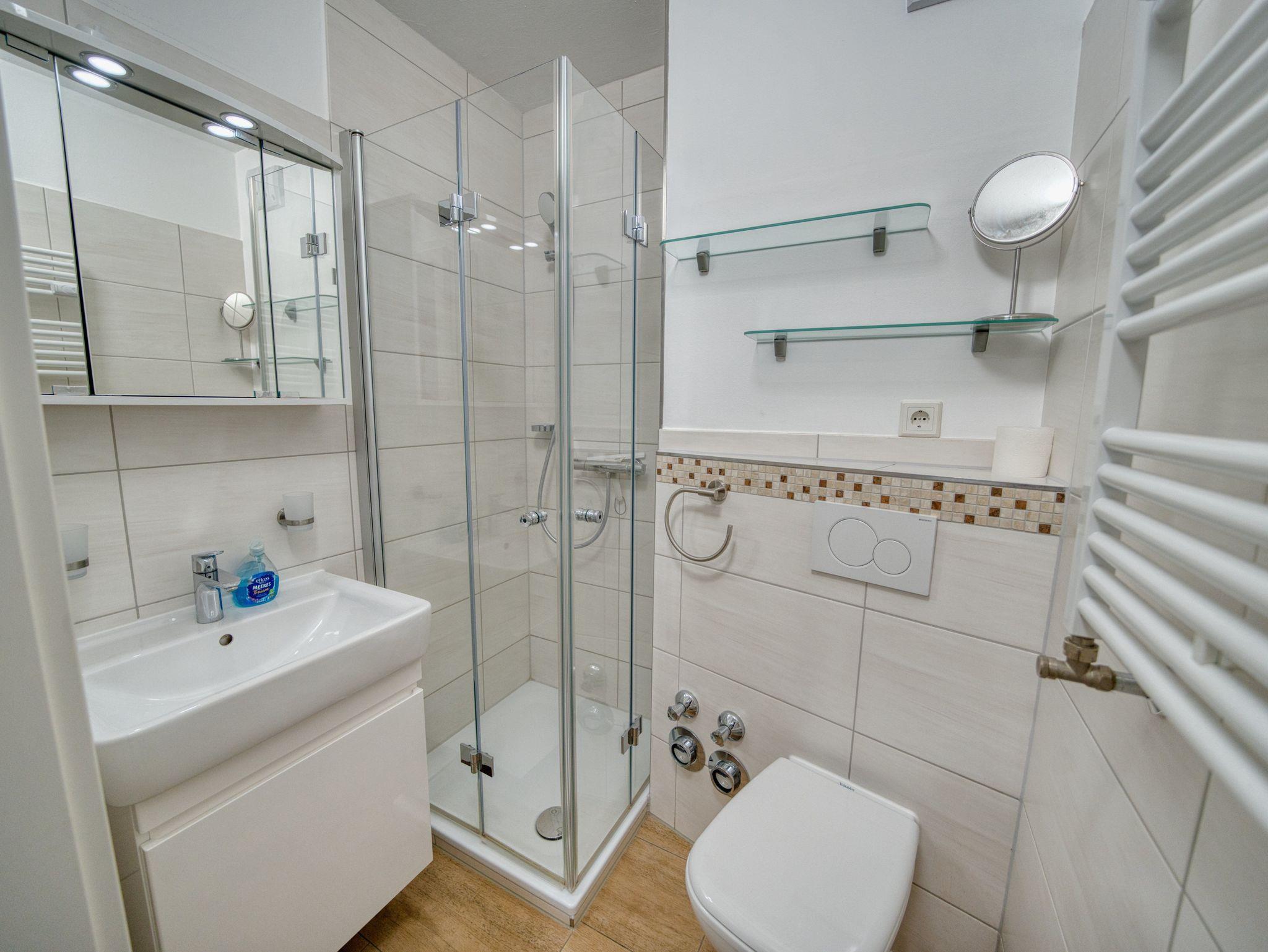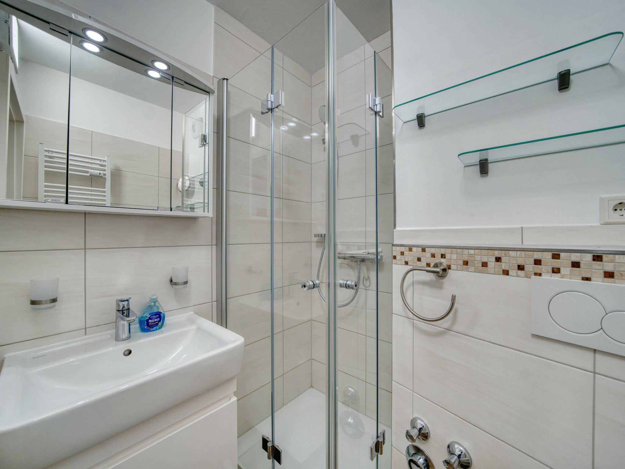 Bad mit moderner Dusche (niedriger Einstieg, Glastrennwand, Thermostatarmatur), Waschtisch mit Unterschrank und Spiegelschrank