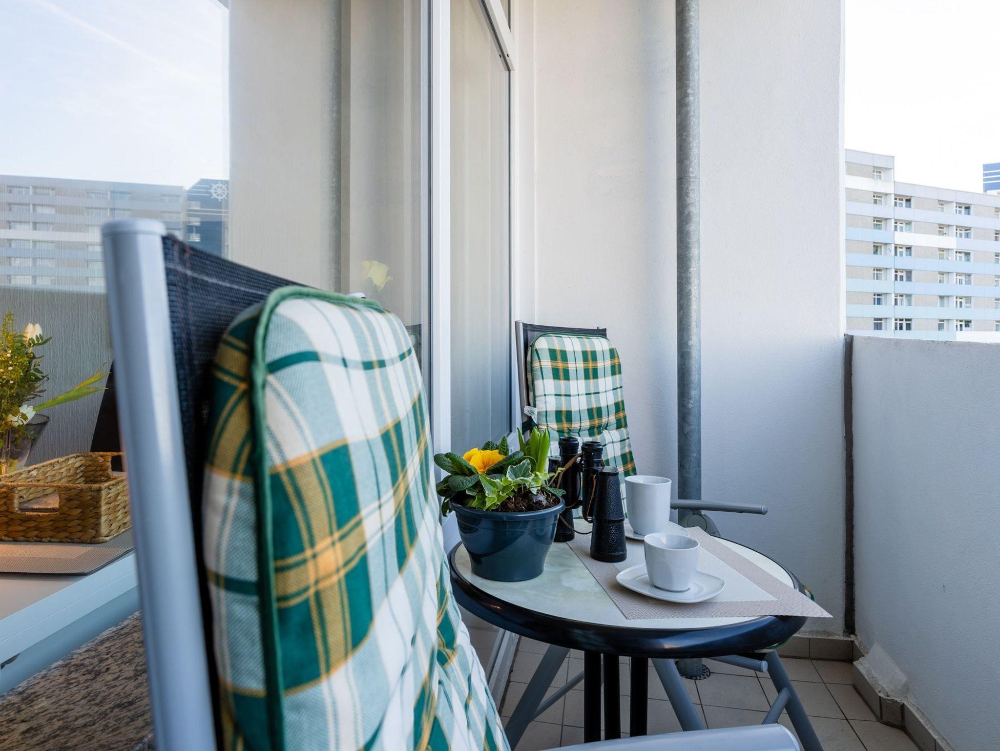 Balkon mit Blick auf Innenhof und Teil-Ostsee