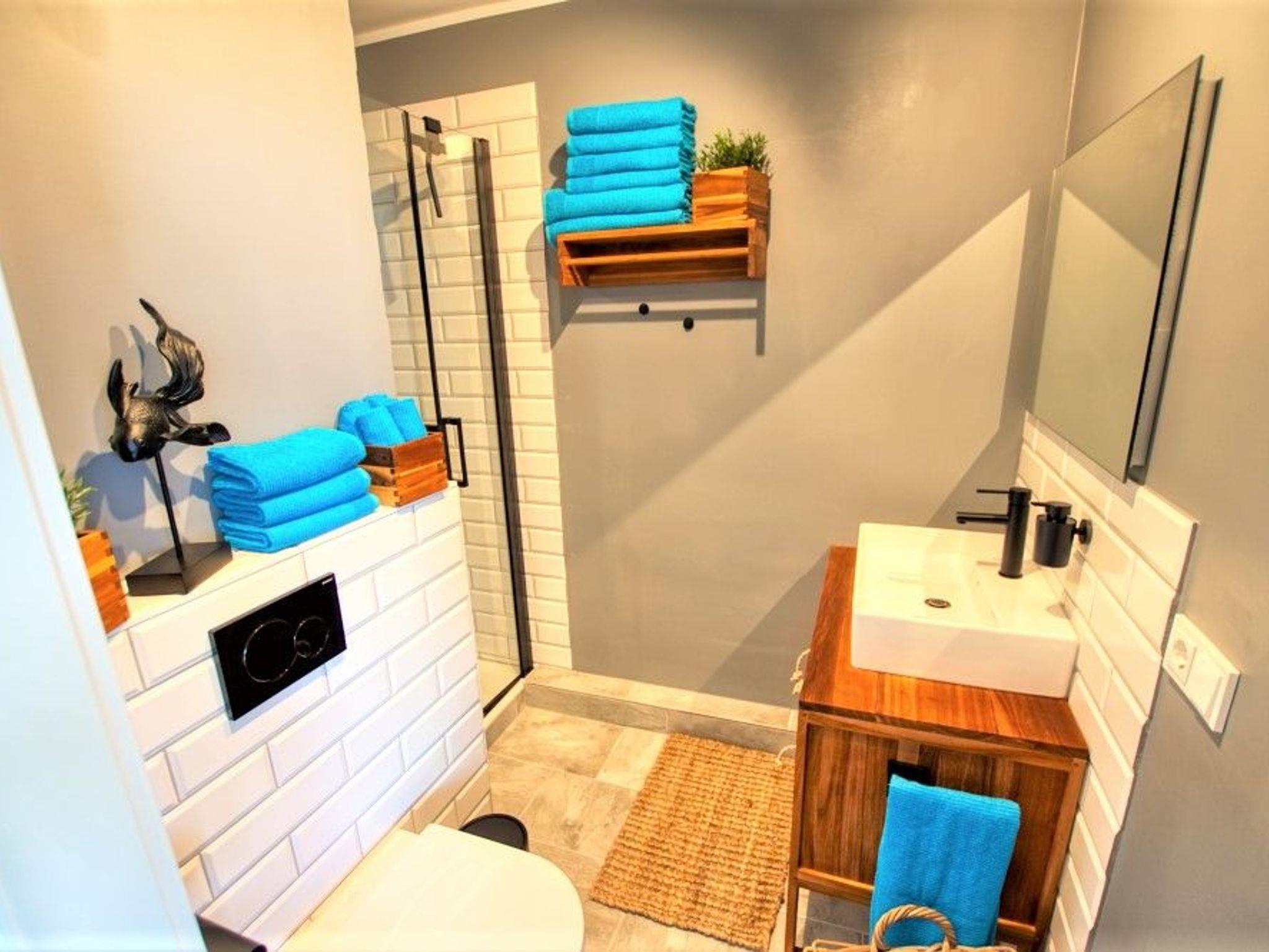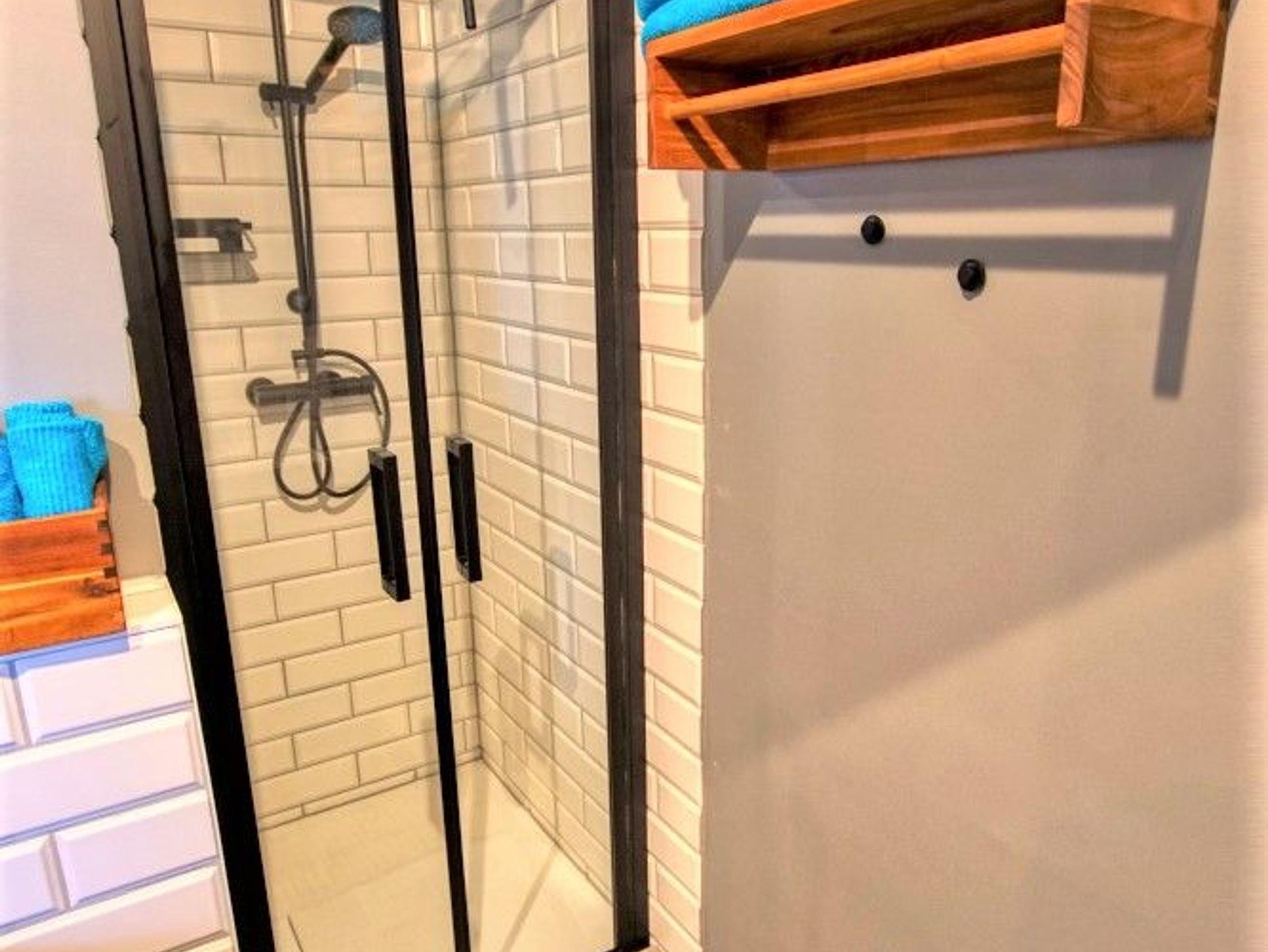 Badezimmer mit Duschkabine mit niedrigem Einstieg, Handtuchtrockner und WC
