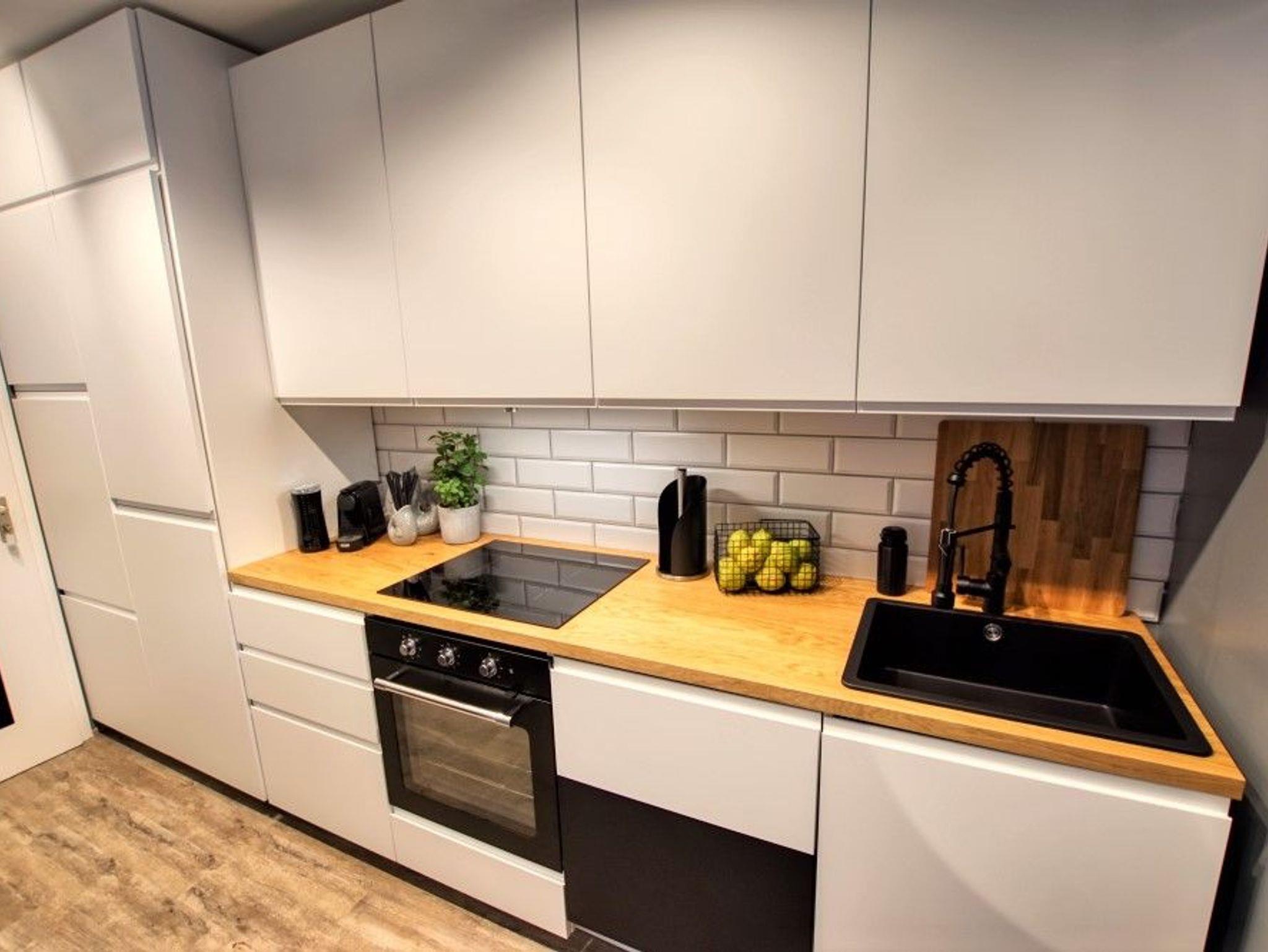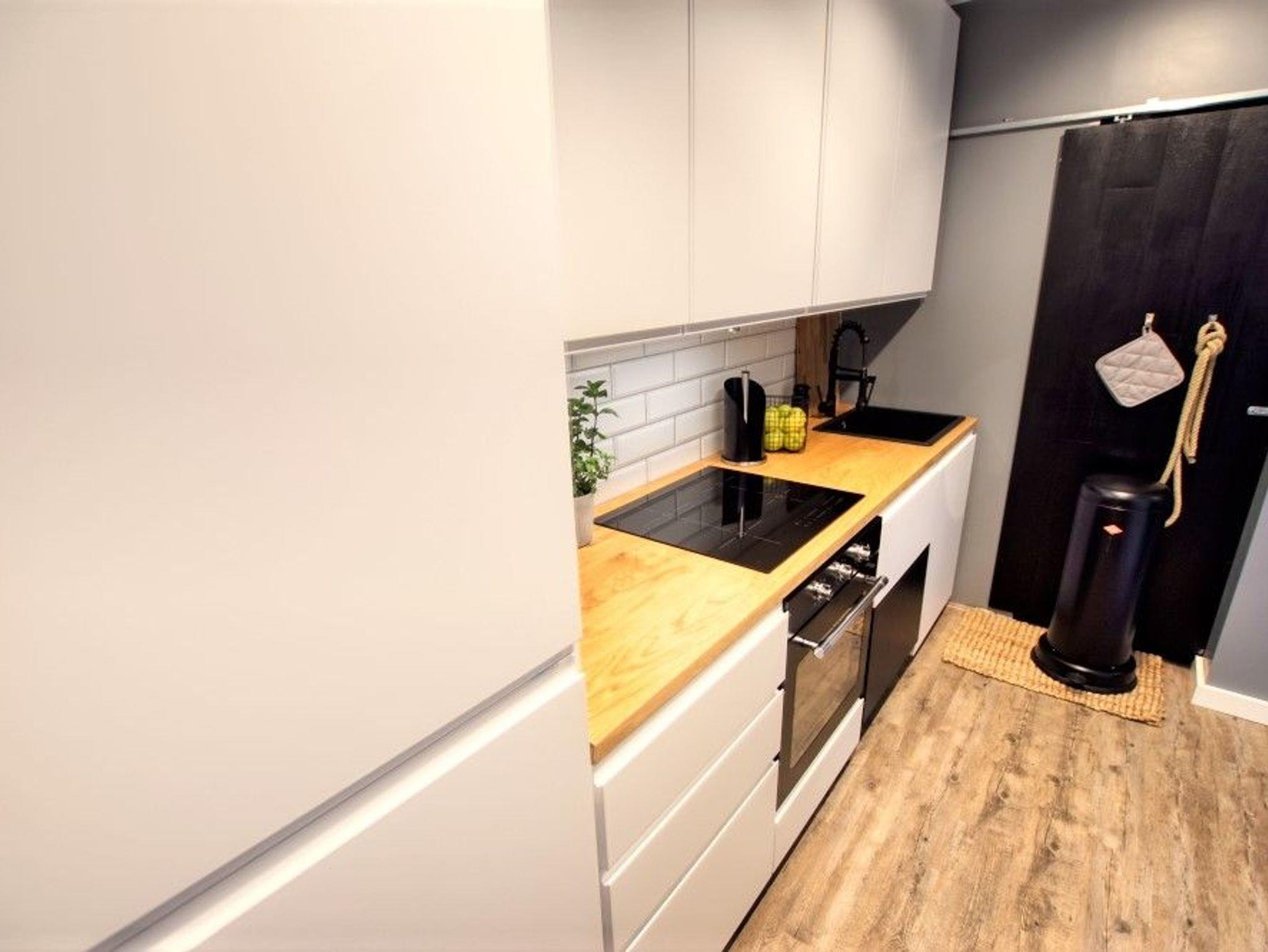 Küche mit Induktionsherd, Kühlschrank mit Gefrierfach, Geschirrspüler, Backofen, Mikrowelle, Kaffeemaschine, Wasserkocher und Toaster