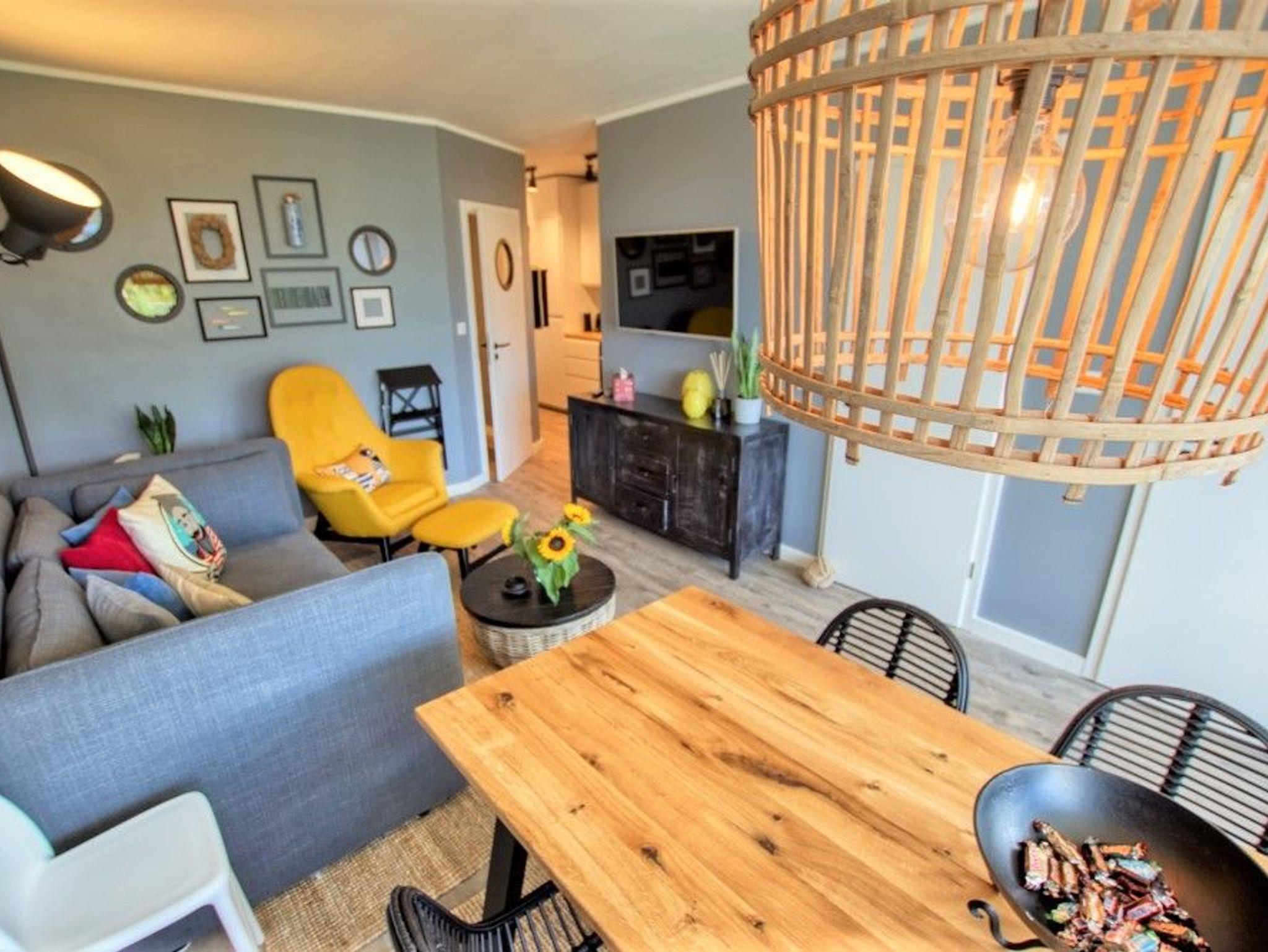 Wohnzimmer mit Schlafsofa (für 2 Personen), Smart-TV und Esstisch vor dem Balkon
