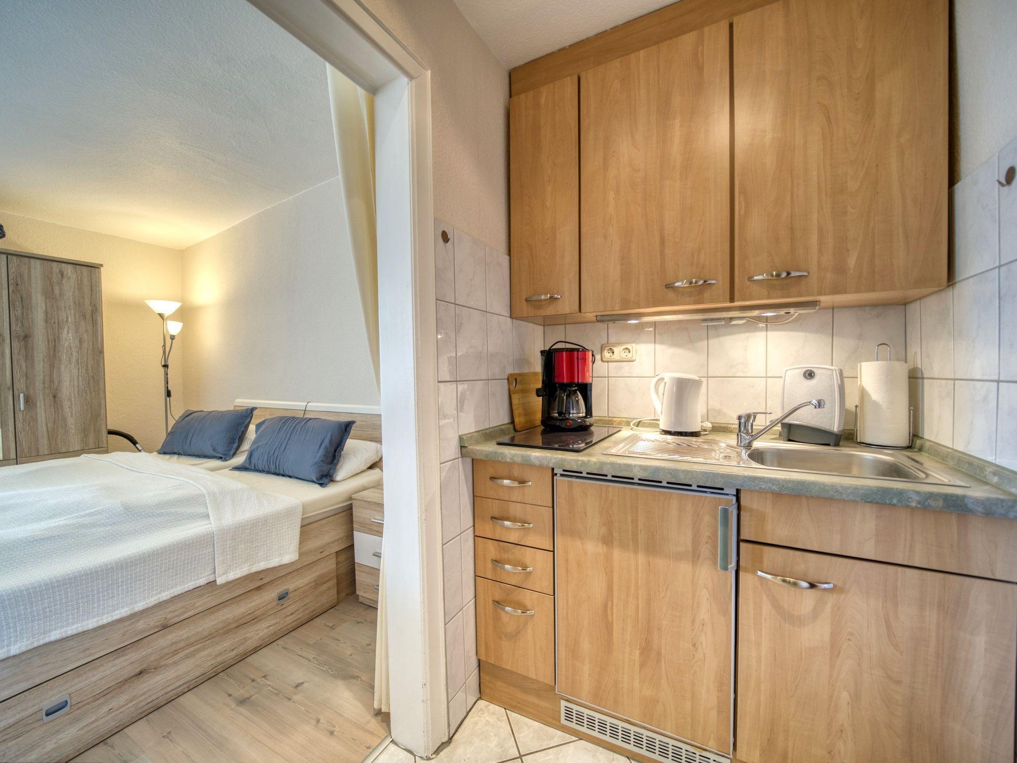 Pantryküche im Eingangsbereich mit Ceranherd, Filterkaffeemaschine, Kühlschrank, Mikrowelle, Wasserkocher und Toaster