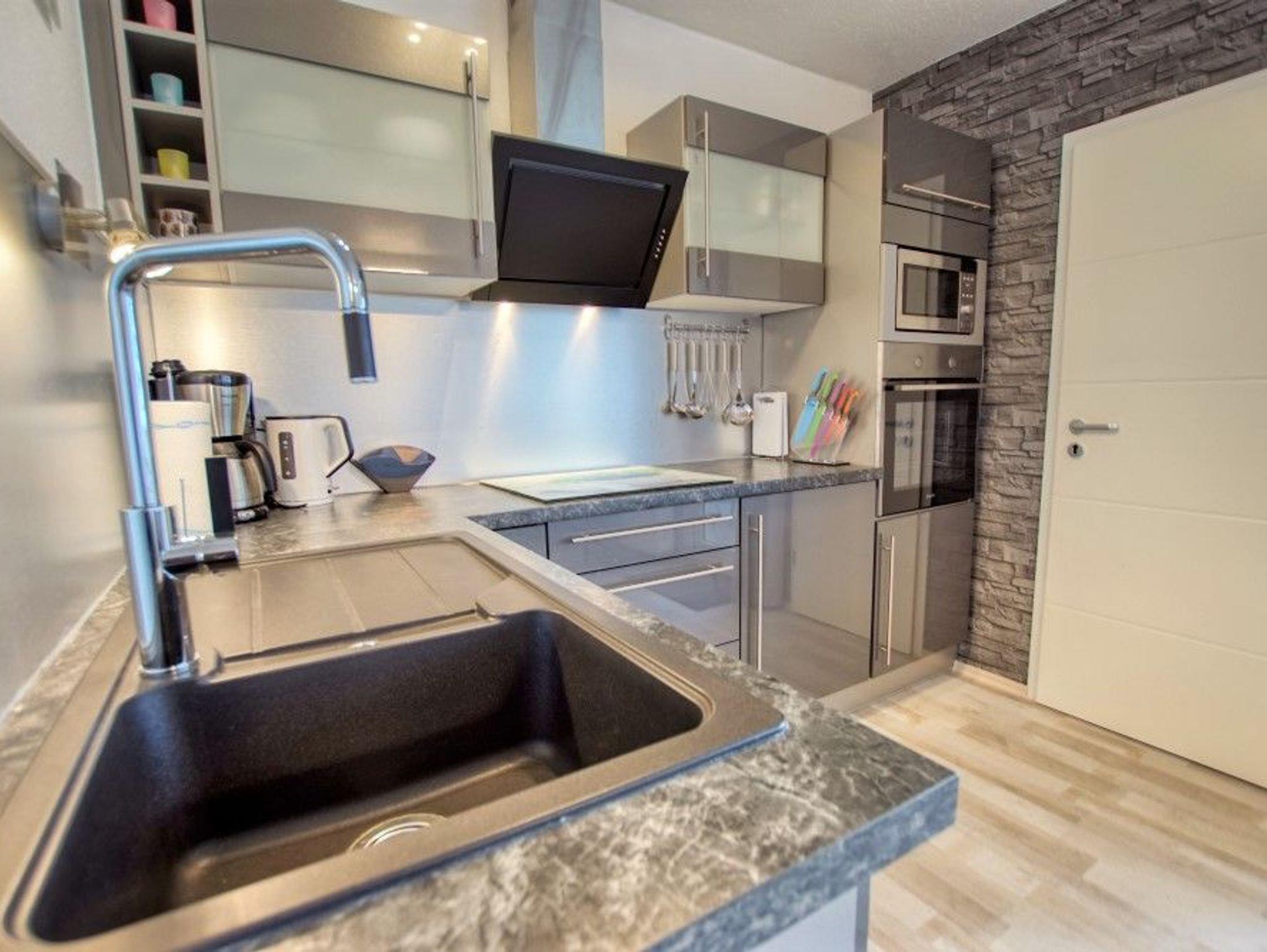 Küche mit Backofen, 4-Platten-Ceranfeld, Kühlschrank mit Gefrierfach, Mikrowelle, Kaffeemaschine, Wasserkocher und Toaster