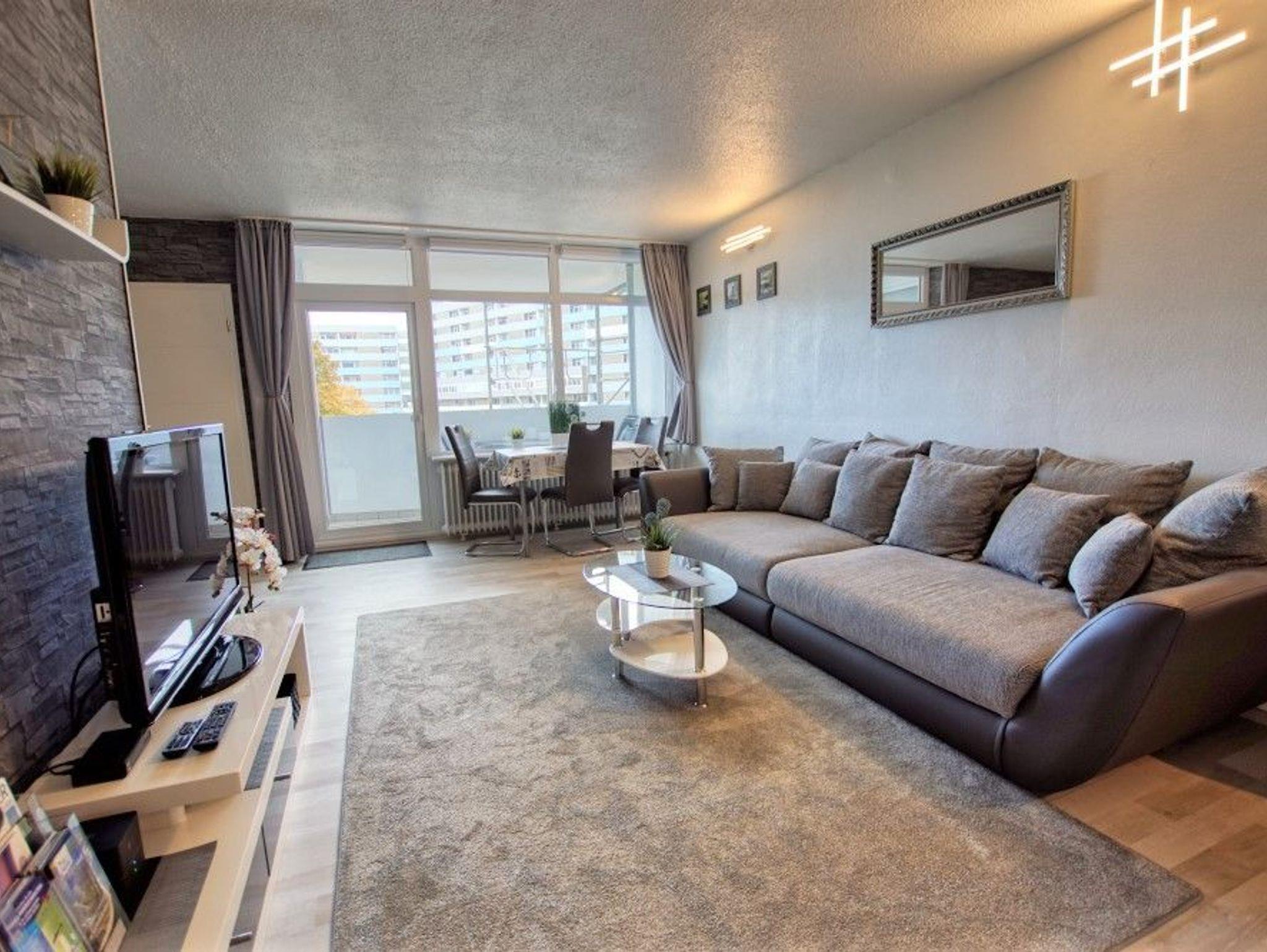 Großzügige Couch und Flachbildfernseher mit DVD-Player im Wohnbereich