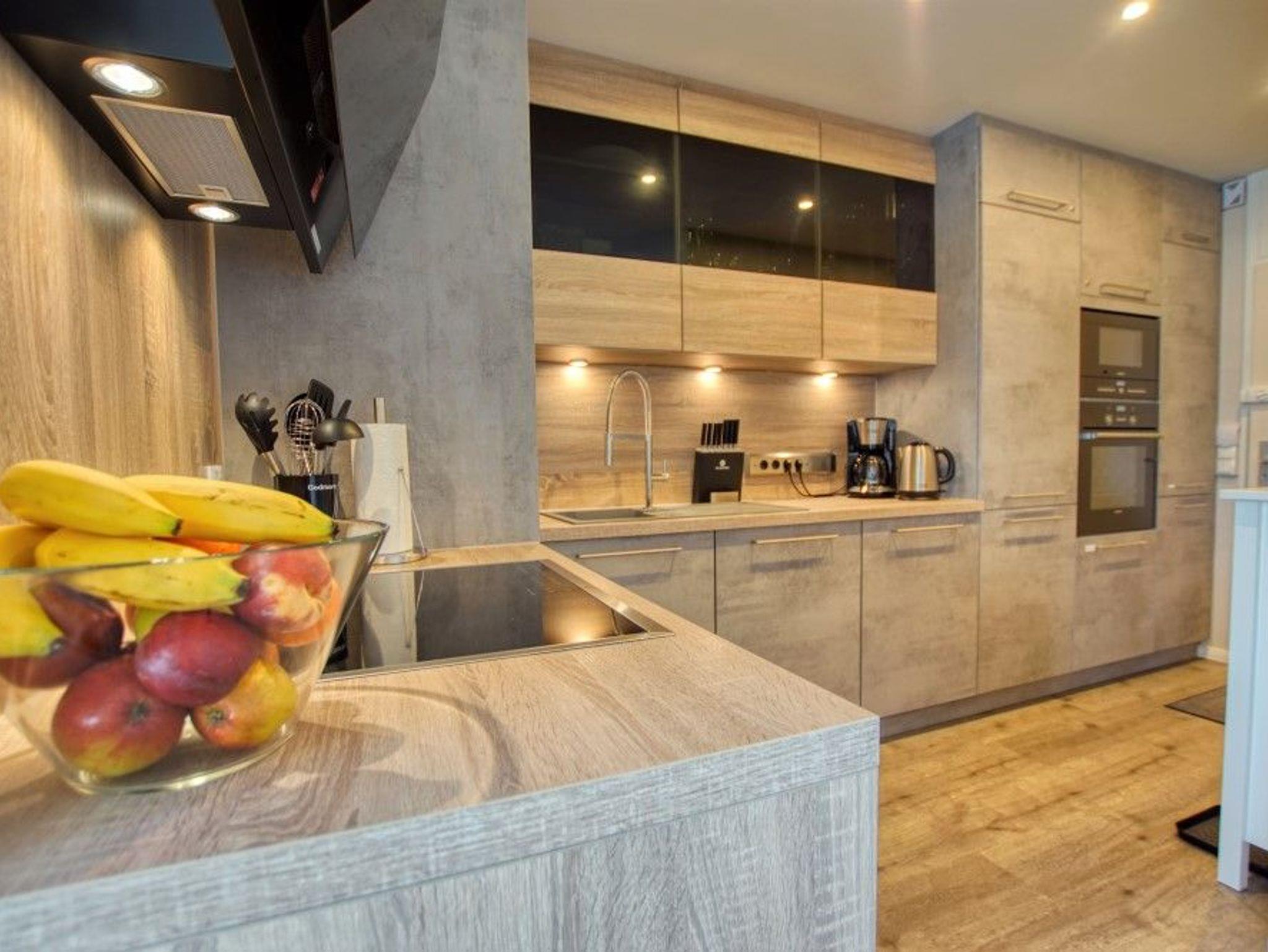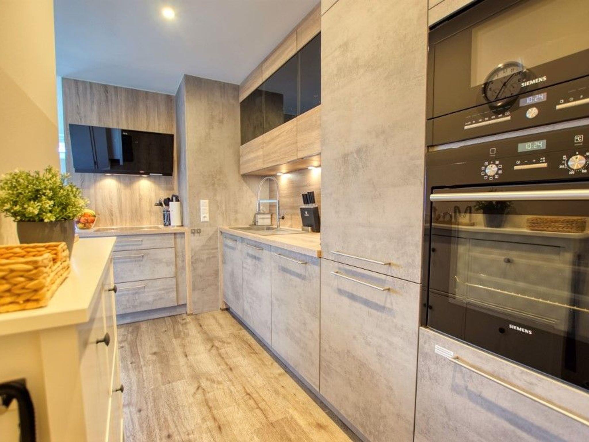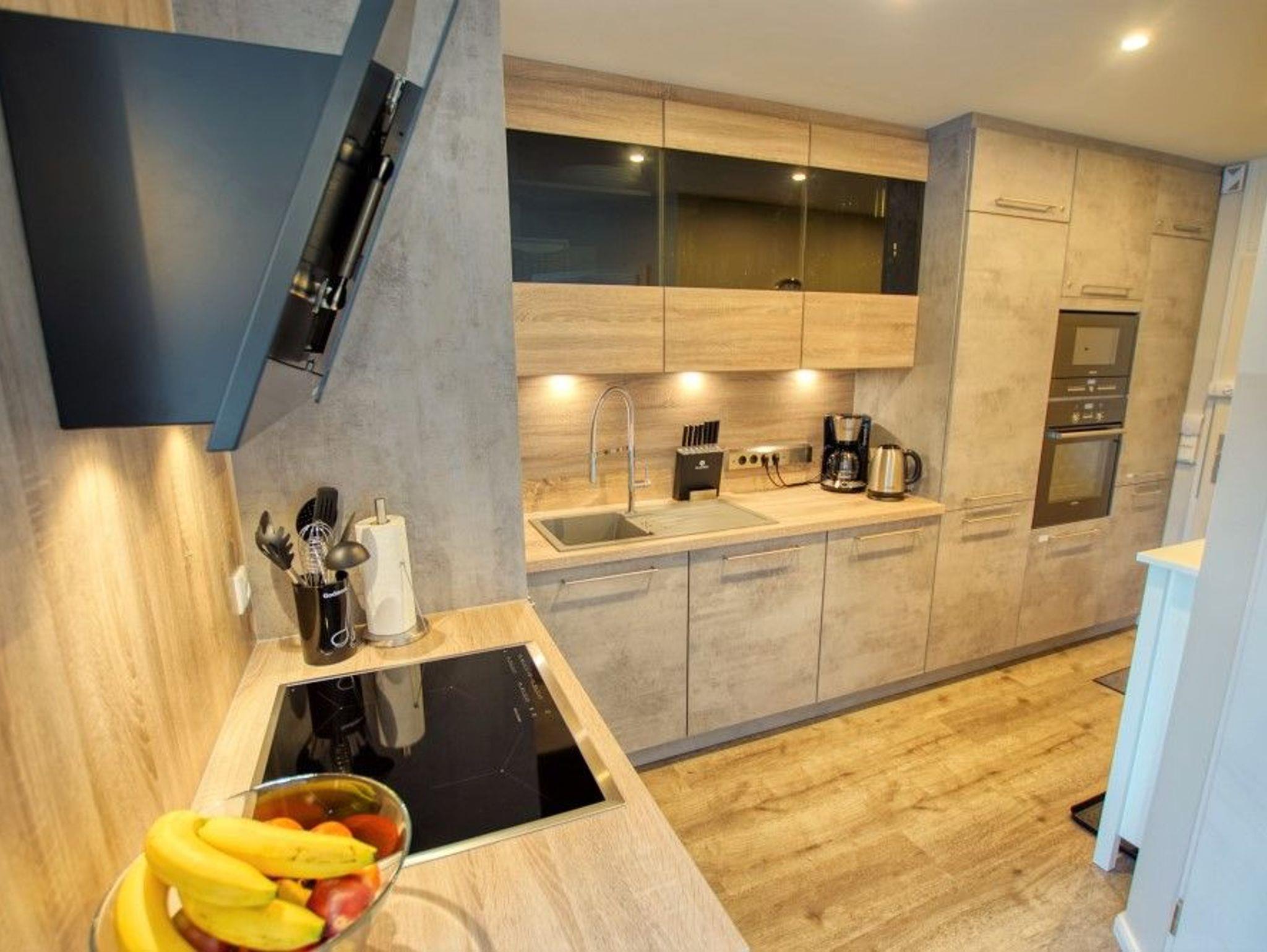 Küche im Eingangsbereich mit Induktionskochfeld (Hob²Hood-Funktion), Spülmaschine, Backofen, Mikrowelle, Kühlschrank mit Gefrierfach, Kaffeemaschine, Wasserkocher und Toaster