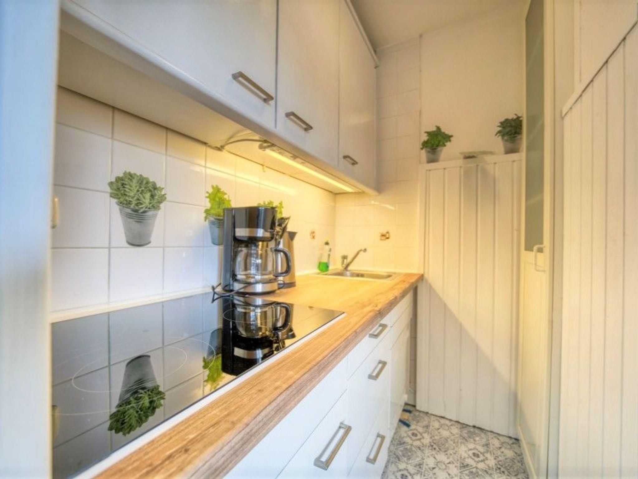 Küche mit Ceranherd, Kühlschrank mit Gefrierfach, Geschirrspüler, Mikrowelle, Toaster, Filterkaffeemaschine und Wasserkocher