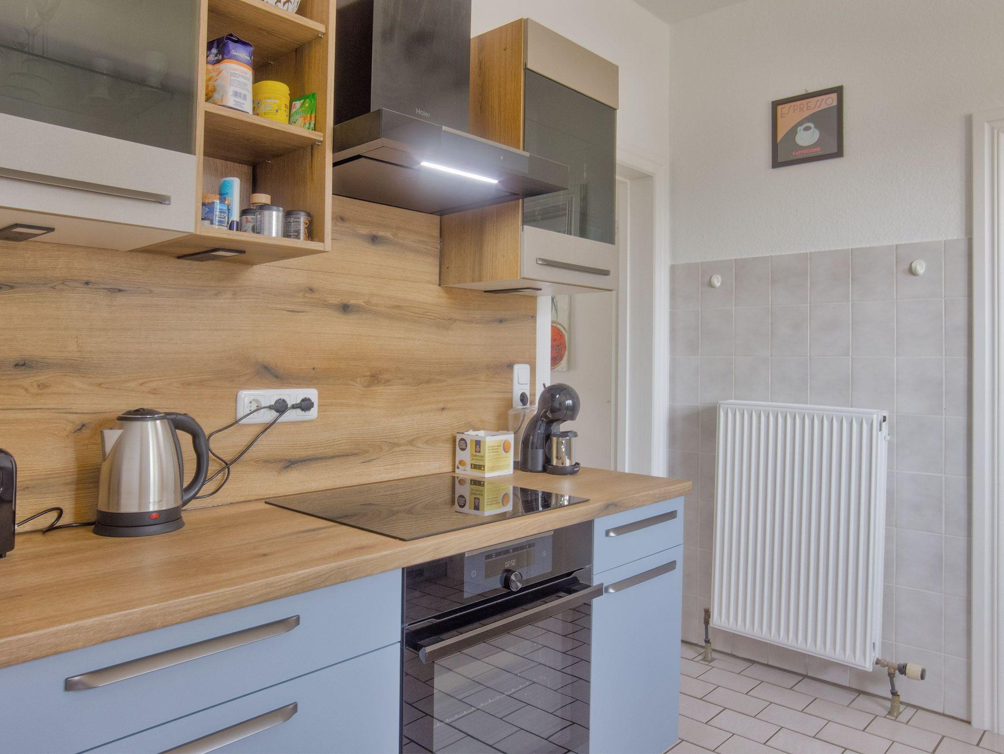 Die neue Komfortküche ist modern und durchdacht gestaltet und bietet Ihnen alle Annehmlichkeiten für eine sorgenfreie Selbstversorgung. Im kleinen Abstellraum nebenan ist zudem eine Waschmaschine und ein Trockner verfügbar.