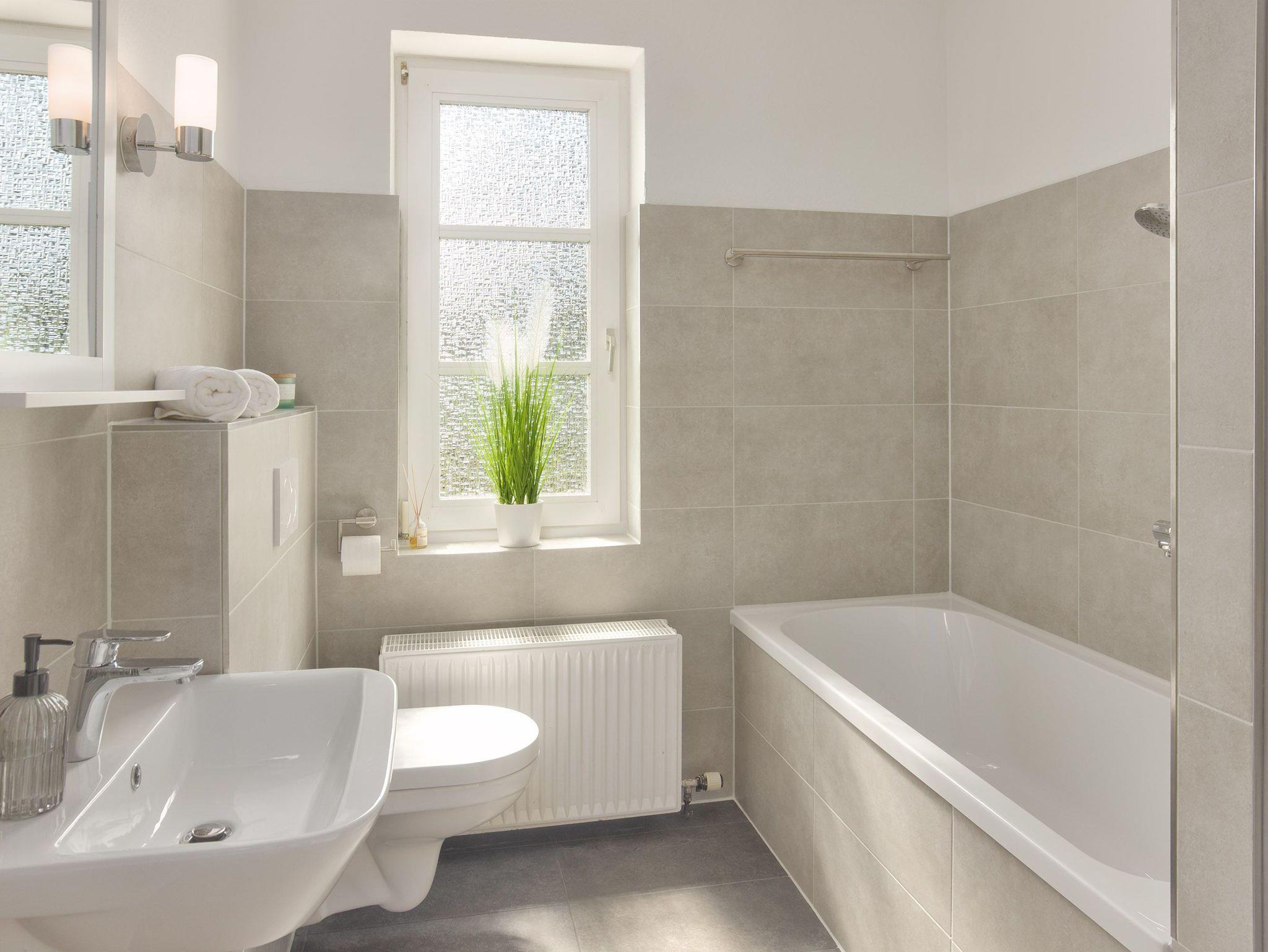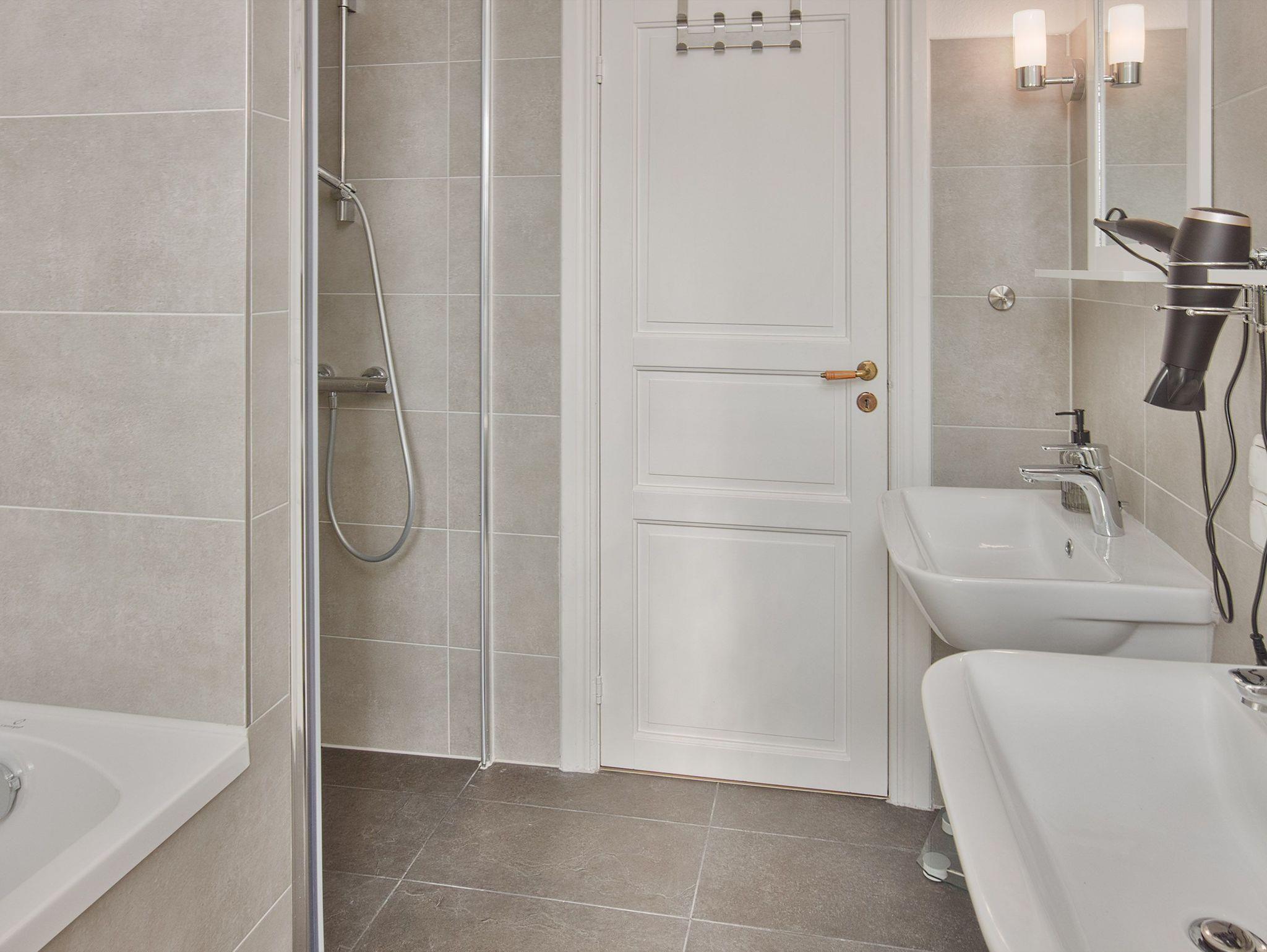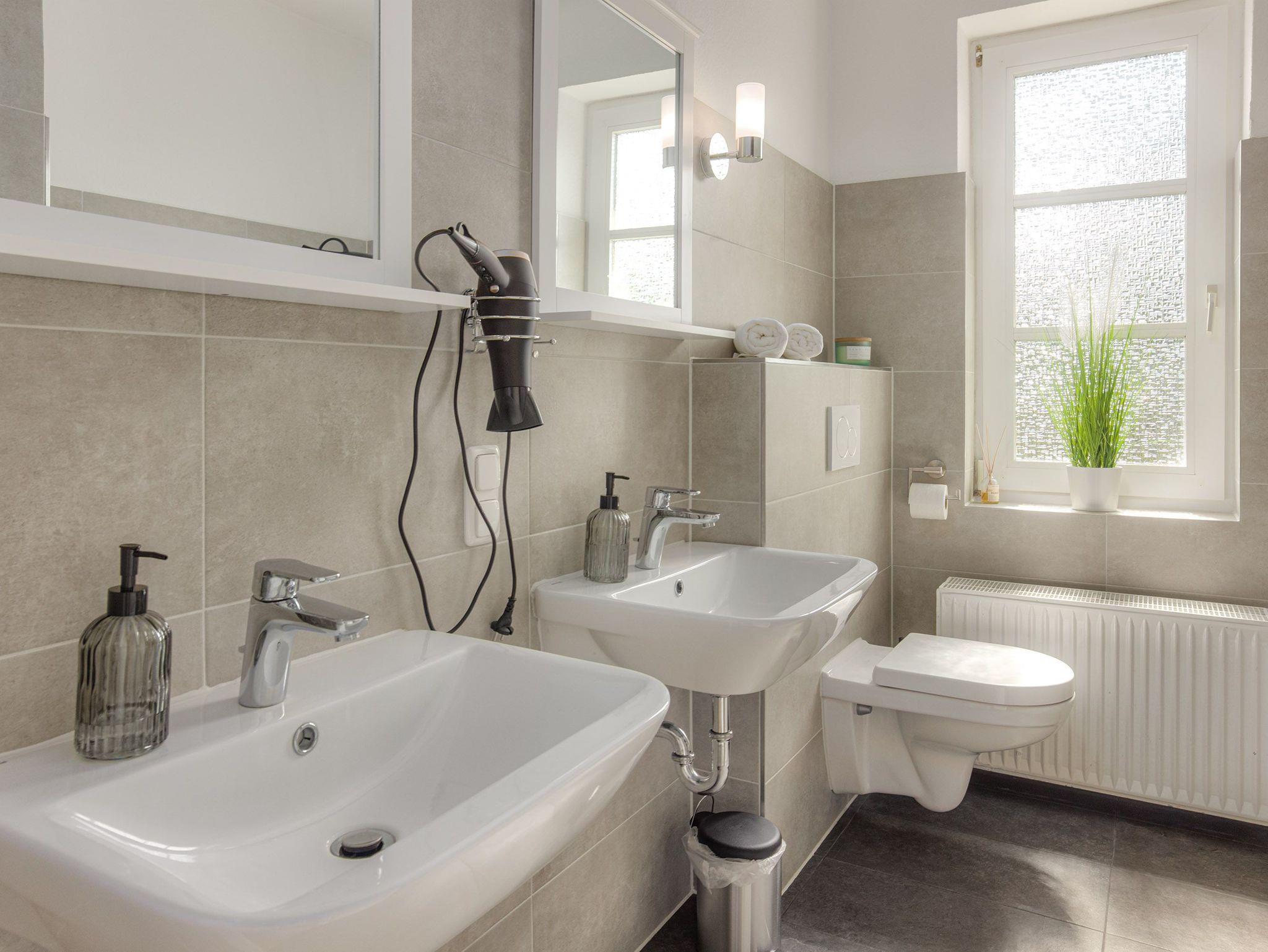 Das gut geschnittene, moderne Duschbad direkt neben den Schlafzimmern sorgt für weitere Bequemlichkeit. Die ebenerdige Dusche, Wanne, WC, Waschbecken und Spiegel runden den Raum ab. Ein separates Gäste-WC ist ebenfalls vorhanden.