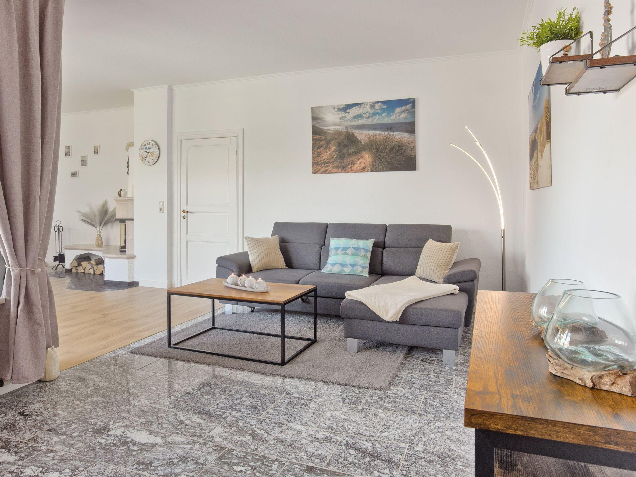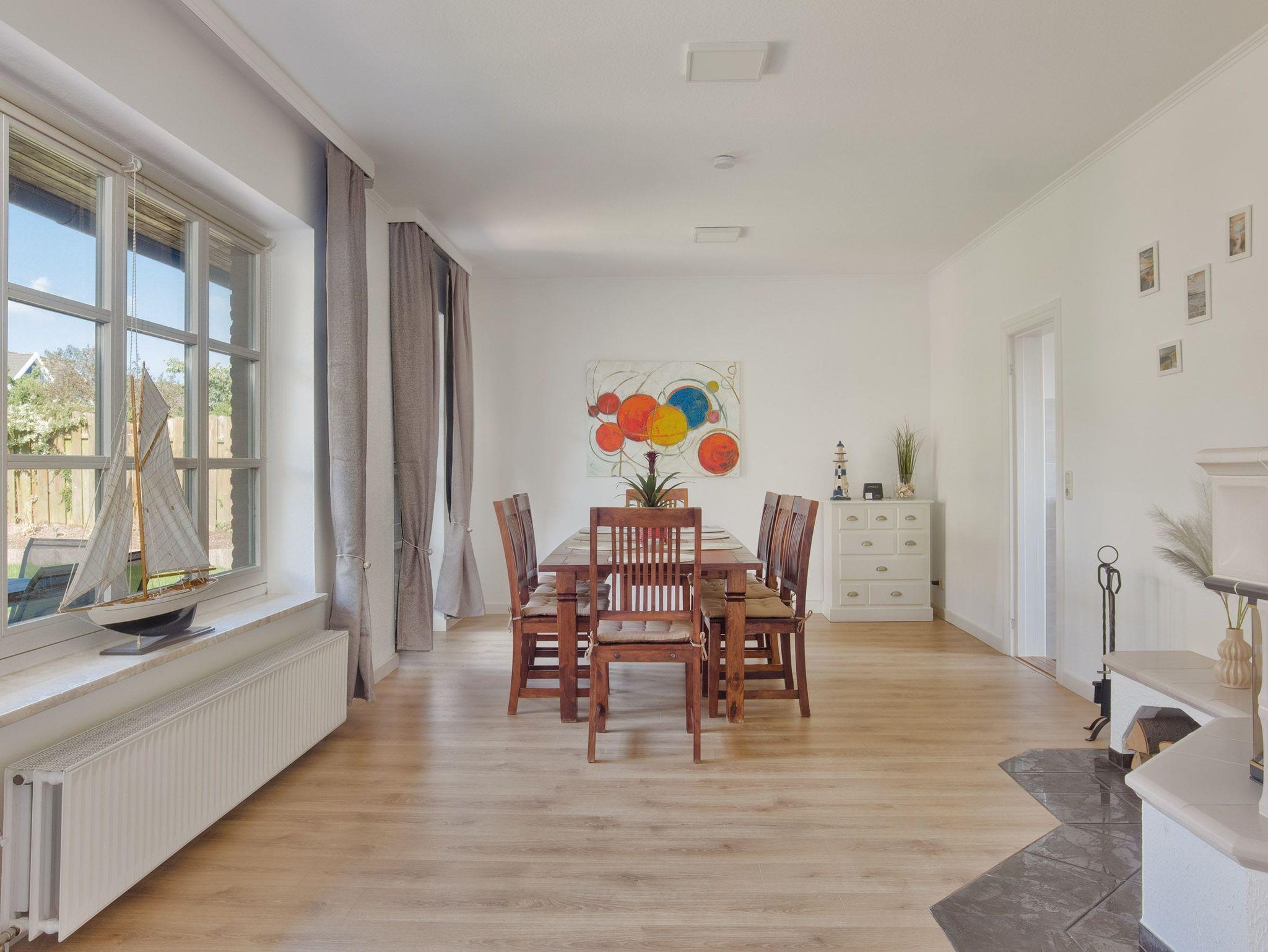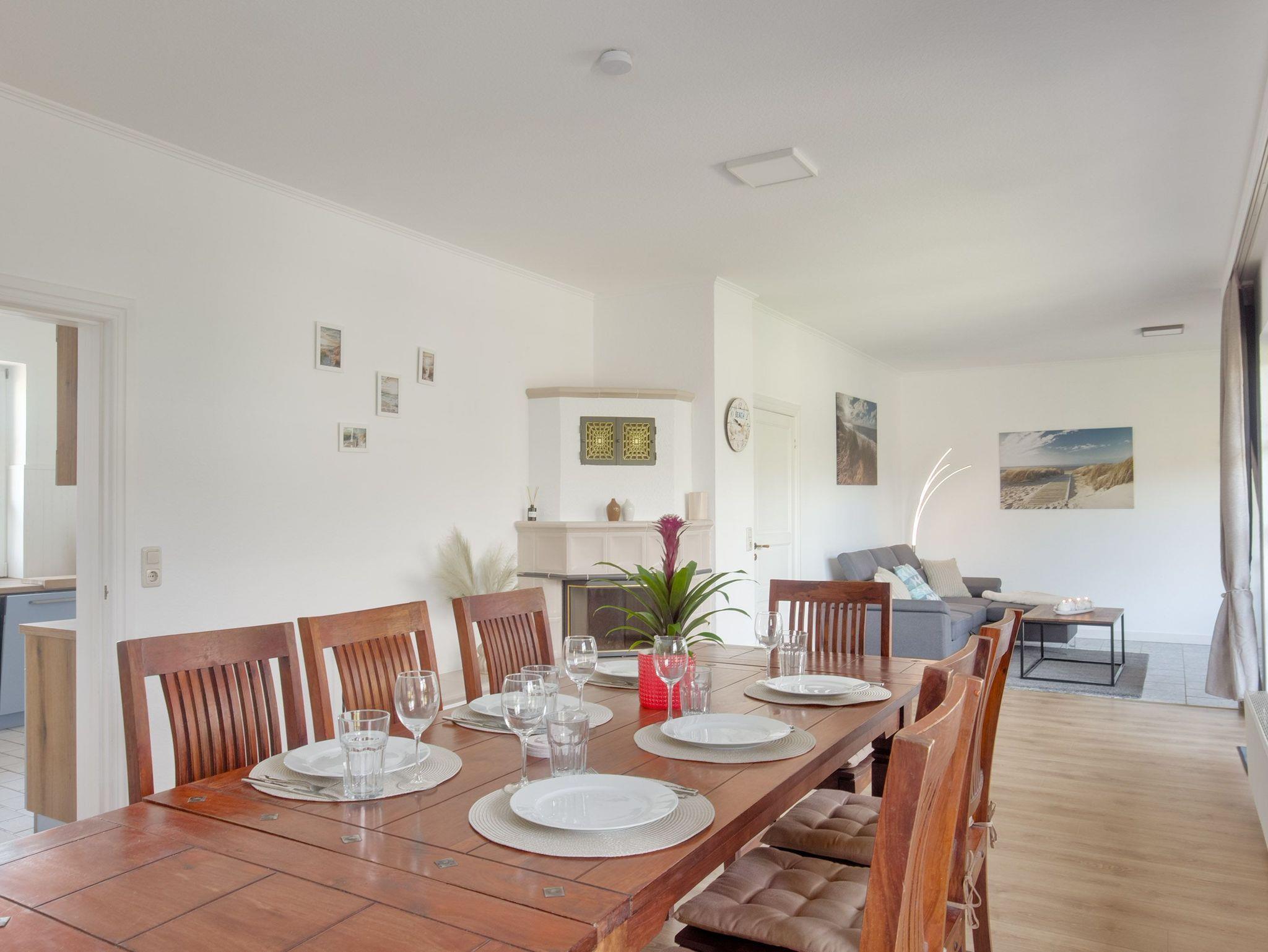 Herzstück ist der einladende Wohn- und Essbereich. Hier kann auf der gemütlichen Couch entspannt werden oder Sie genießen gesellige Stunden am großen Esstisch. Naturtöne und ausgewählte Dekorationen sorgen für ein wunderbar wohnliches Gefühl. Durch die großen Fenster haben Sie dabei einen großzügigen Blick in den Gartenbereich. Unterhaltung bietet Streaming-TV (WaipuTV) und mit dem WLAN / WiFi können Sie auch im Urlaub bequem online bleiben.