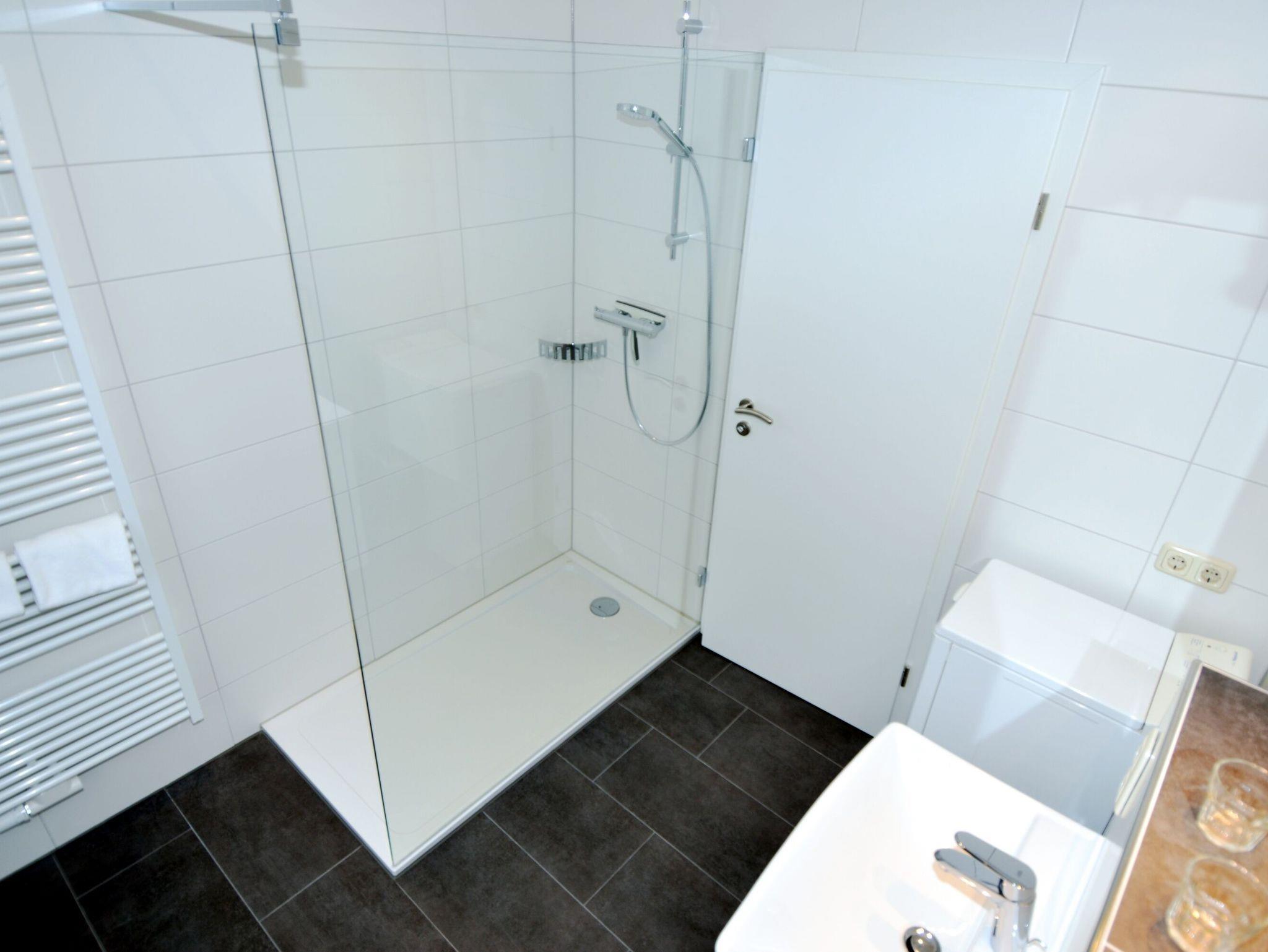 Das separate Schlafzimmer ist mit einem komfortablen Doppelbett, einem Kleiderschrank und einem TV ausgestattet. Das große Tageslicht-Bad verfügt über eine Waschmaschine, ein WC und eine ebenerdige Dusche.