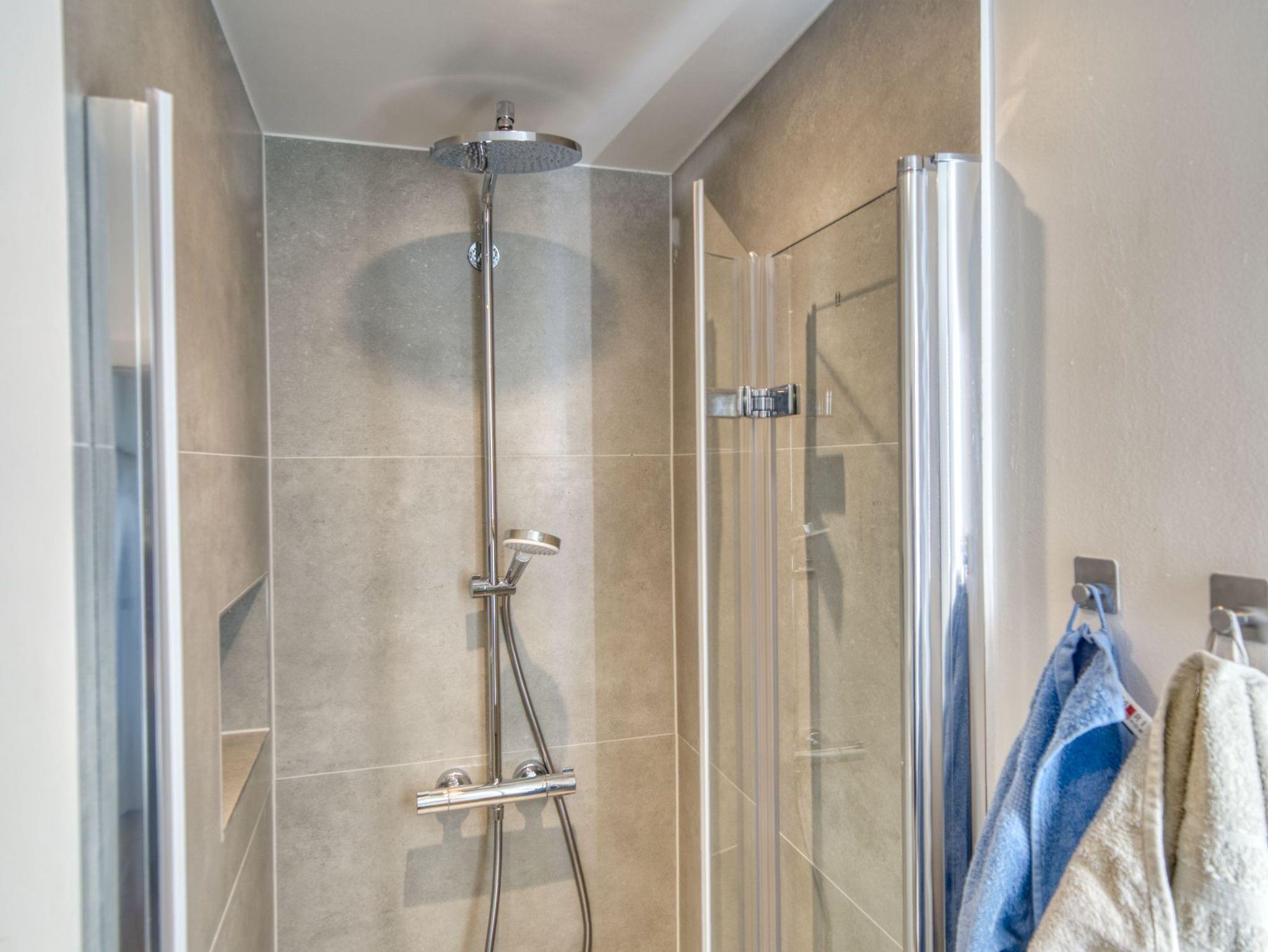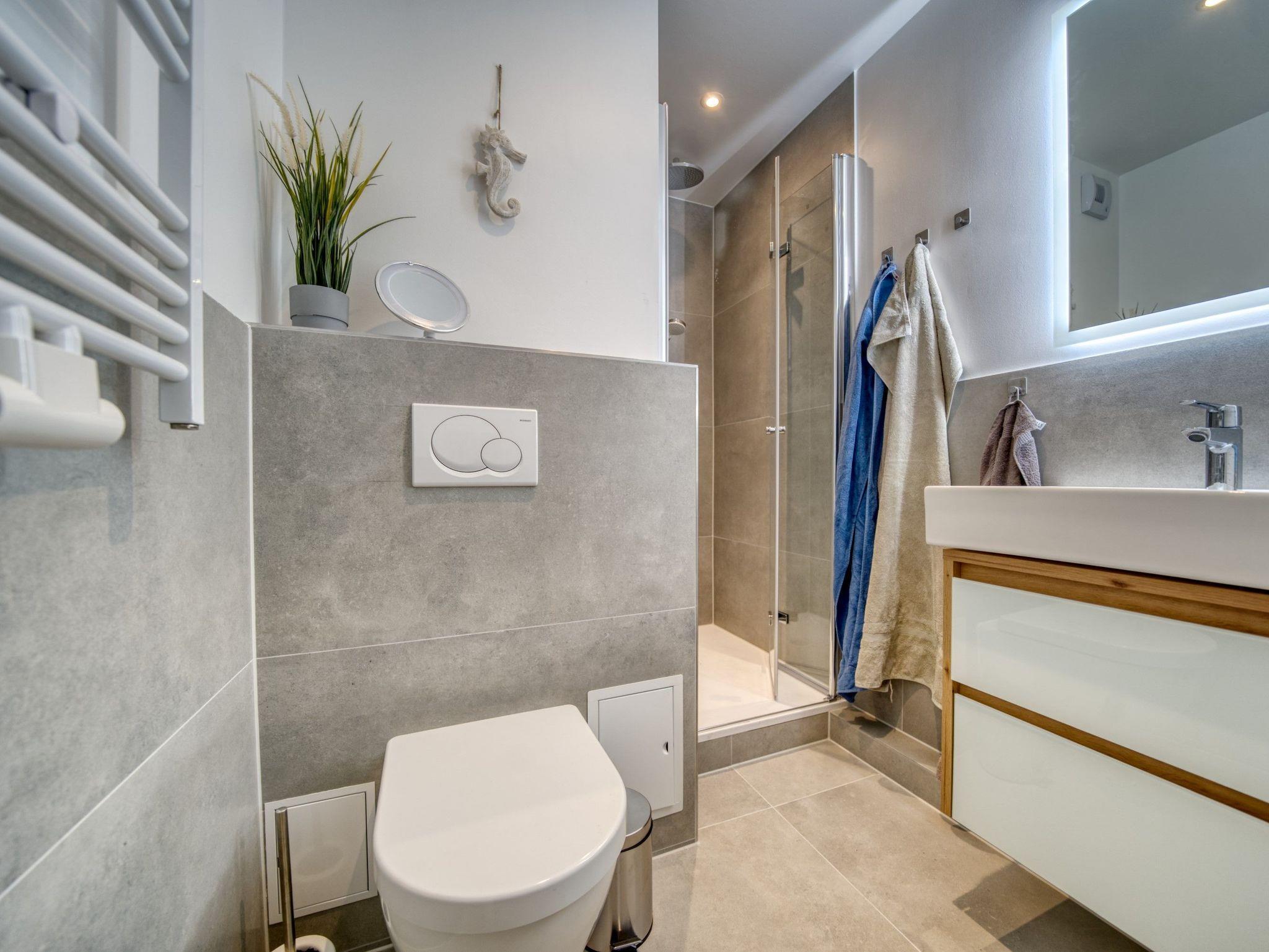 Modernes Badezimmer mit großzügiger Dusche und neuwertiger Ausstattung