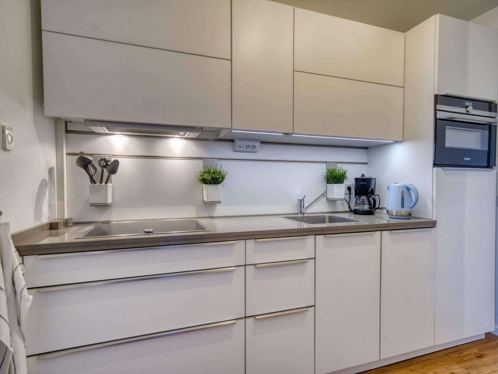 Hochwertig ausgestattete Küche mit Spülmaschine, Backofen mit integrierter Mikrowelle, Induktionsherd, Toaster, Kühlschrank mit Gefrierfach und Kaffeemaschine