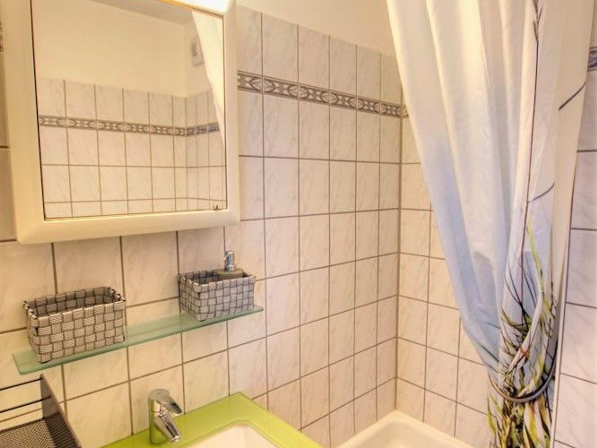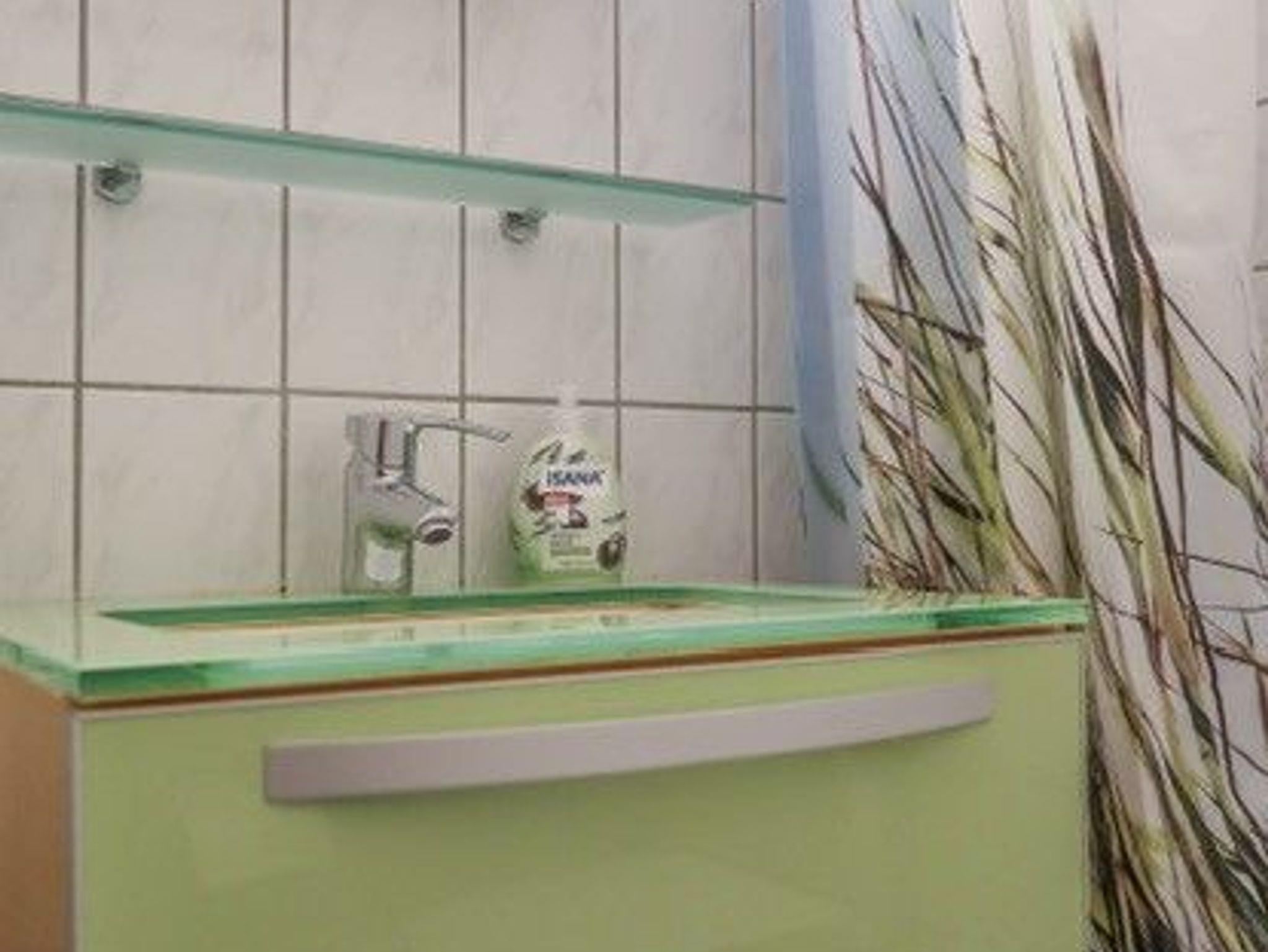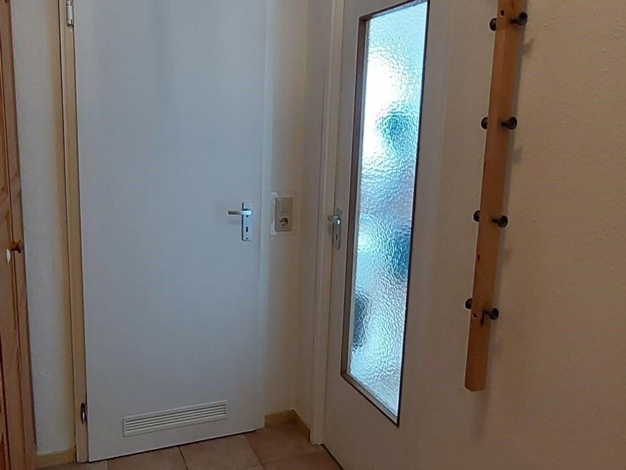 Im Bad befindet sich eine Dusche (leicht erhöhter Einstieg), Föhn, Waschtisch, Kosmetikspiegel und WC. Im Flur befindet sich ein Schrank mit Strandutensilien (Zeltmuschel, Schwimmbrett), Wäscheständer, Putzutensilien, Schirm etc.