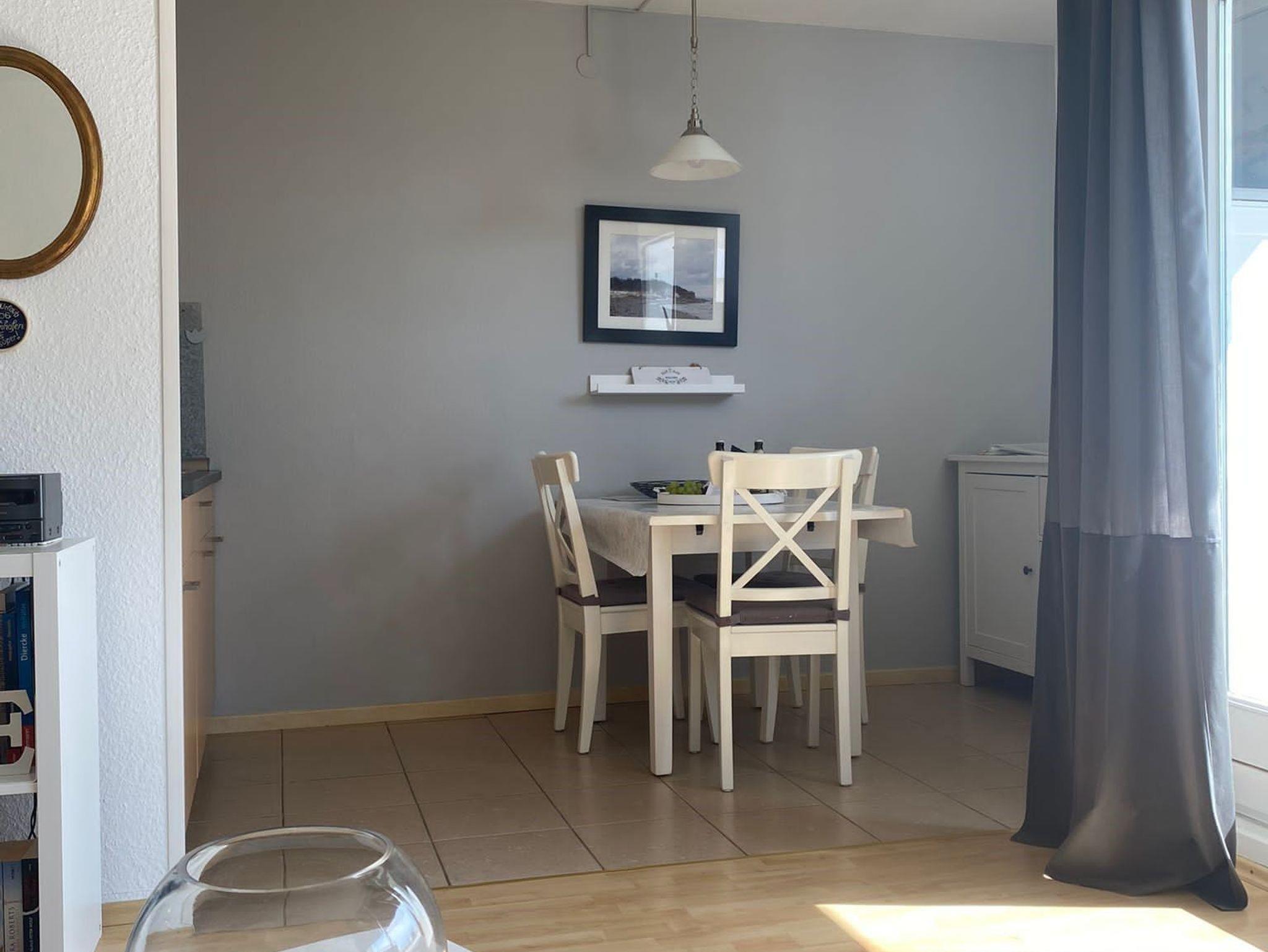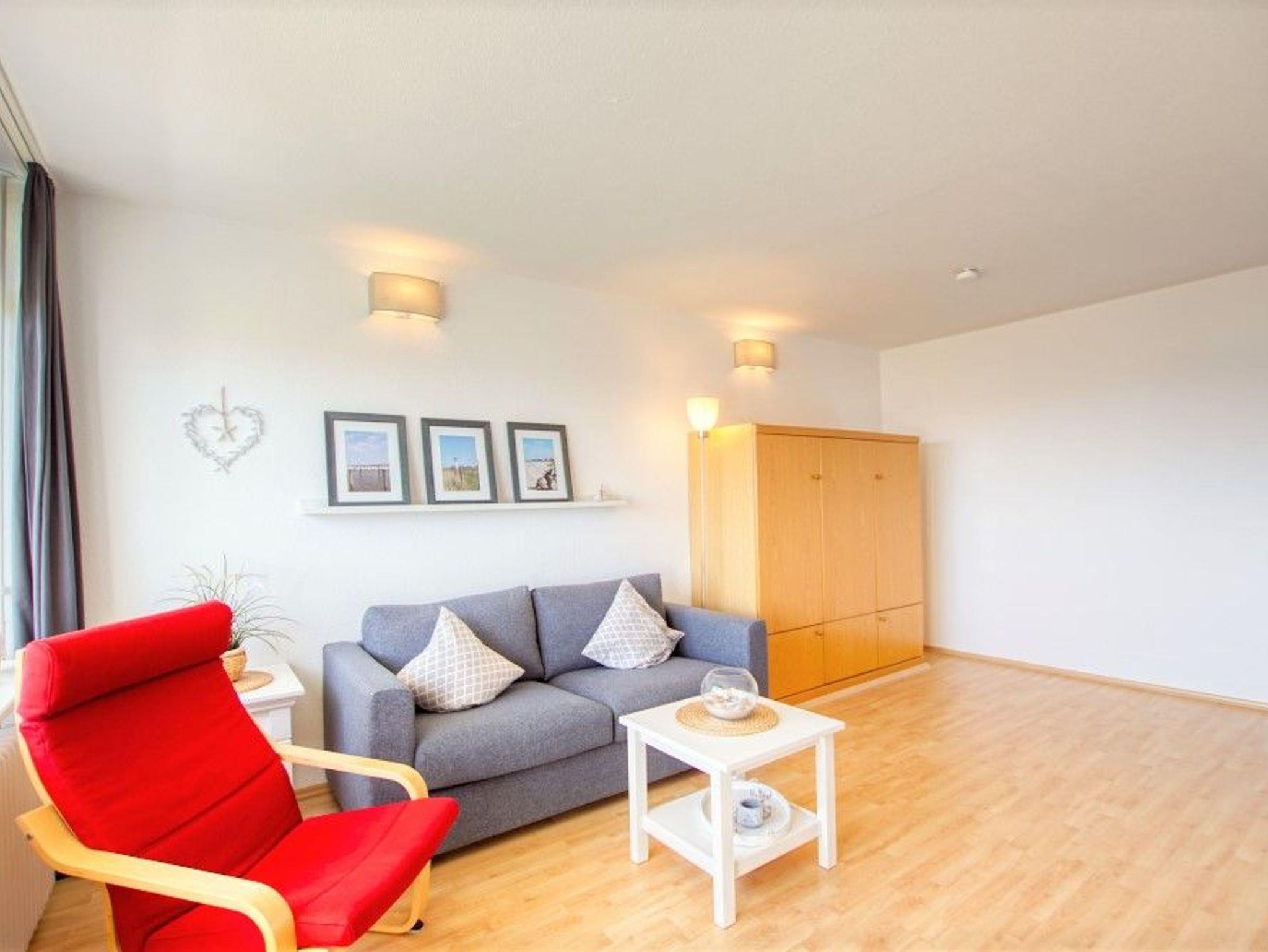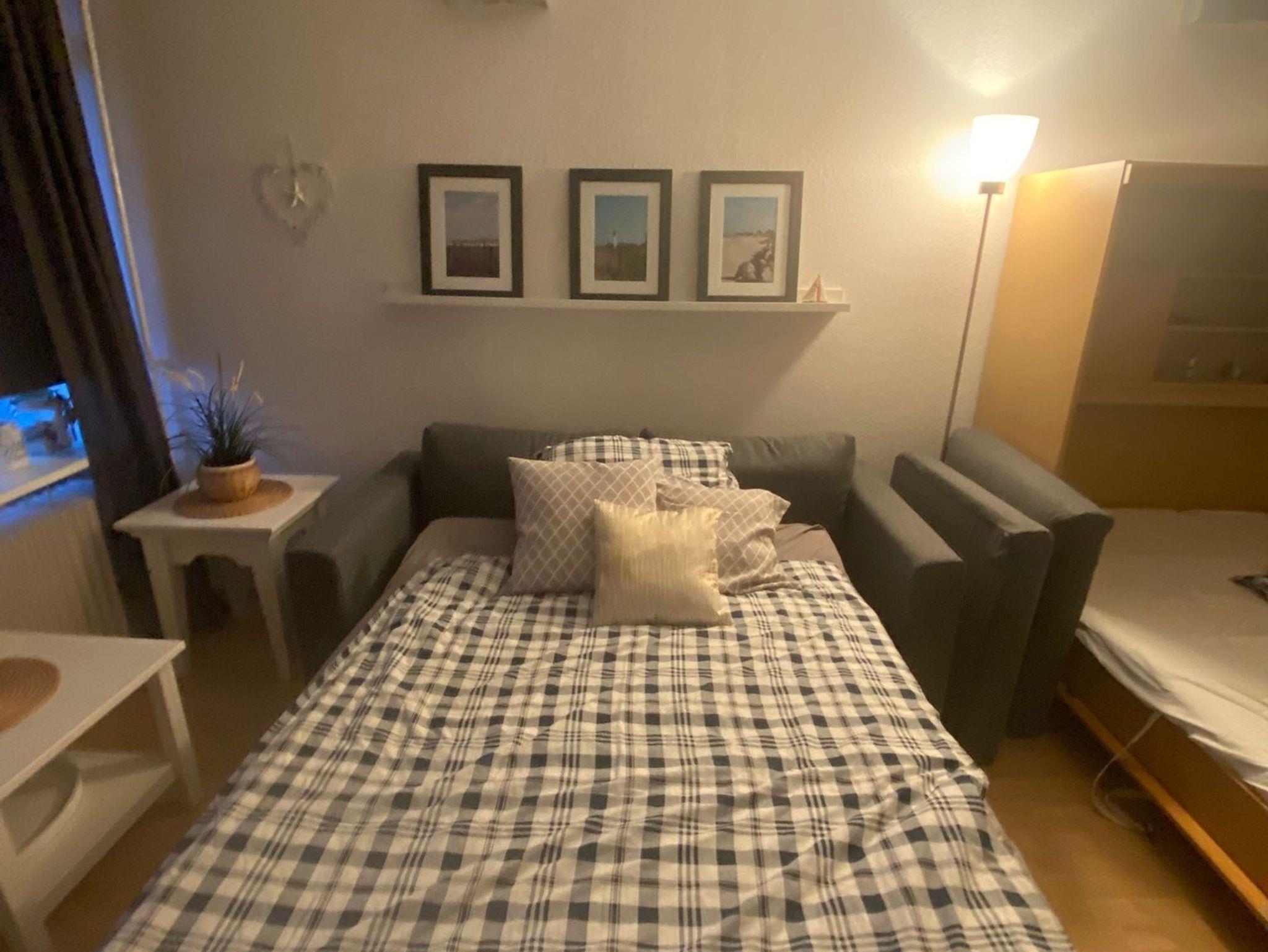 Die sehr hell und freundliche Ferienwohnung im skandinavischen Stil ist ausgestattet mit einem bequemen Doppel-Schrankbett (Maß 1,60 x 2,00), sowie einer gemütlichen Sitzecke mit Schlaf-Couch (Maß 1,40 x 2,00) und Sessel. Der Boden ist in Holzoptik ausgelegt. - Es gibt einen Flachbildfernseher, eine kleine Musikanlage / DVD-Player, Bücher und Spiele für die Unterhaltung zuhause.