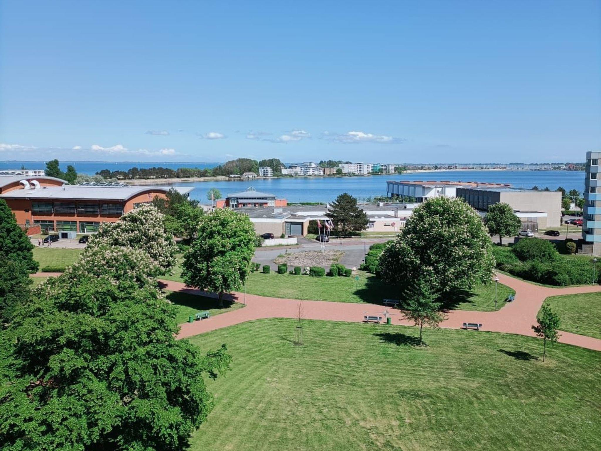 Die Wohnung liegt im Haus G des Ferienparkes, in der 6. Etage mit einem Balkon zur Ostseite, der einen herrlichen Panoramablick auf die Ostsee in Richtung der Fehmarnsundbrücke und den Binnensee mit Stadt und Yachthafen bietet.